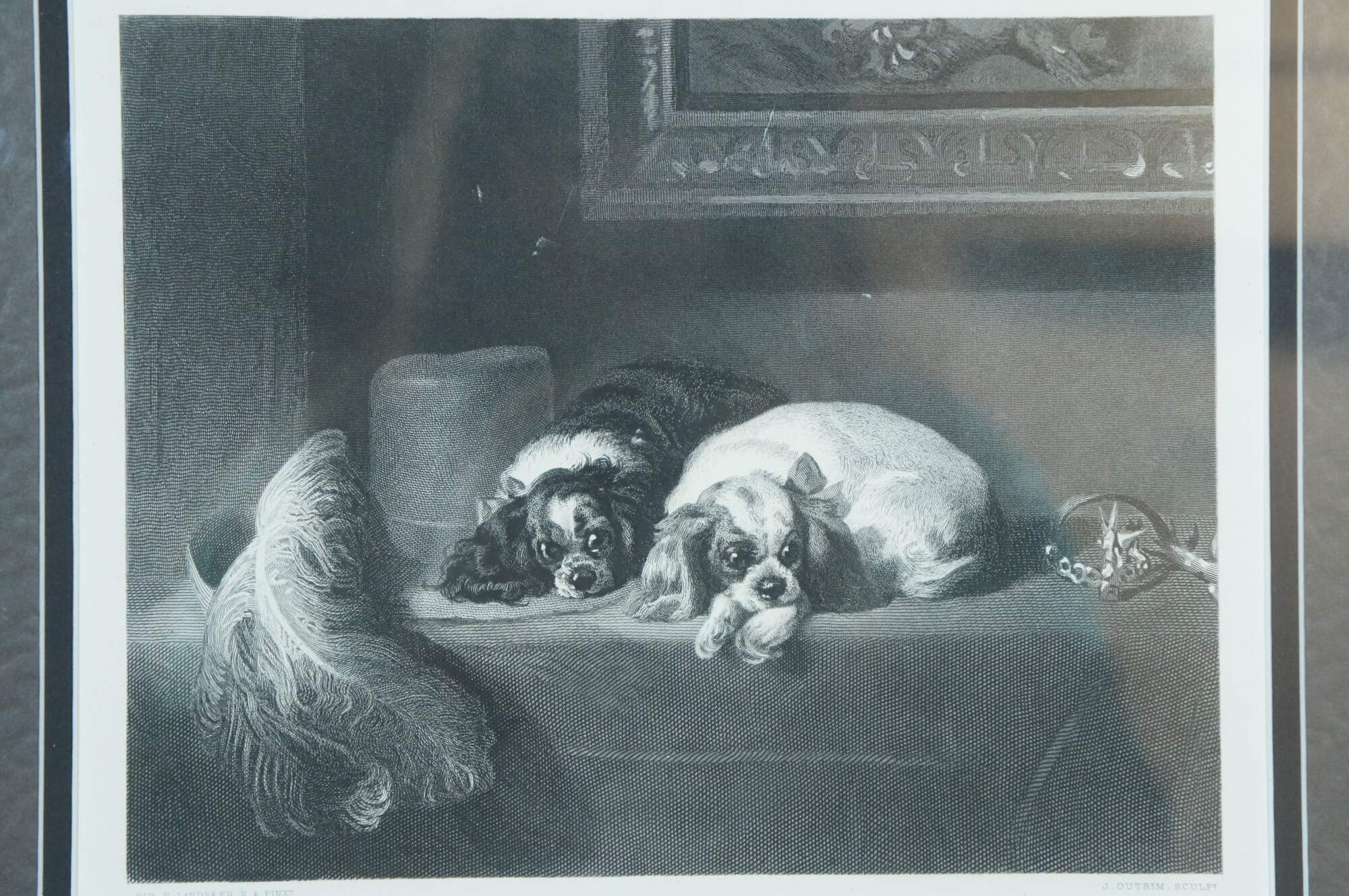 Pair of late 19th century engravings from works by Sir Edwin Landseer - "Comical Dogs," showing a pair of Scottish terriers dresssed in their owners hats, engraved by Charles George Lewis, and "The Cavalier's Pets," showing a pair of King Charles spaniels laying on a bench or table with their master's hat and spurs, engraved by J. Outrim. Dark painted wood frame; textured gray and black layered mat.