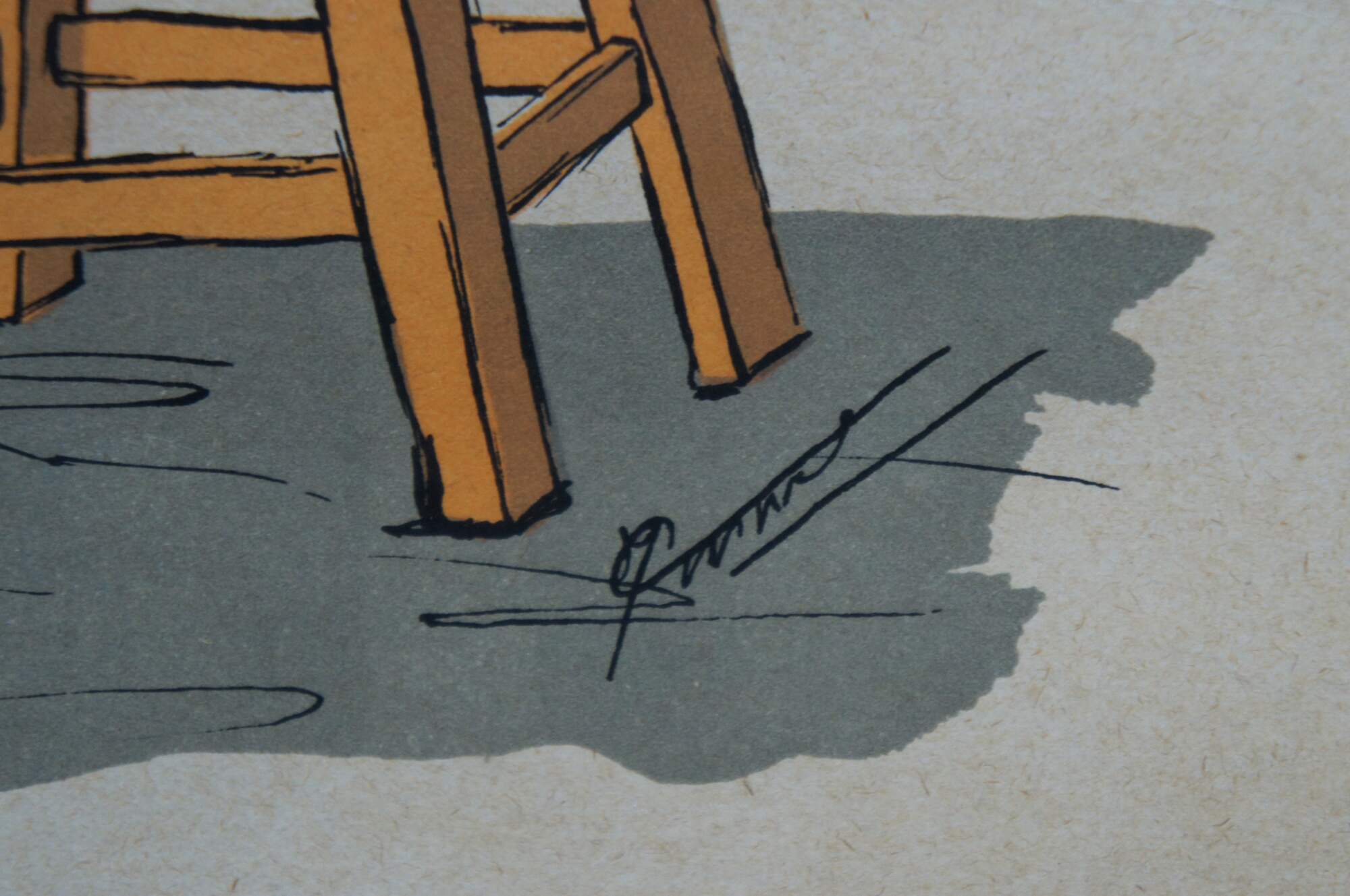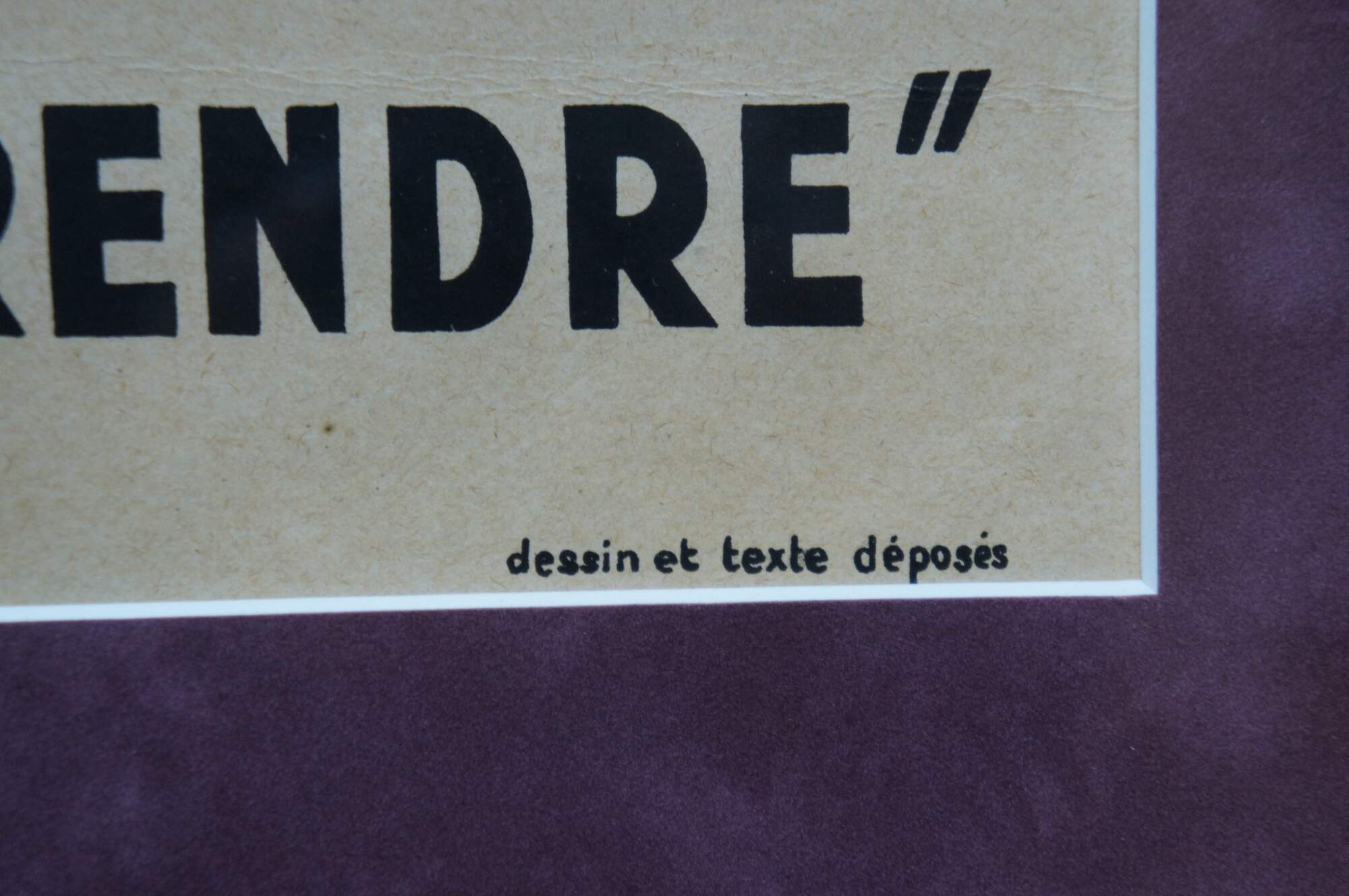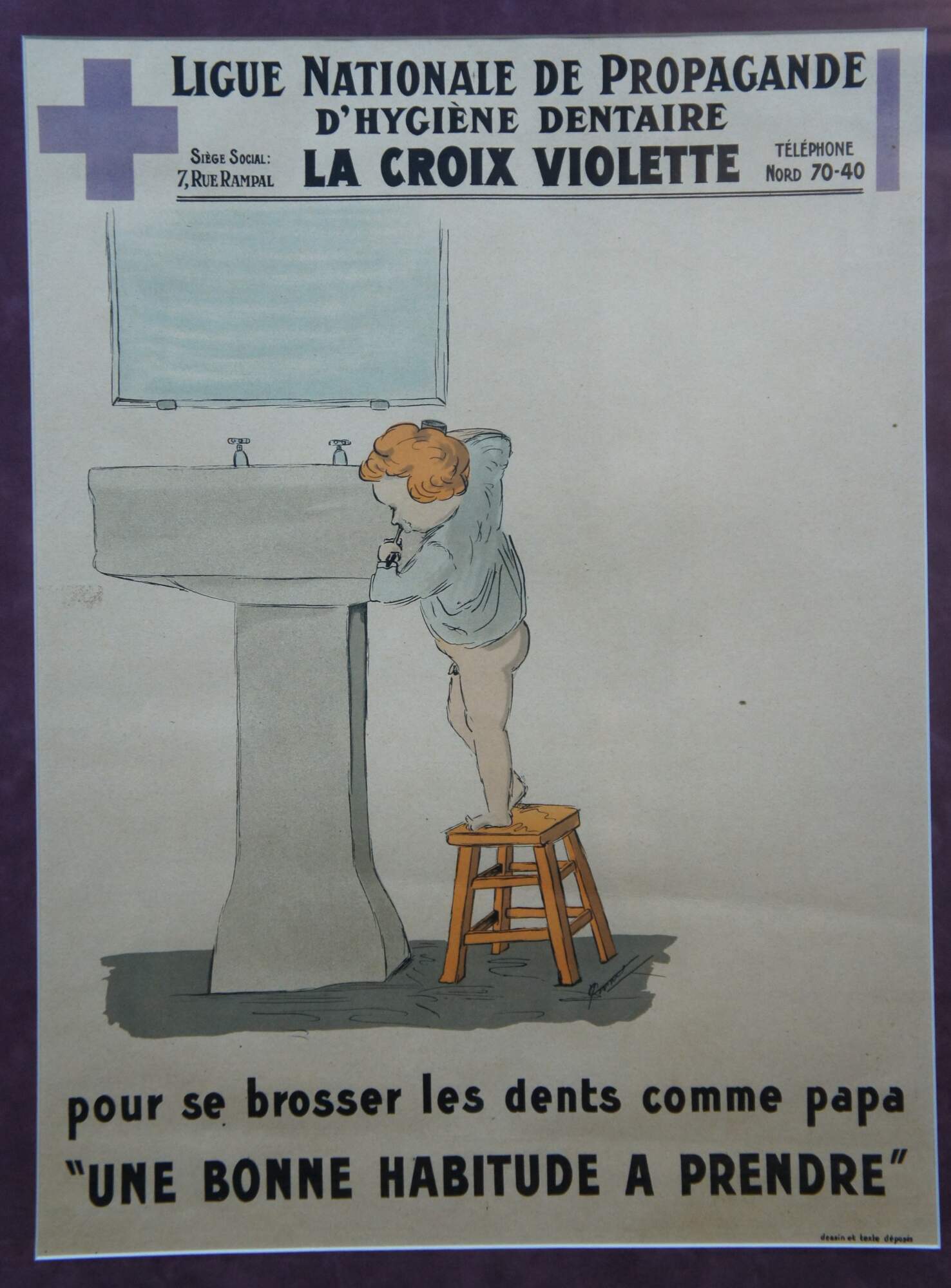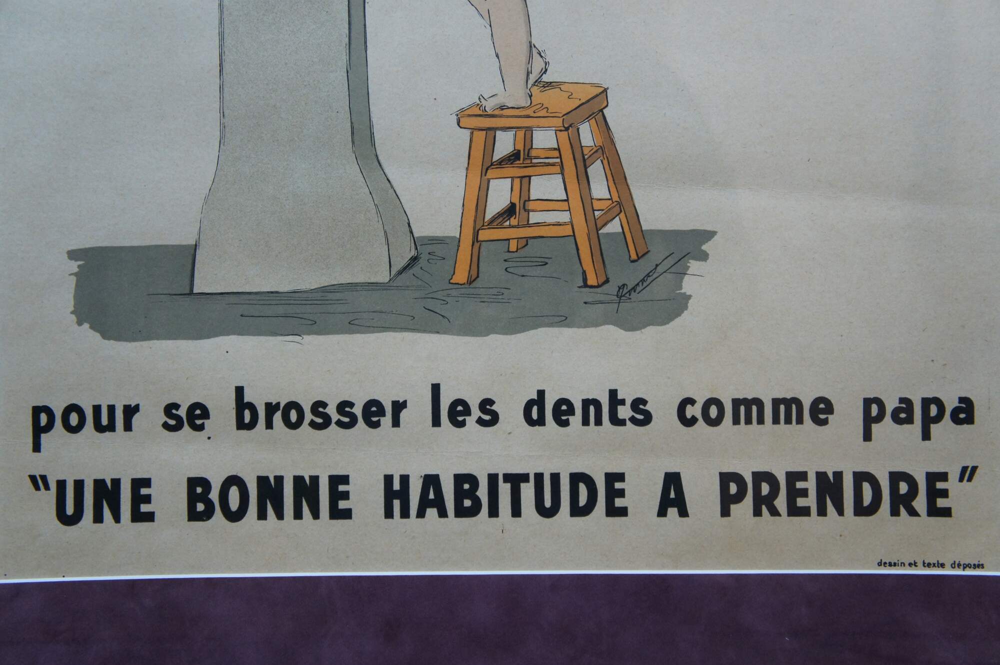 Circa 1930s French dental hygiene poster from the Ligue Nationale de Propagande D'Hygiene Dentaire - La Croix Violette (National Dental Hygiene Propaganda League - The Violet Cross). Shows an illustration of a child brushing their teeth / tooth, standing on a step stool by a sink, over the words "pour se brosser les dents comme papa / "Une Bonne Habitude a Prendre" (to brush your teeth like dad / "A Good Habit to Develop"). Beveled dark wood frame; mottled purple mat.