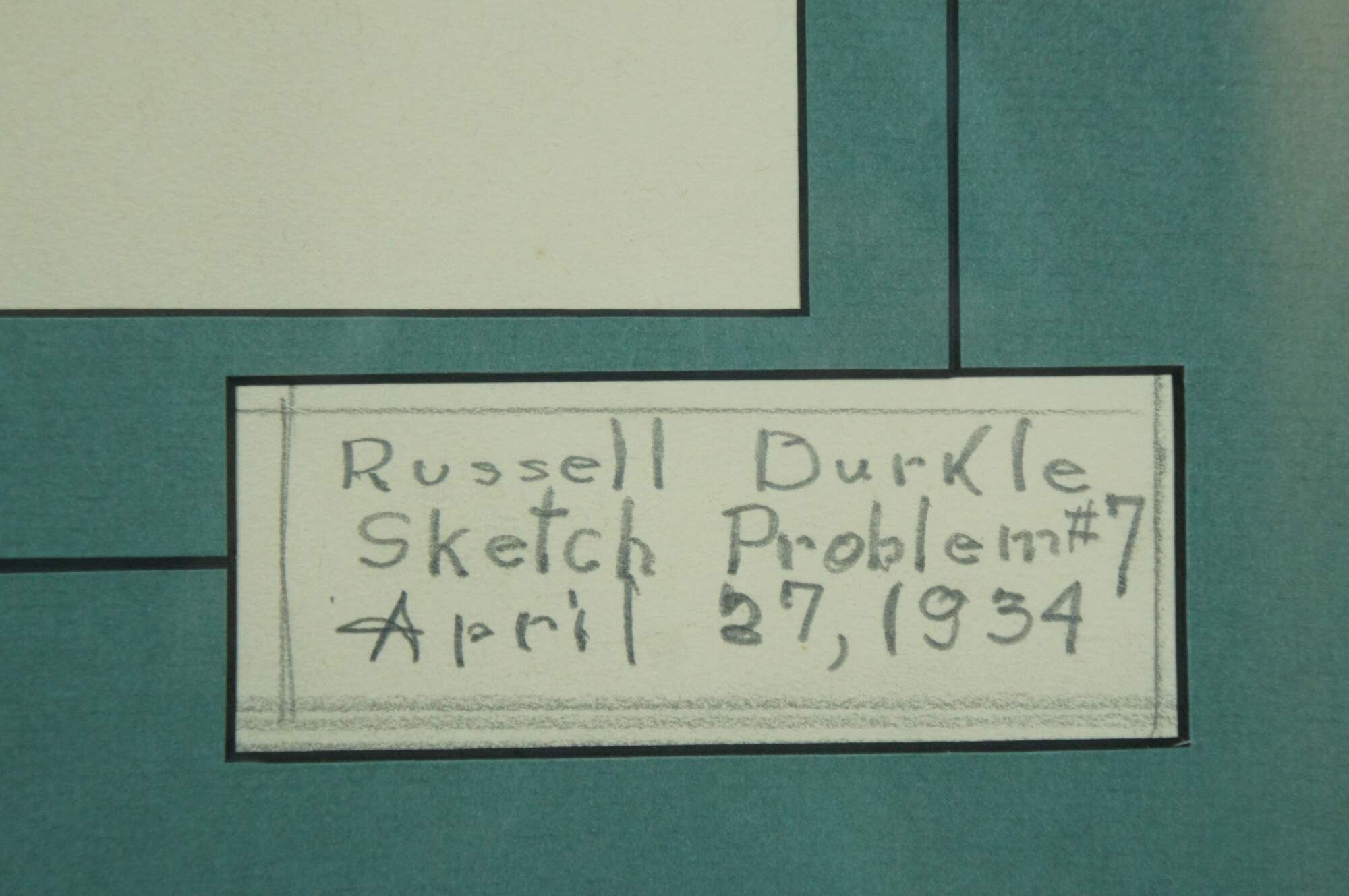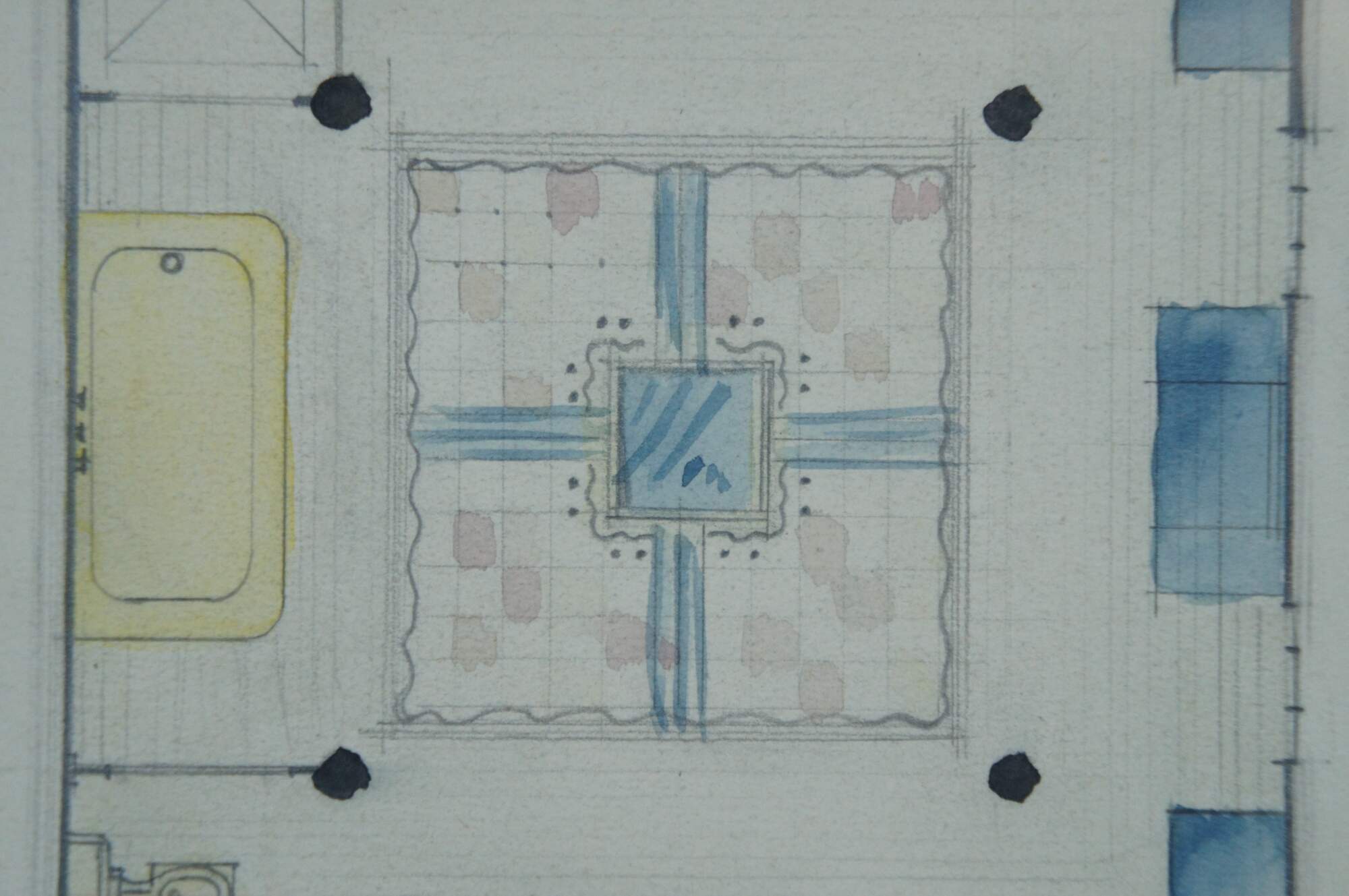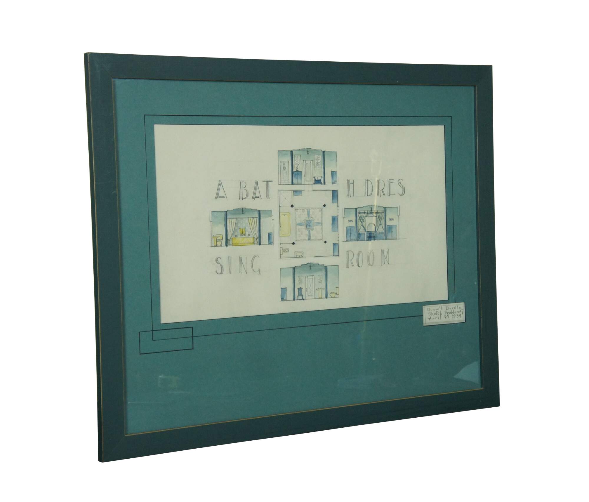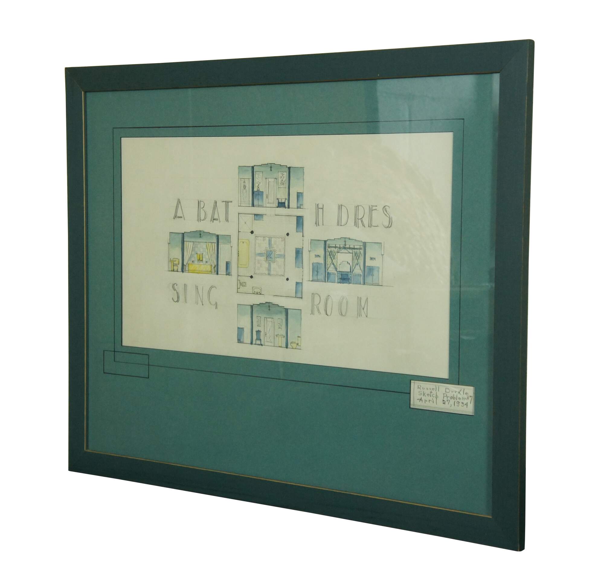 Antique folk art architectural / interior design pencil and watercolor on paper sketch for "A Bath Dressing Room" by Russell Durkle, Sketch Problem #7, April 27, 1934. Features overhead view and four interior views of a design for a full bathroom with space to accomodate a dressing area and vanity table. Teal green painted wood frame; light teal mat.