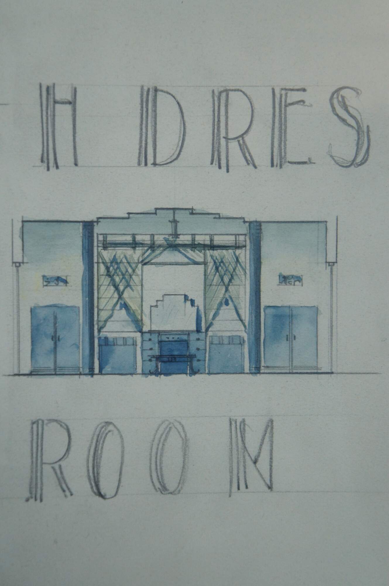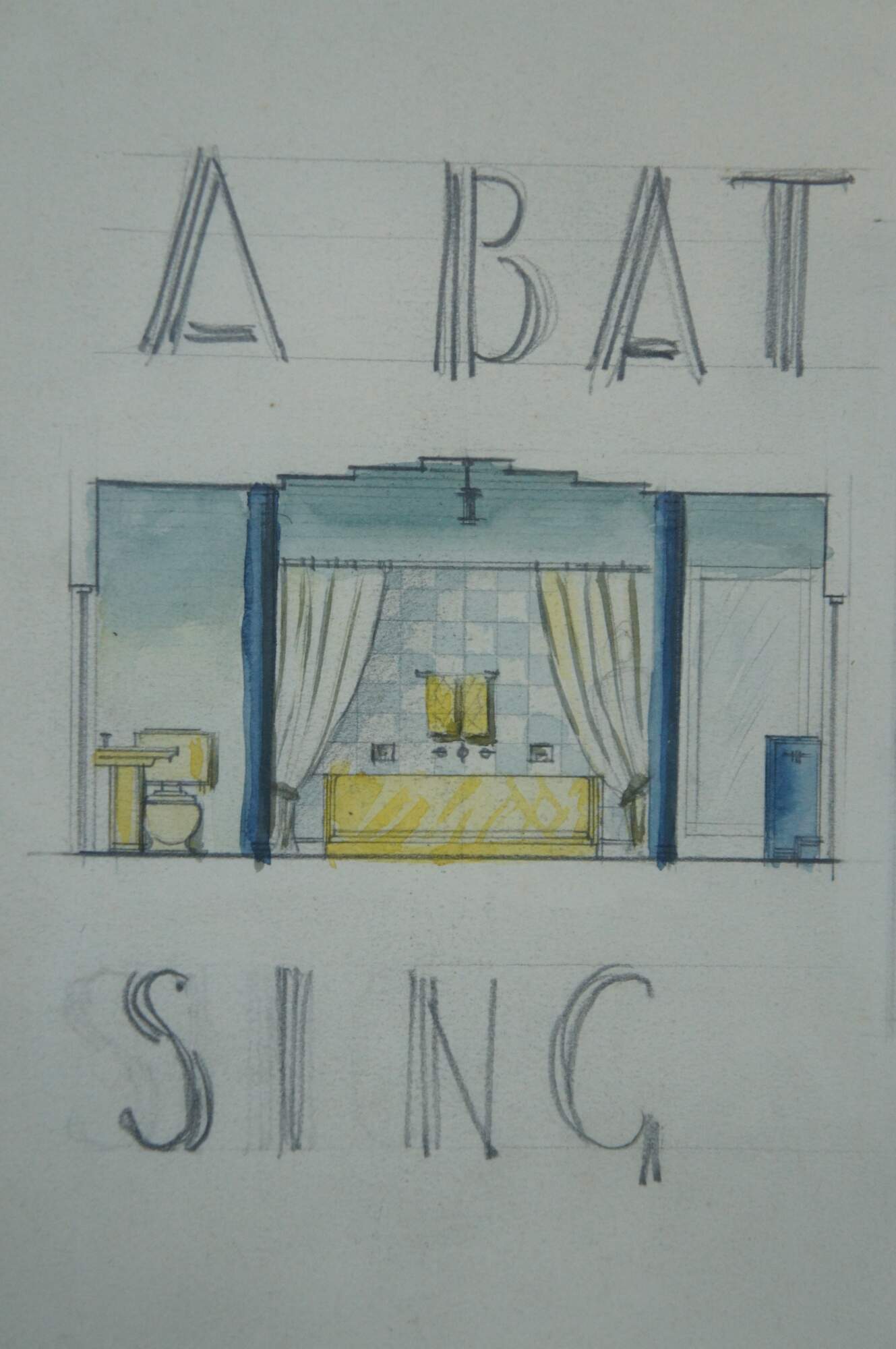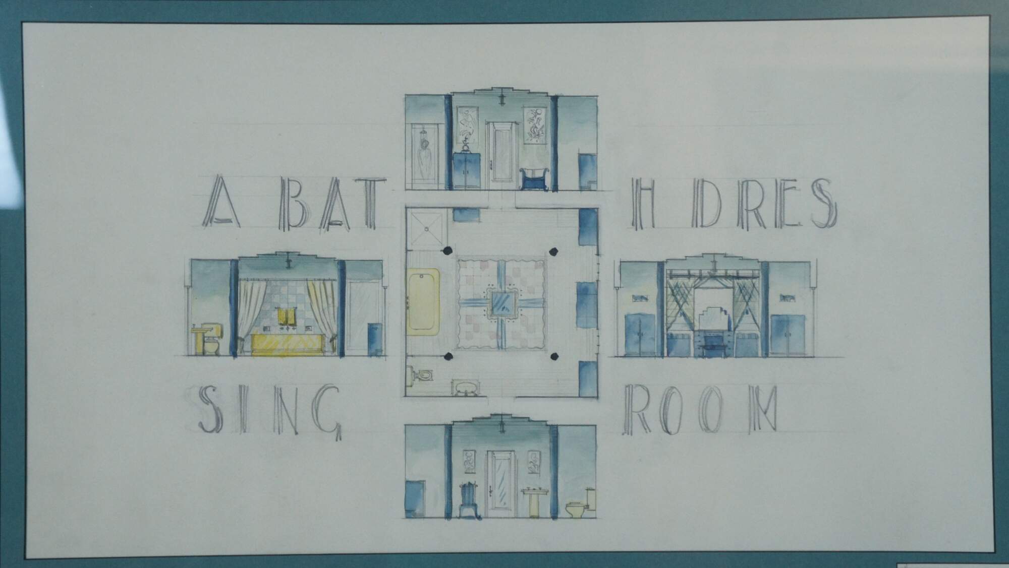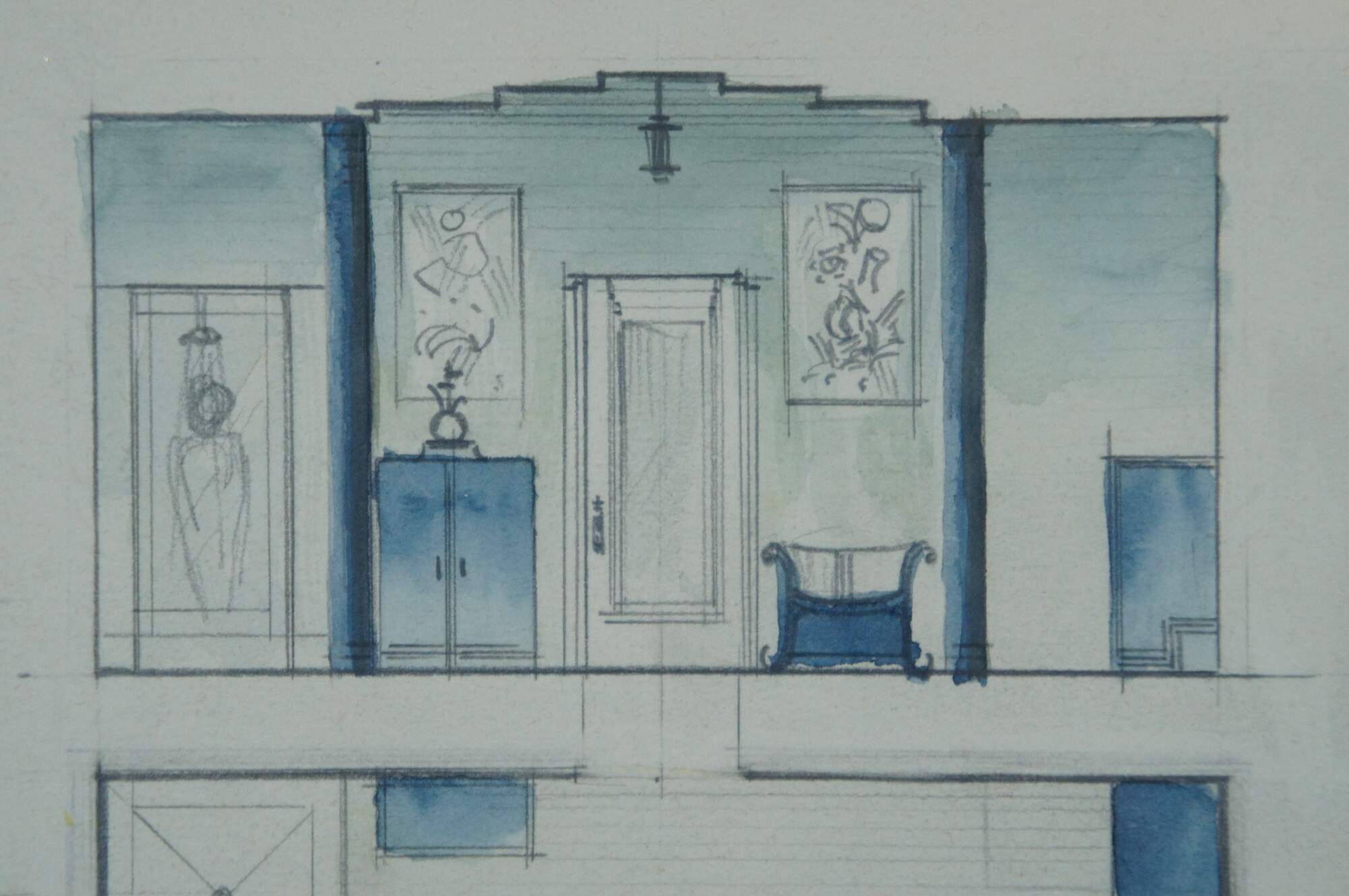 Antique folk art architectural / interior design pencil and watercolor on paper sketch for "A Bath Dressing Room" by Russell Durkle, Sketch Problem #7, April 27, 1934. Features overhead view and four interior views of a design for a full bathroom with space to accomodate a dressing area and vanity table. Teal green painted wood frame; light teal mat.