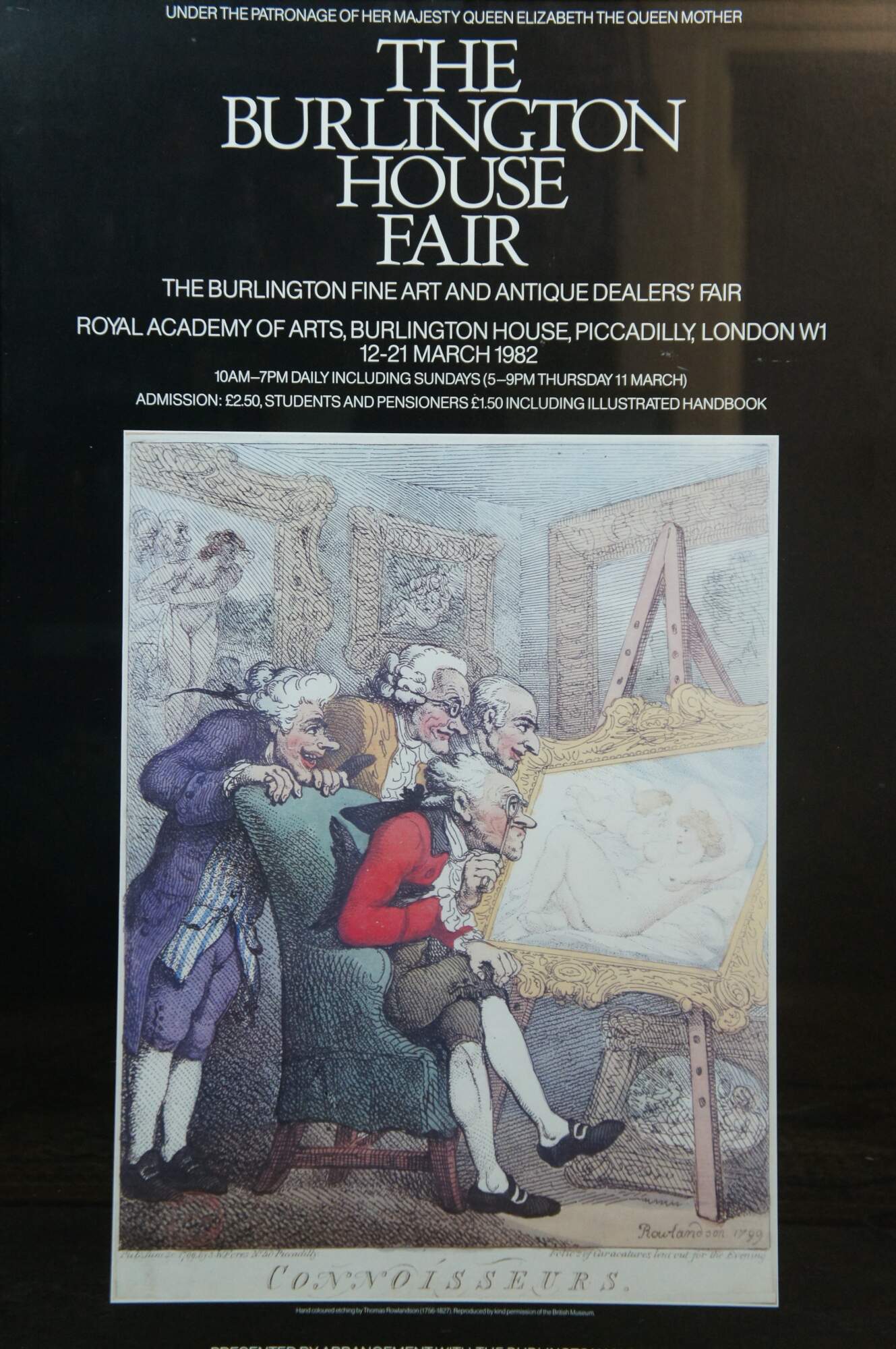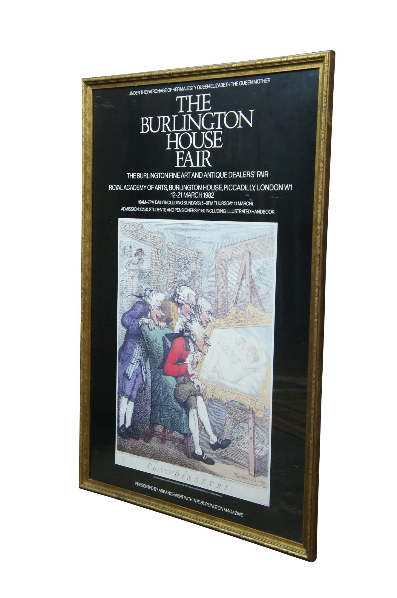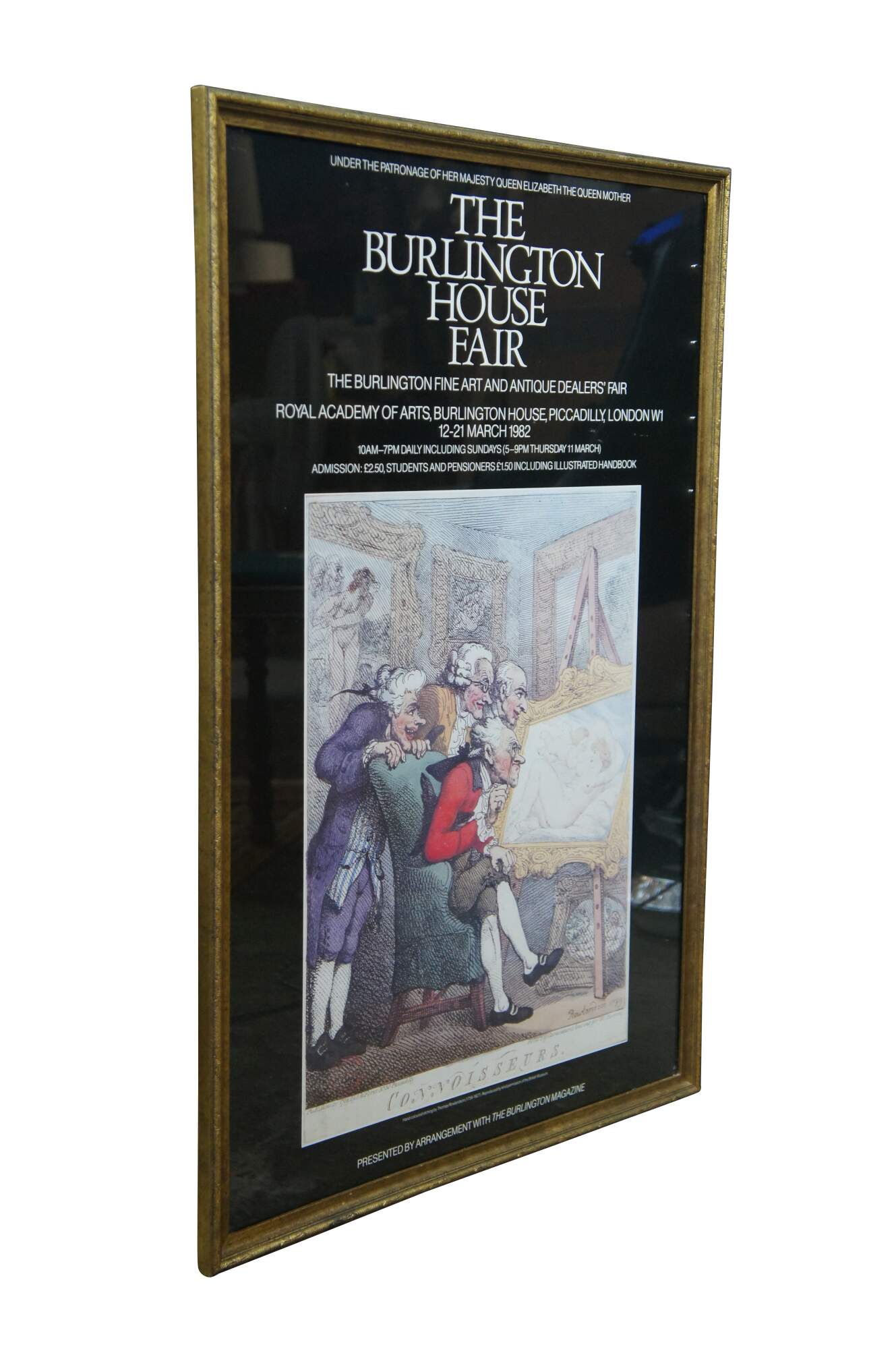 Vintage poster for The Burlington House Fine Art and Antique Dealers' Fair at the Royal Academy of Arts, London. Poster showcases a 1799 colored etching by Thomas Rowlandson titled "Connoisseurs." Giltwood frame carved with a border of bundles of plumes.