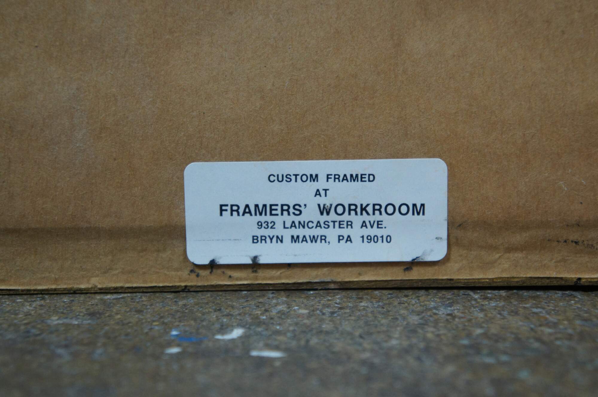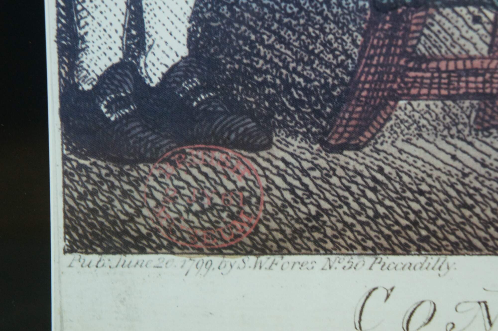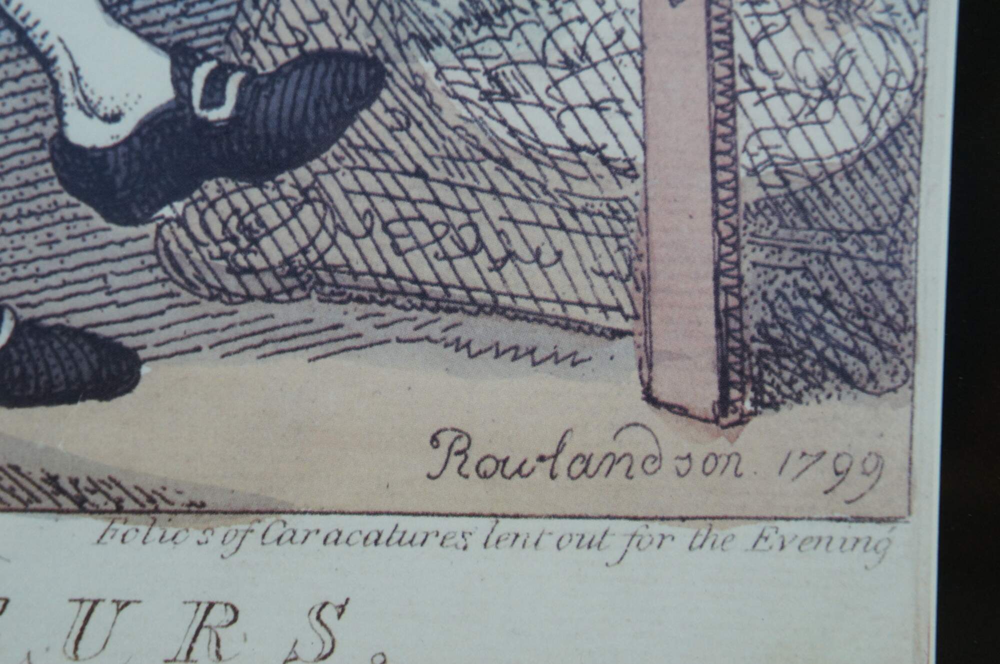 Vintage poster for The Burlington House Fine Art and Antique Dealers' Fair at the Royal Academy of Arts, London. Poster showcases a 1799 colored etching by Thomas Rowlandson titled "Connoisseurs." Giltwood frame carved with a border of bundles of plumes.