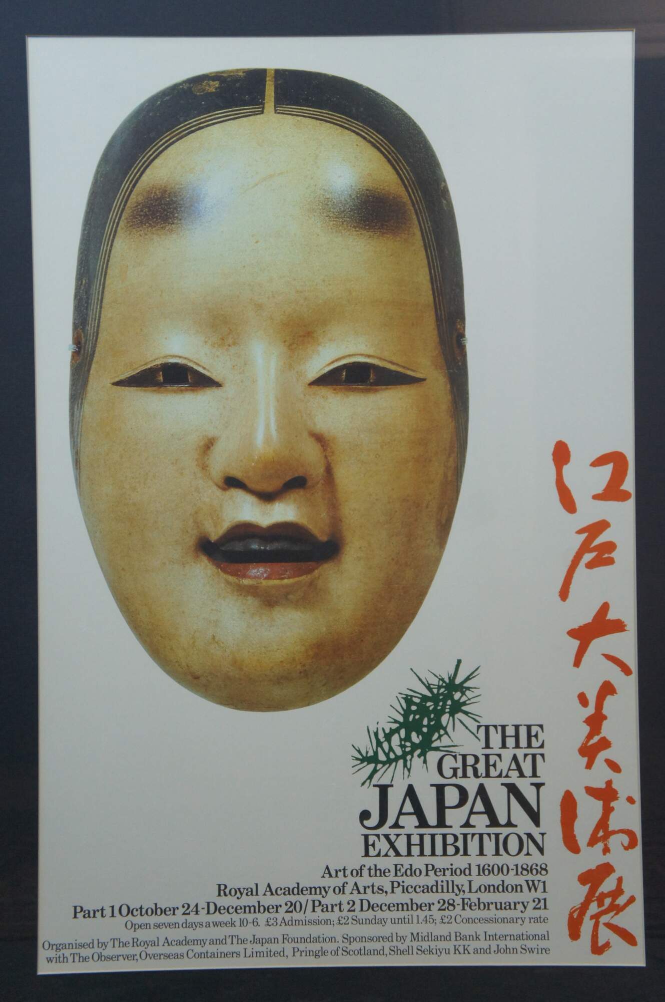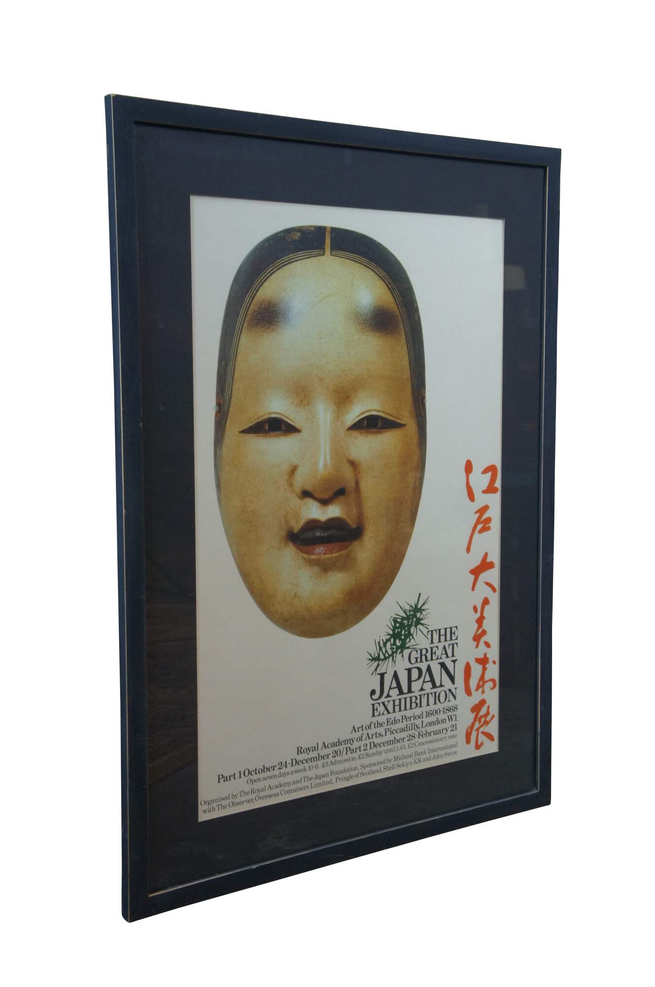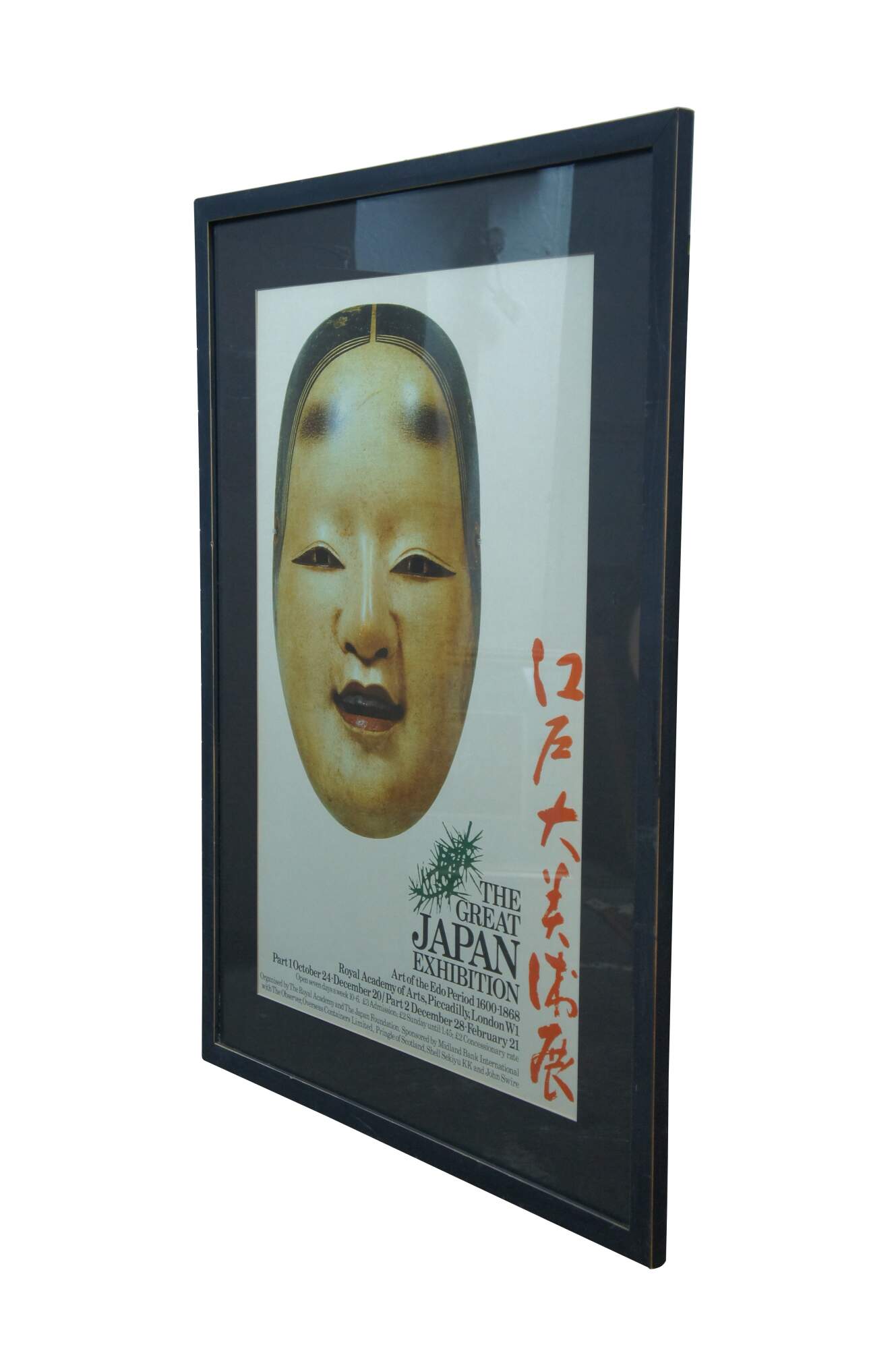 Late 20th century advertising poster for "The Great Japan Exhibition - Art of the Edo Period 1600-1868" at the Royal Academy of Arts in London. Poster features a Japanese noh theatre mask of a female face with center parted hair. Matte black painted wood frame; black mat.