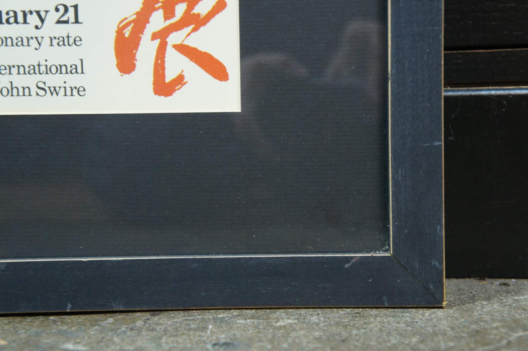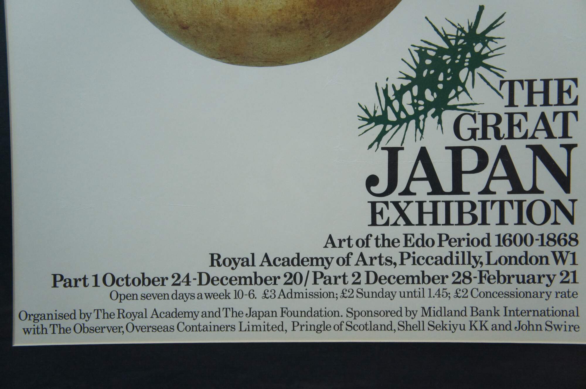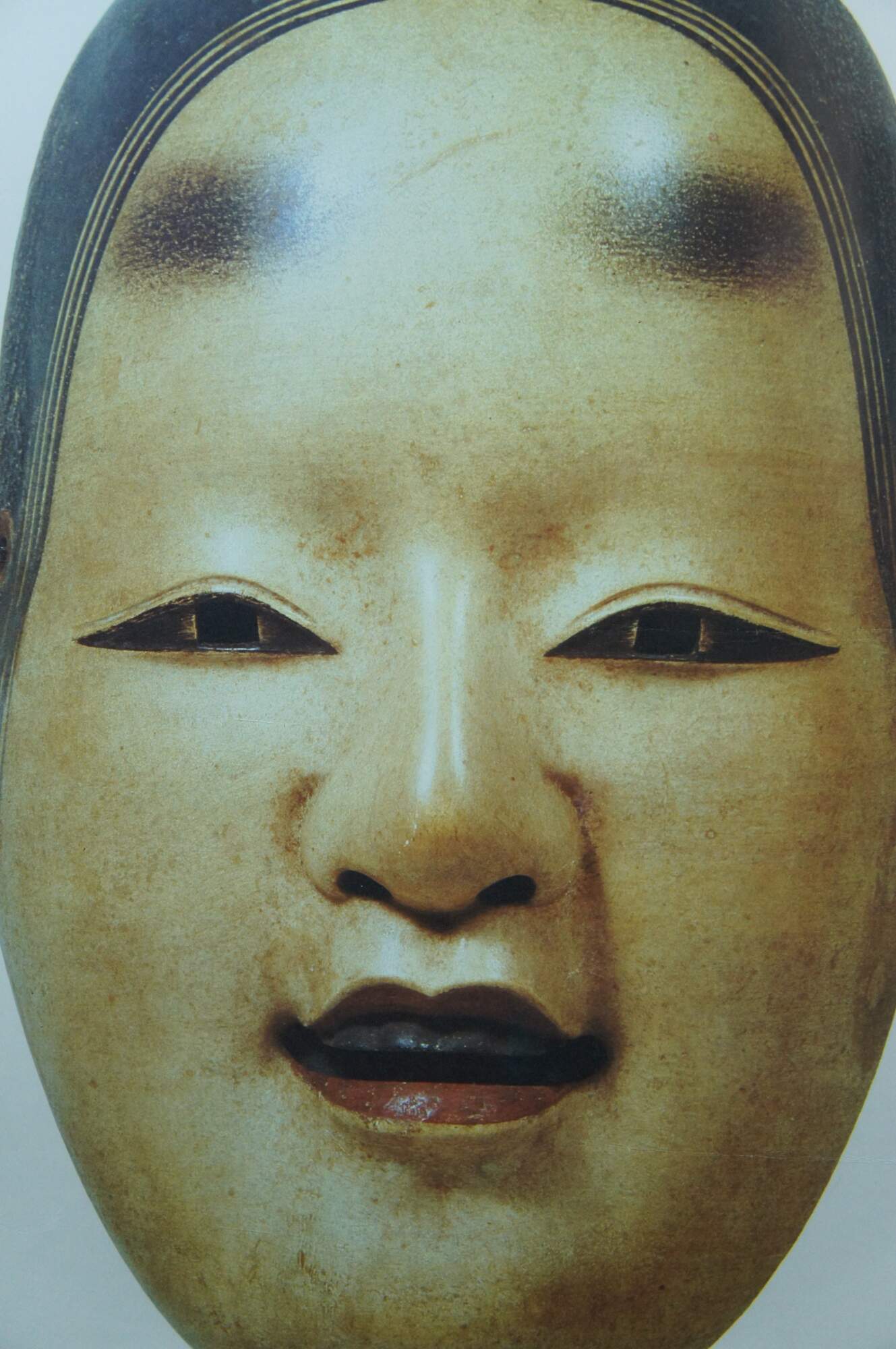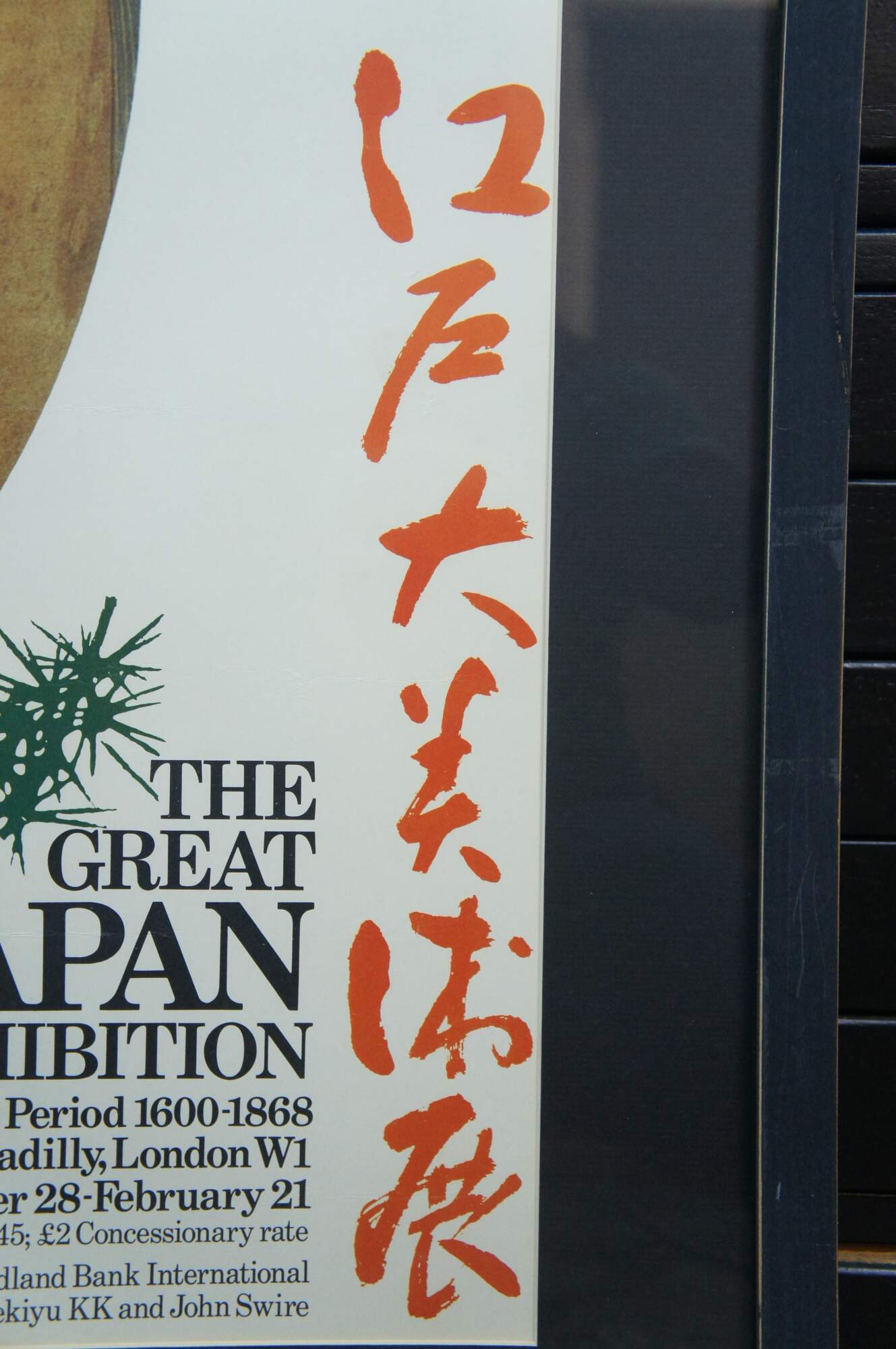 Late 20th century advertising poster for "The Great Japan Exhibition - Art of the Edo Period 1600-1868" at the Royal Academy of Arts in London. Poster features a Japanese noh theatre mask of a female face with center parted hair. Matte black painted wood frame; black mat.