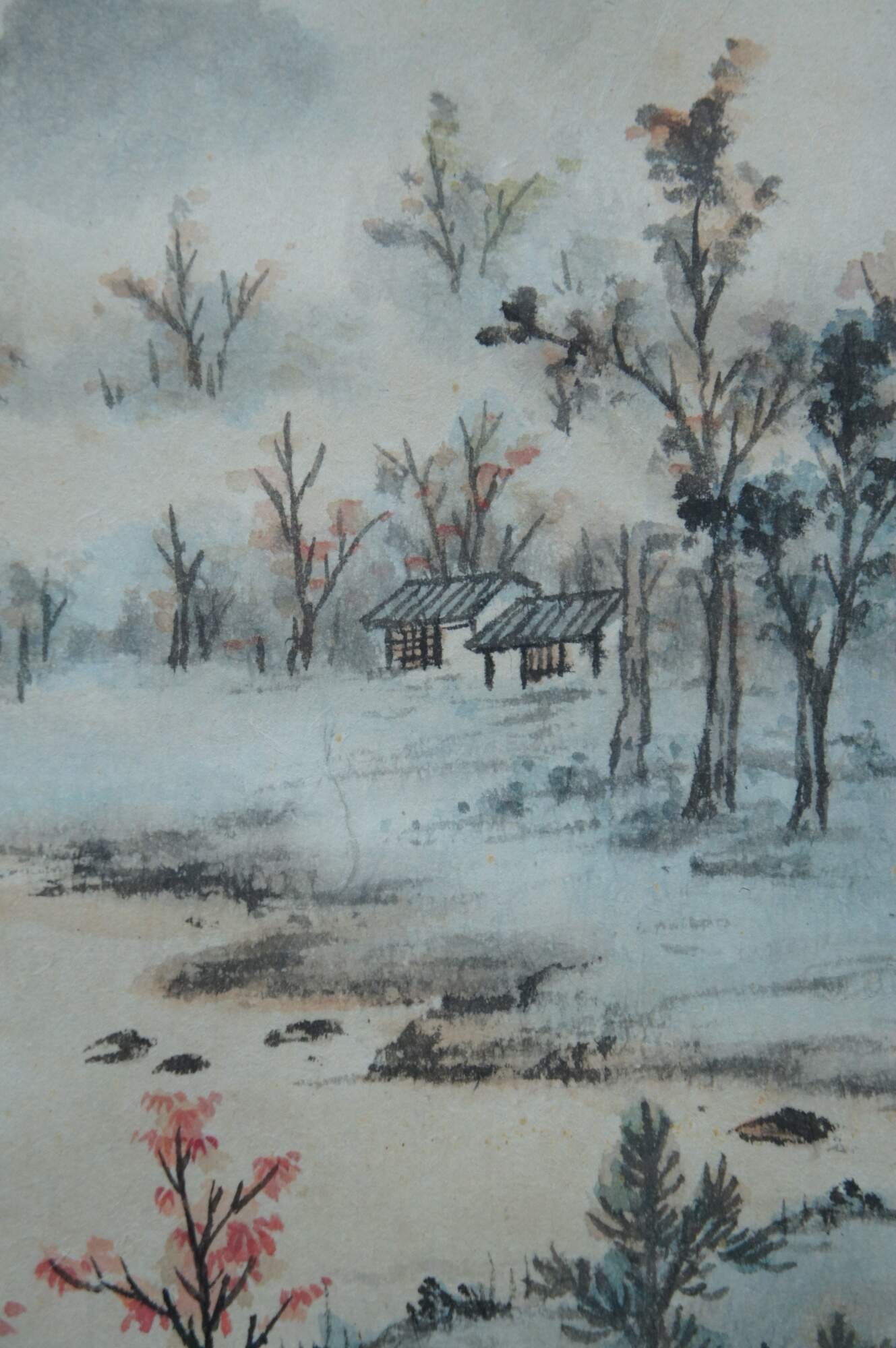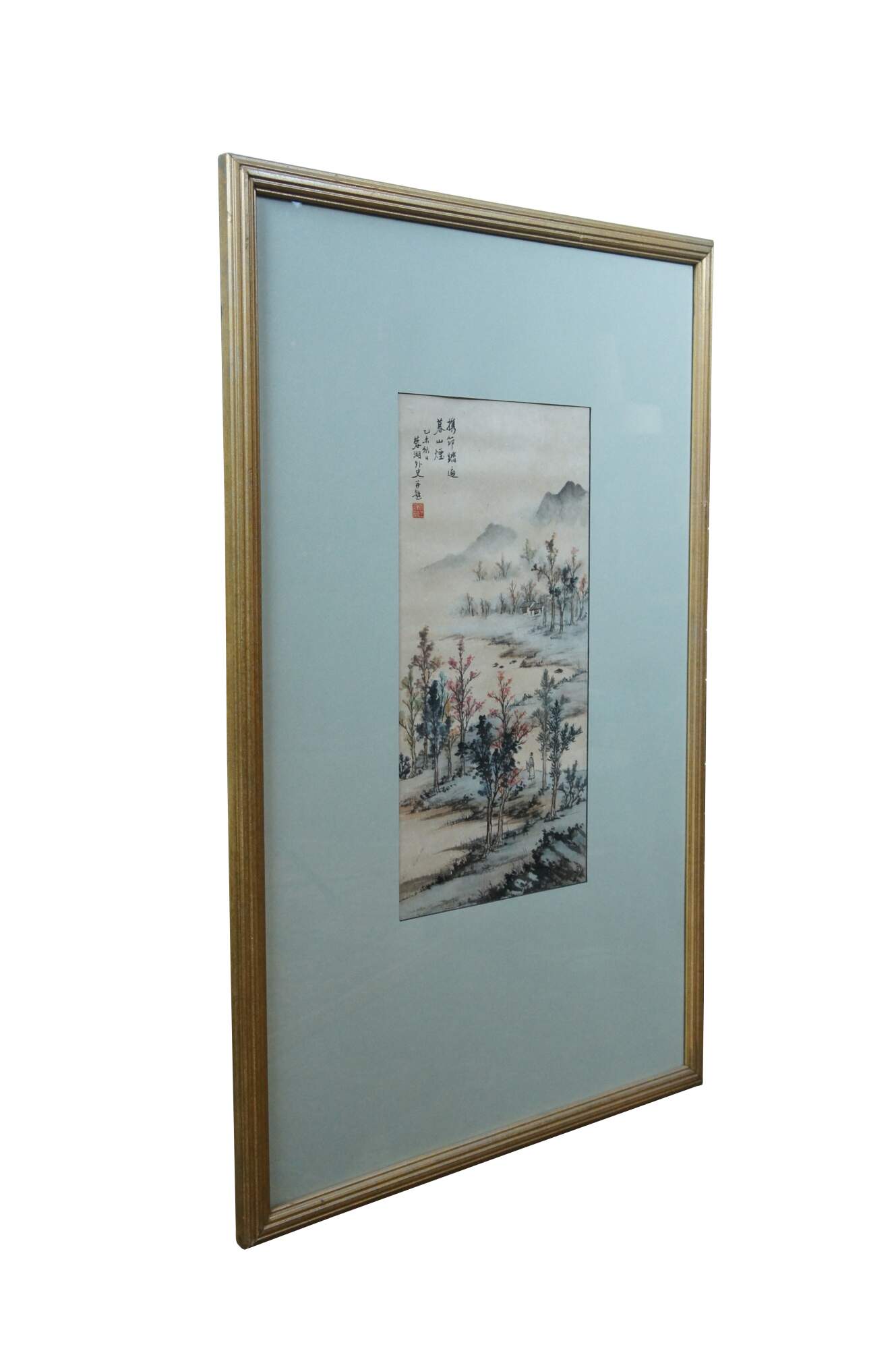 Antique Chinese landscape watercolor painting on paper showing a lone figure walkng among the trees towards a small cottage on the misty mountains at dusk. Beveled giltwood frame; light blue mat.