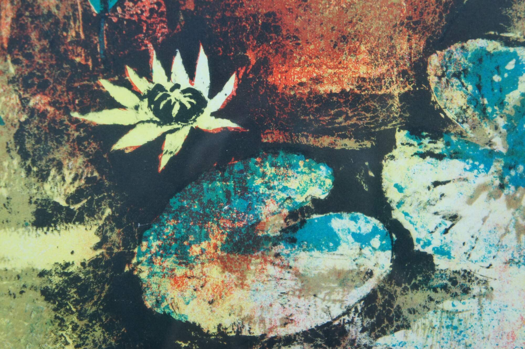 Mid century lithograph print by Hoi Ledabang. Shows a semi-abstract scene in red, yellow, and teal of water lilies and lily pads. Pencil signed Hoi (lower right) and numbered 230/325 (lower left). Embossed CG and with a flower and butterfly design along the lower edge. Plain wood frame; white and teal layered mat.