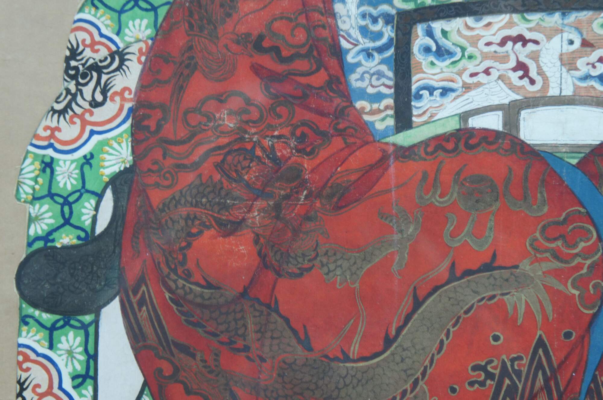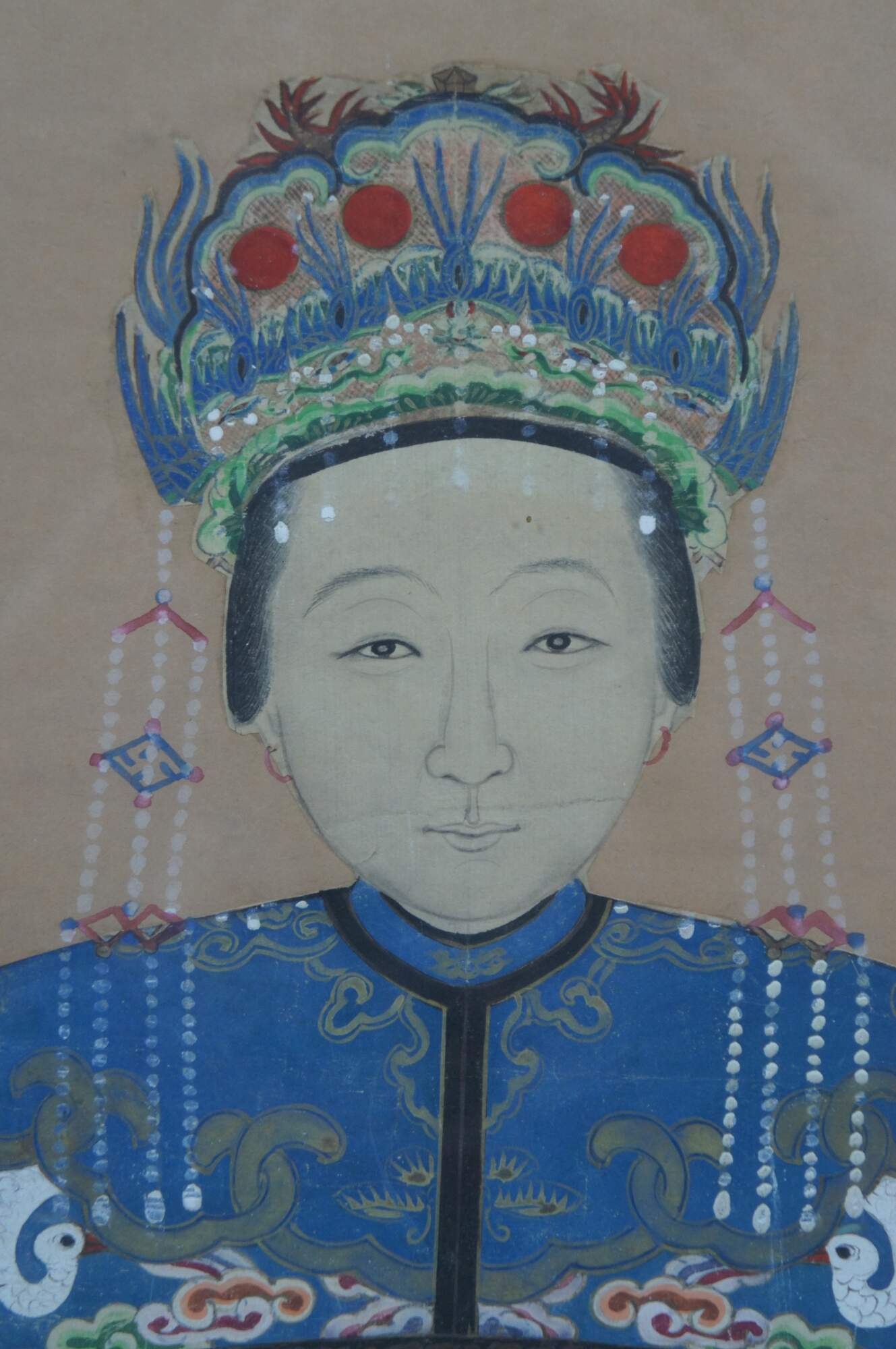 Antique watercolor on paper Chinese ancestor portrait, depicting a woman on a throne chair wearing intricate robes with cranes and dragons, and jeweled crown of an Empress. Distressed giltwood frame; light pink mat with gold floral silk trim.