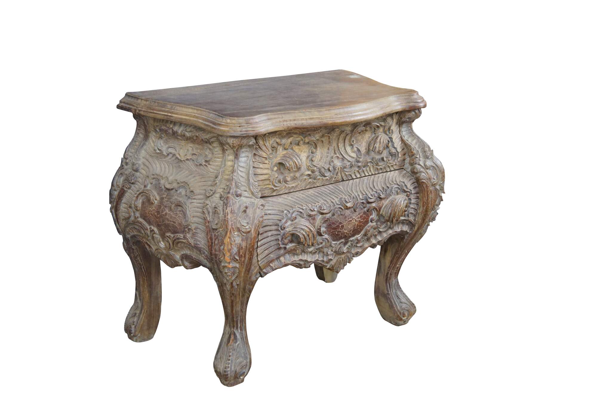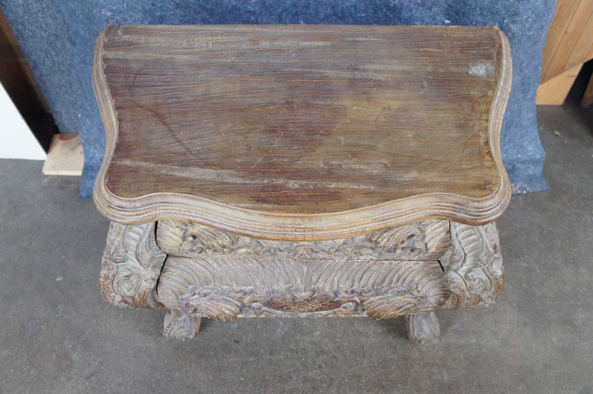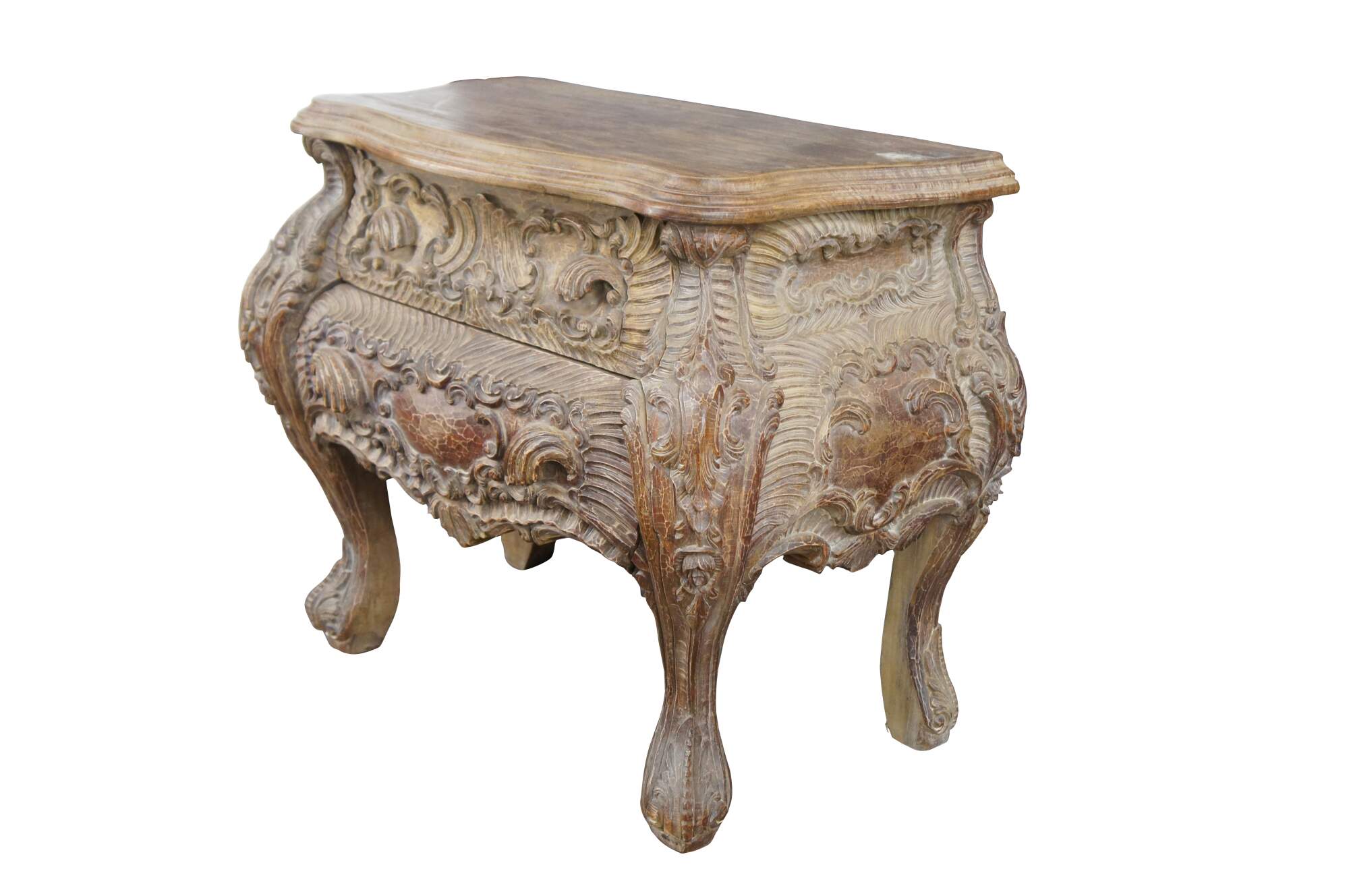 Baroque Revival carved wooden nightstand / commode. Features a serpentine frame with two drawers, heavily carved in baroque manner with cabriole legs. Great for use as a bedside table, Bombay / commode, nightstand, end or side table.