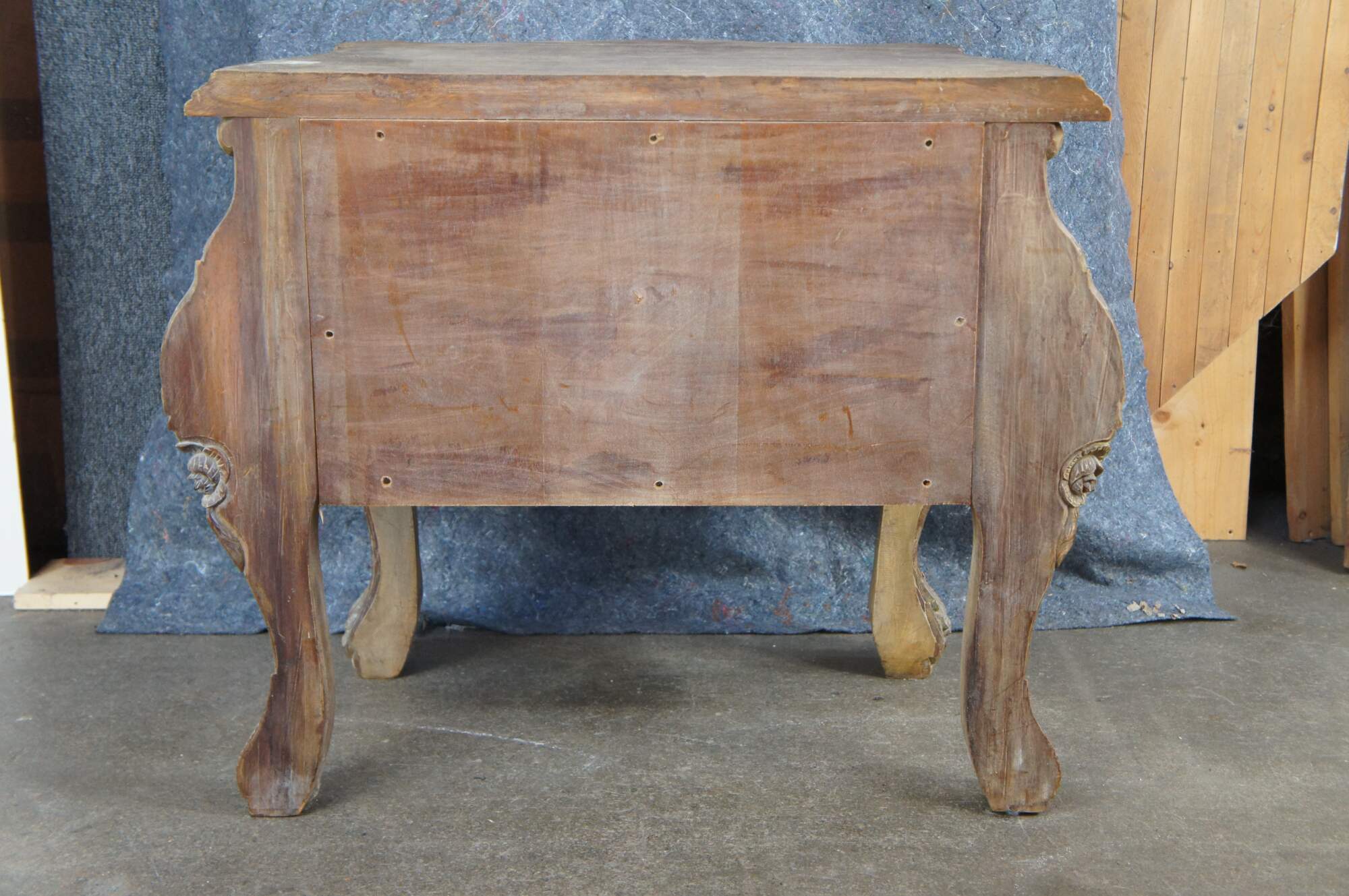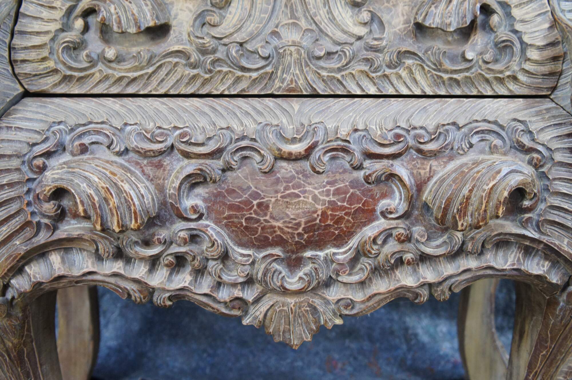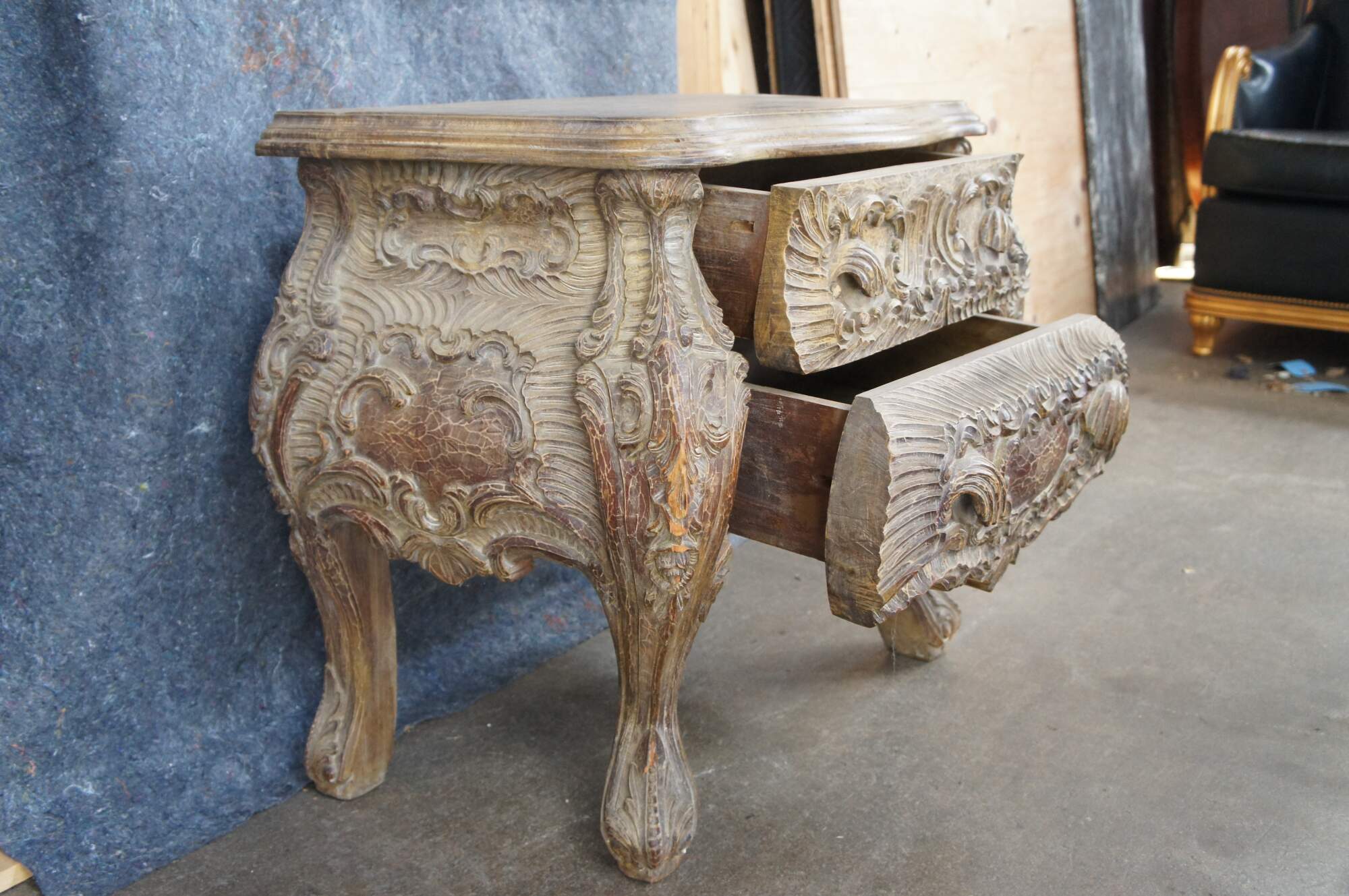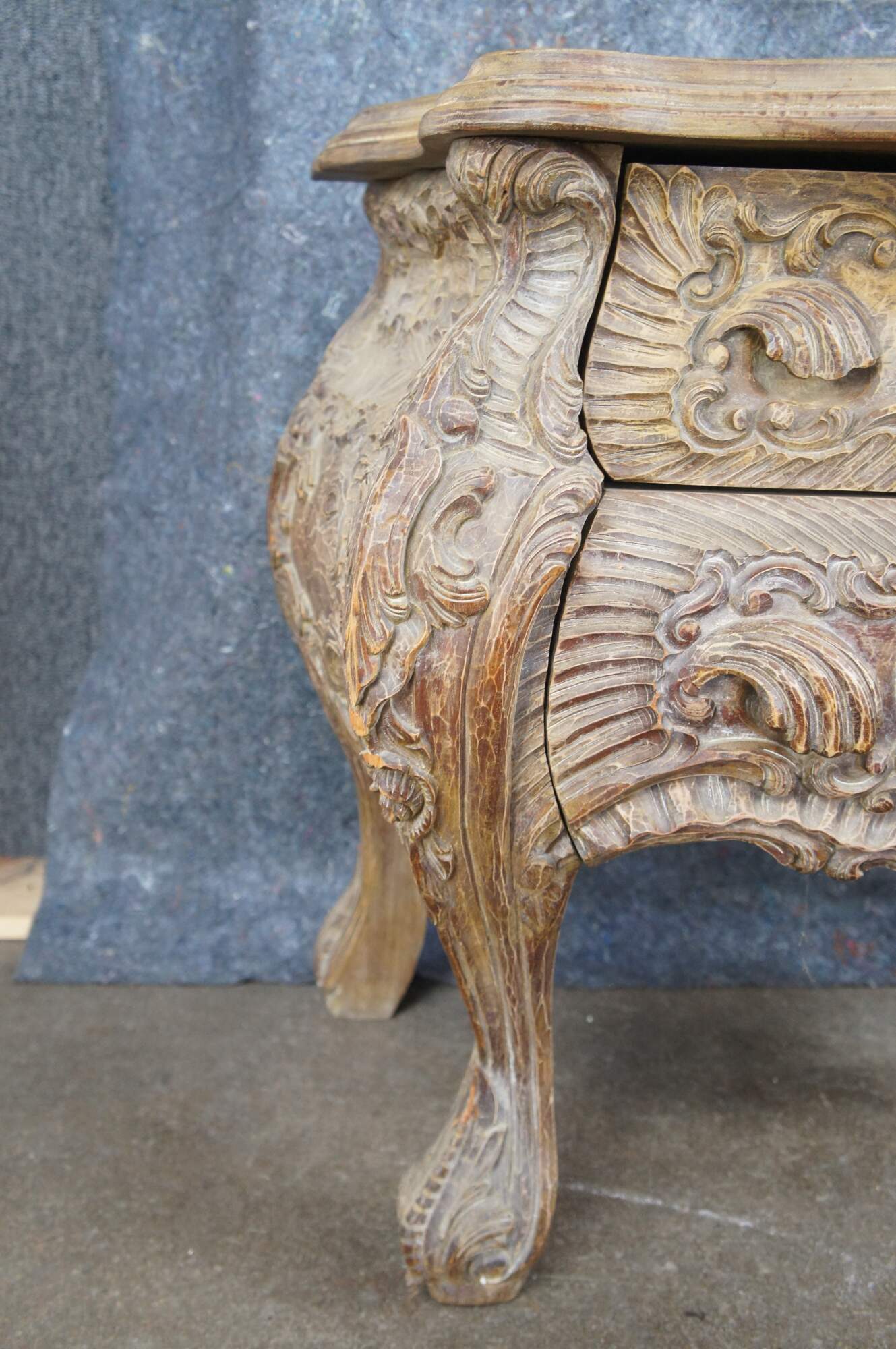 Baroque Revival carved wooden nightstand / commode. Features a serpentine frame with two drawers, heavily carved in baroque manner with cabriole legs. Great for use as a bedside table, Bombay / commode, nightstand, end or side table.