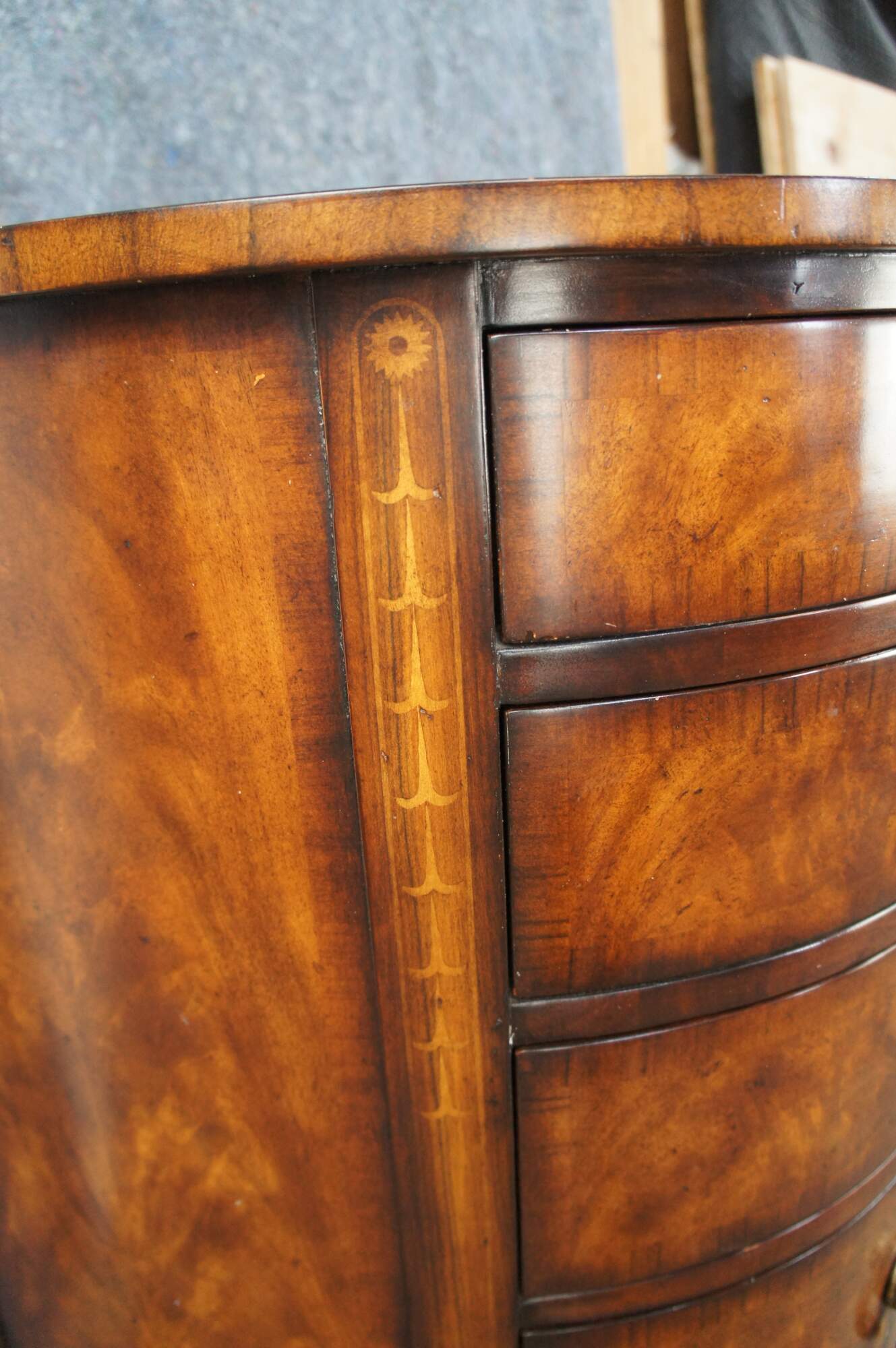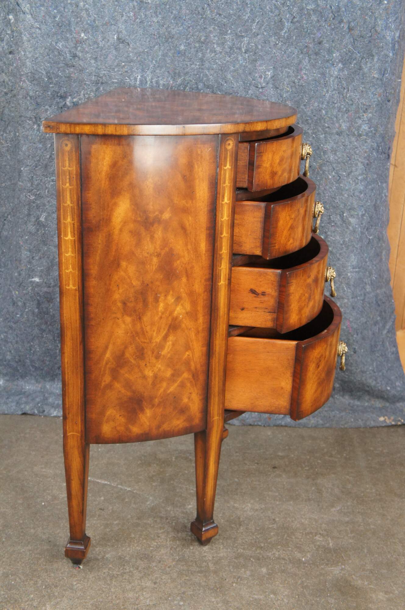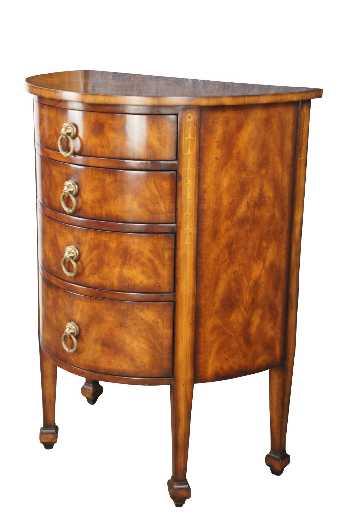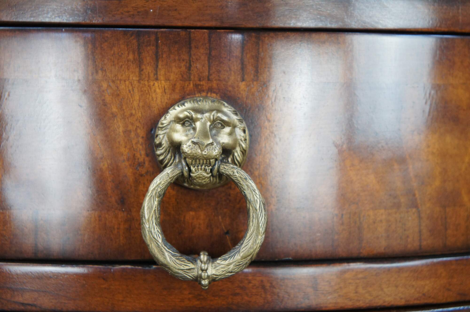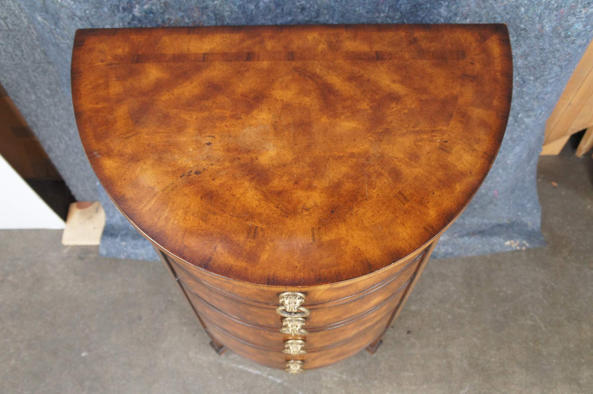 An exquisite Demilune / Crescent / Halfmoon hall table by Theodore Alexander, circa 2000s. Features a mahogany burl frame with four drawers and foliate and foliate inlaid stiles over square tapered legs leading to spade feet. Each drawer is accented by figural brass lion head knockers.