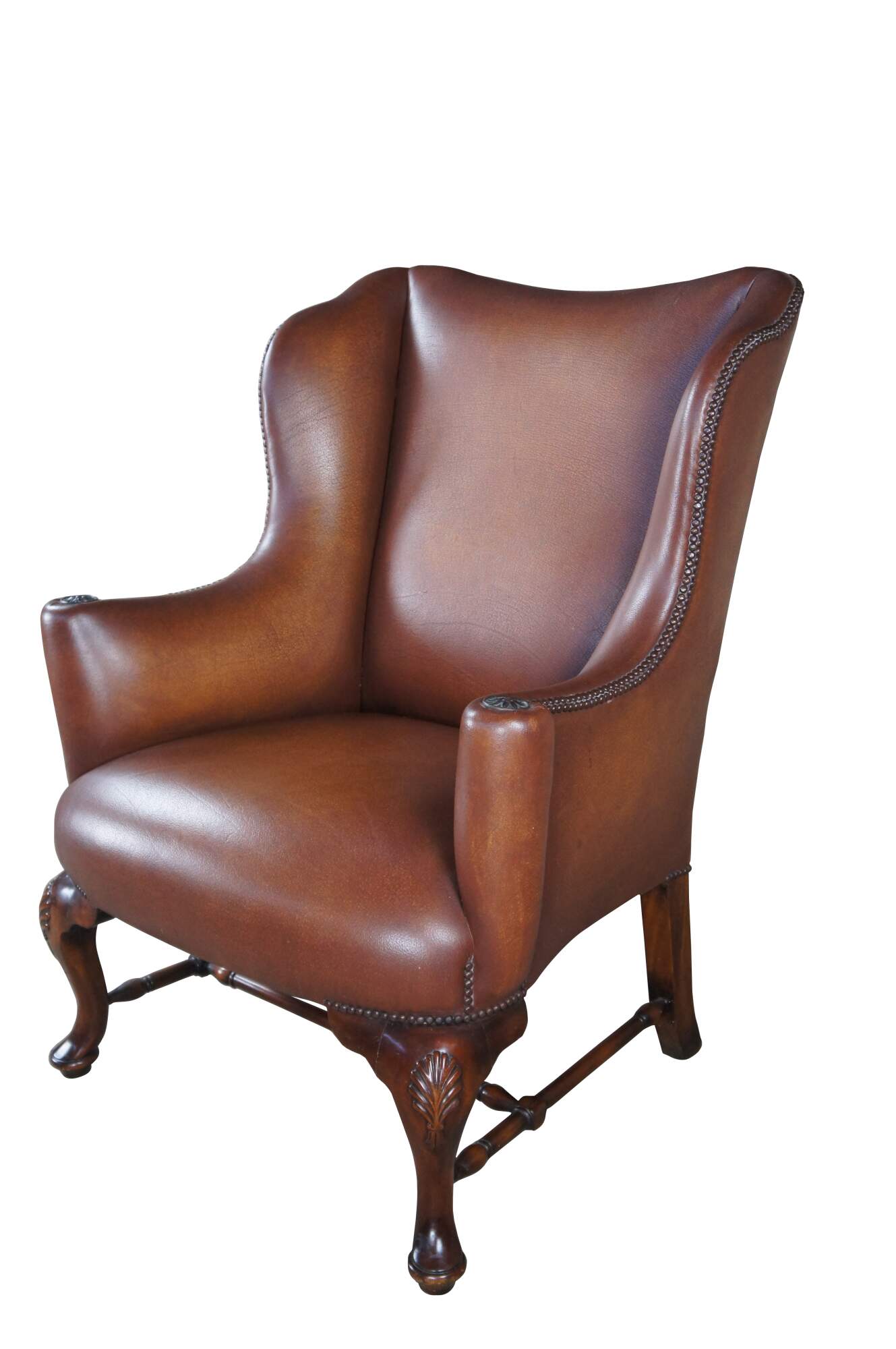 A Stately Georgian Style Wing Chair by Theodore Alexander, circa early 2000s. Features a mahogany frame with aged brown leather upholstery and brass nailhead trim. Arms are flared and scrolled with foliate medallions along the top. Front legs are cabriole form with scallop carved knees and pad feet. Front legs are connected to rear by spindle turned H stretcher. Seat Cushions are a blend of foam and Waterfowl / Down.