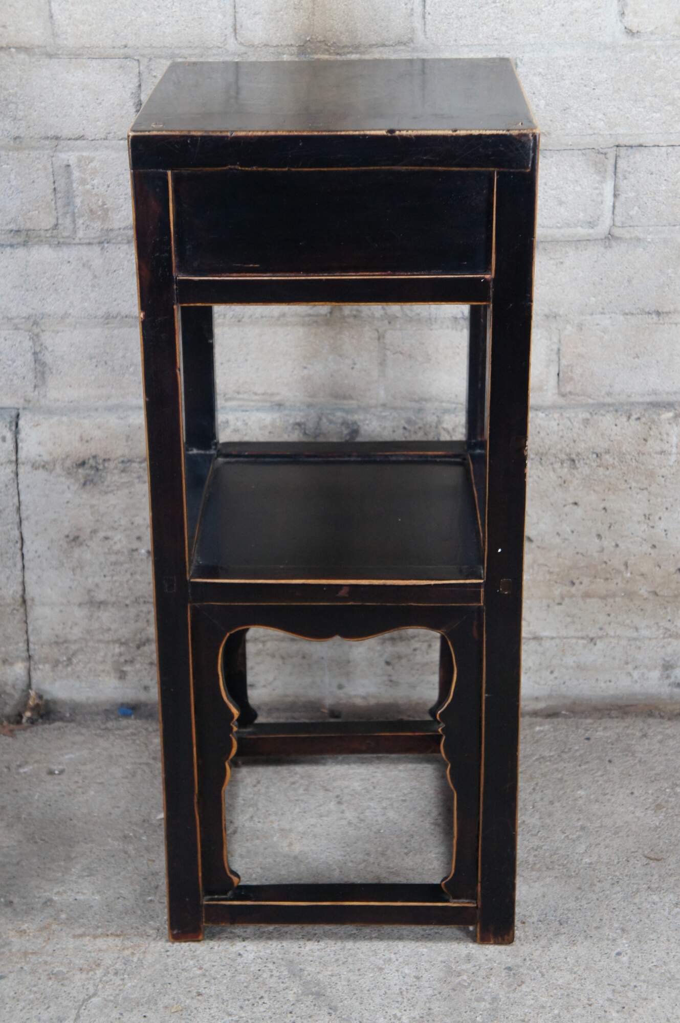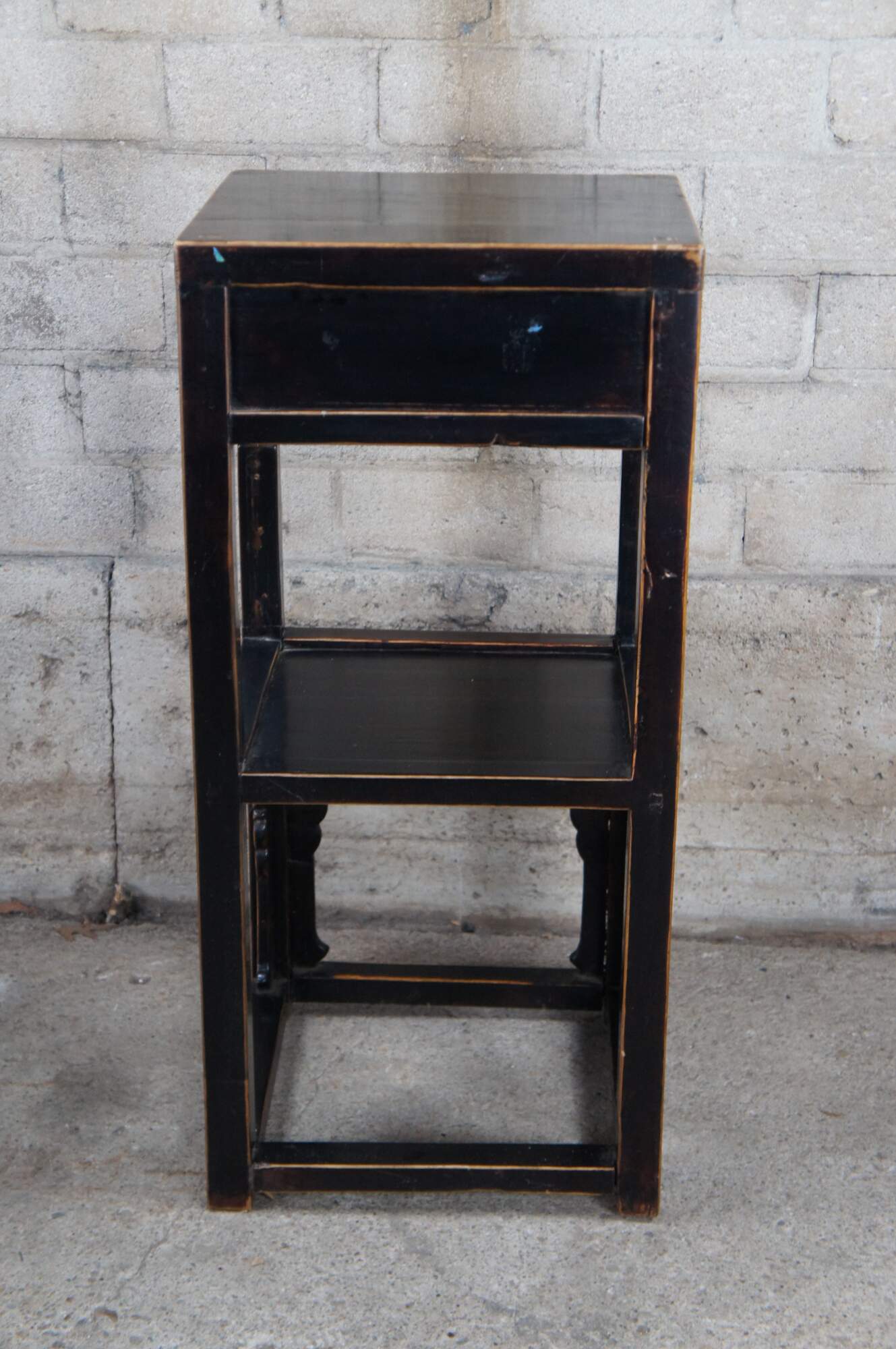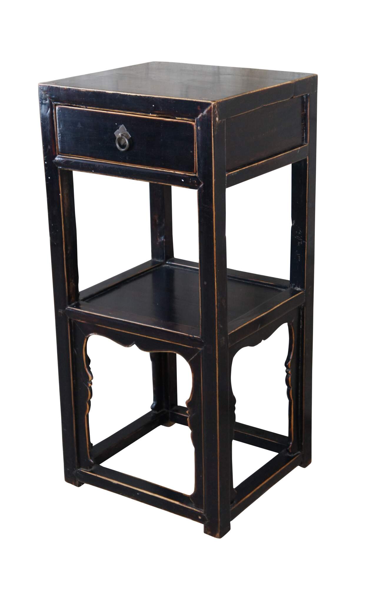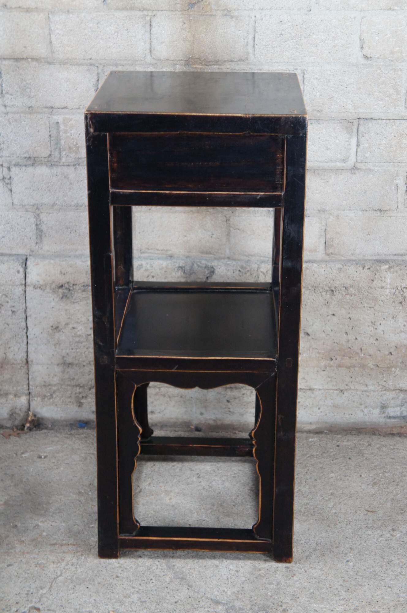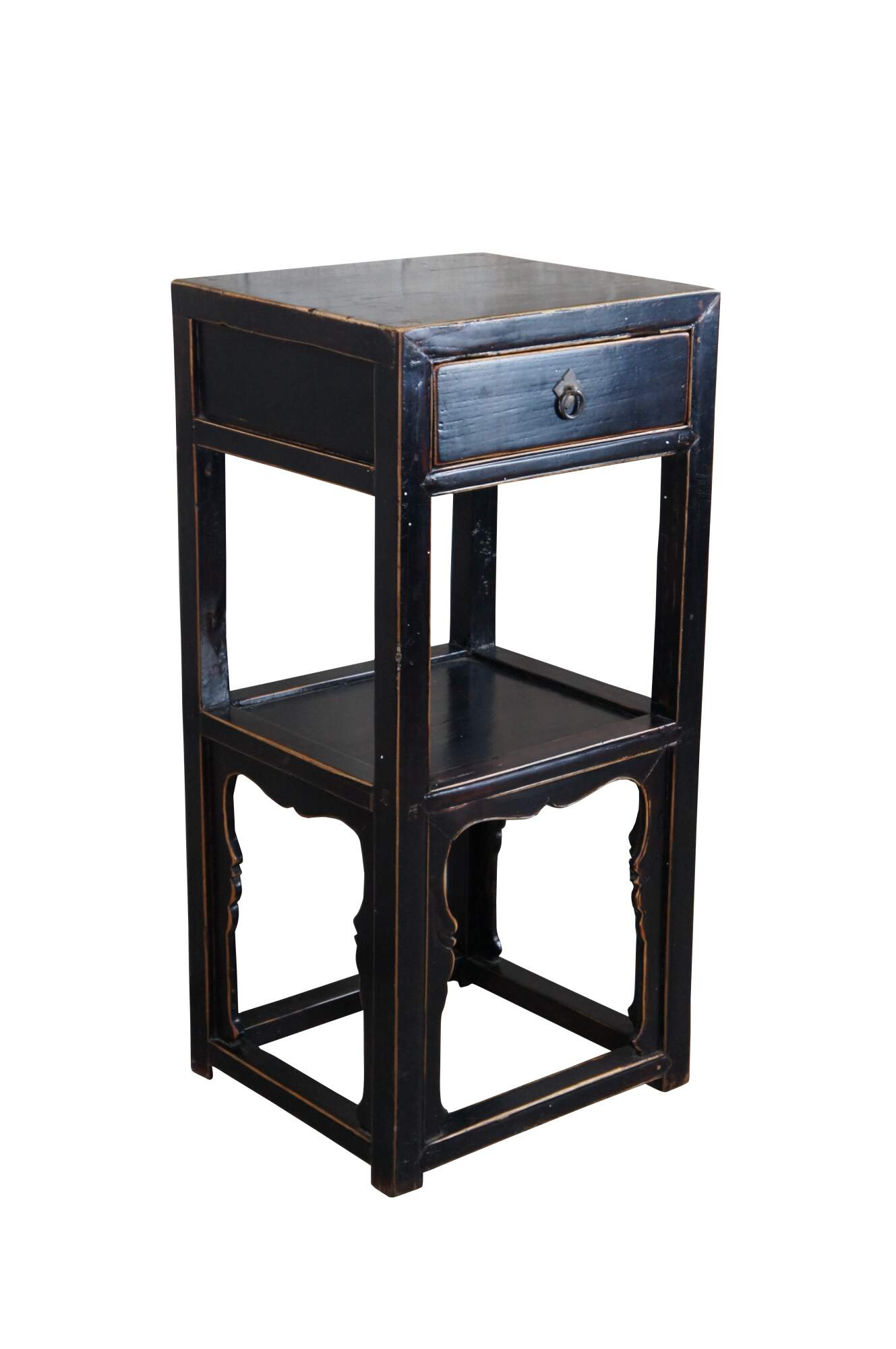 Late 19th Century Chinese Qing Dynasty Tiered Side Table or Sculpture Pedestal / Plant Stand. Made from elm with a black lacquer finish. Features a dovetailed drawer, lower shelf and serpentine carved spandrels. Drawer has a brass pull with ring and foliate backplate. The table is constructed from mortise and tenon joinery.