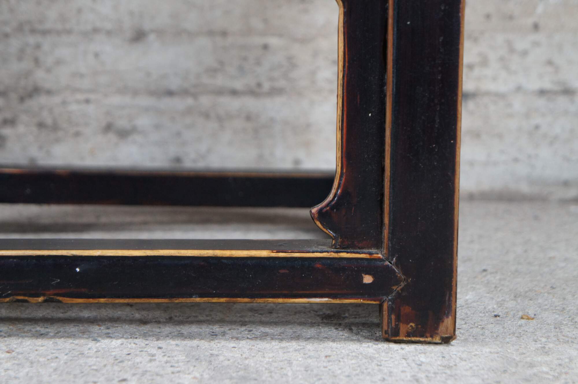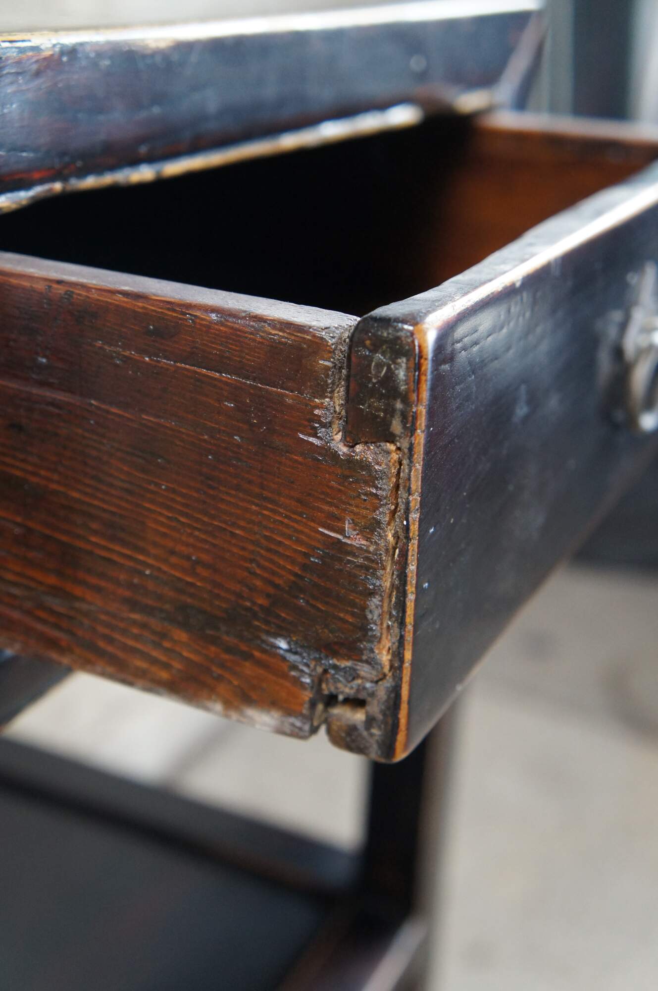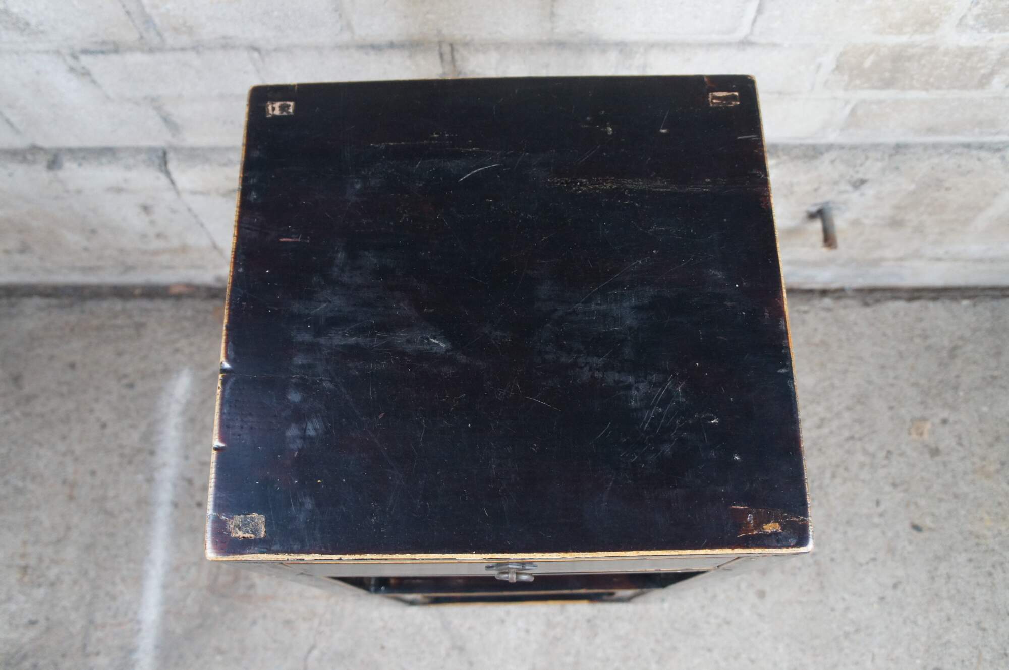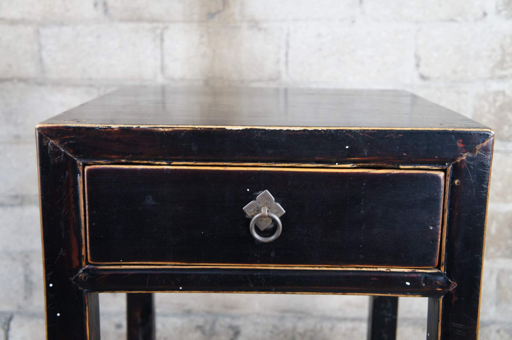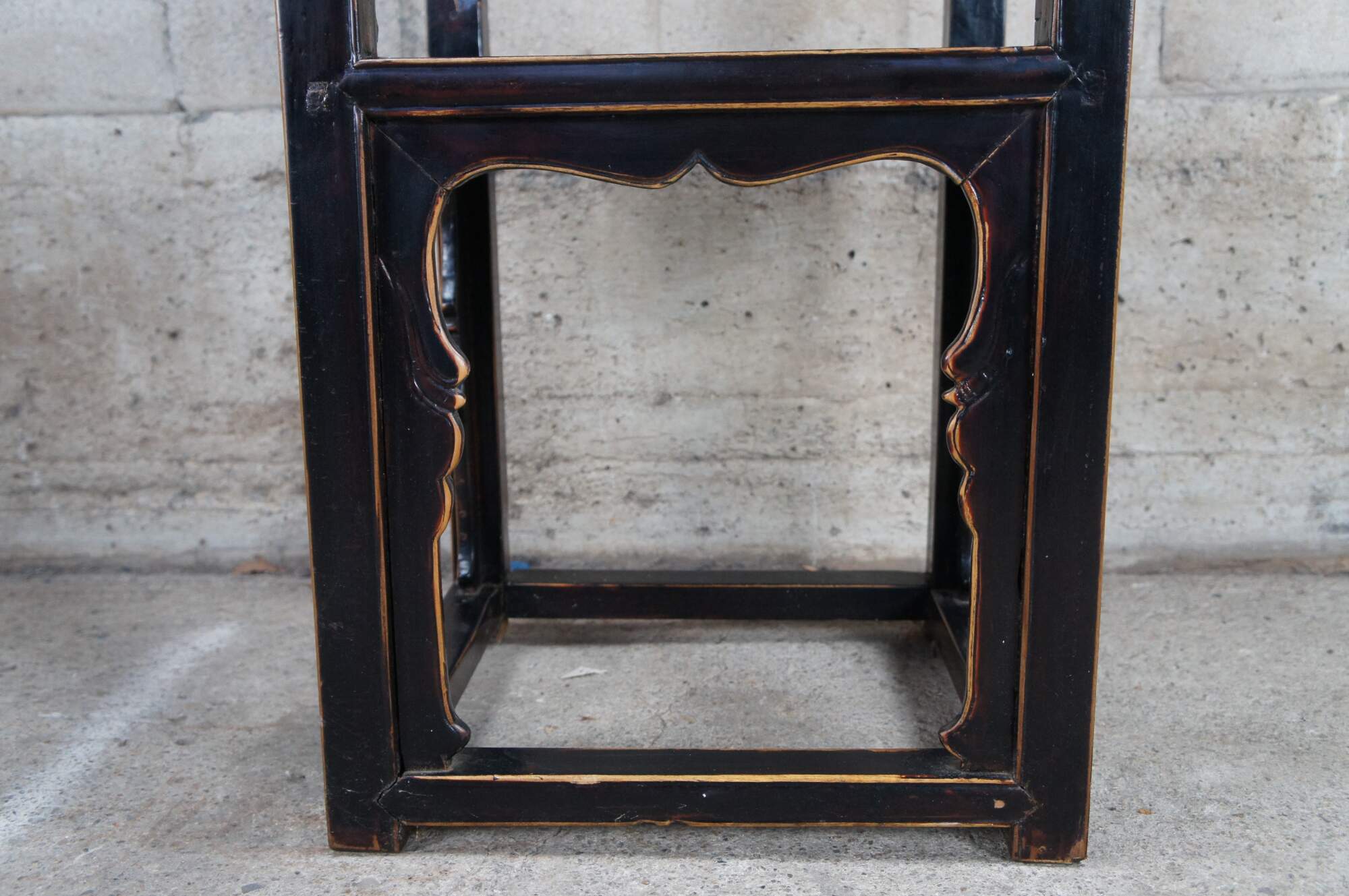 Late 19th Century Chinese Qing Dynasty Tiered Side Table or Sculpture Pedestal / Plant Stand. Made from elm with a black lacquer finish. Features a dovetailed drawer, lower shelf and serpentine carved spandrels. Drawer has a brass pull with ring and foliate backplate. The table is constructed from mortise and tenon joinery.