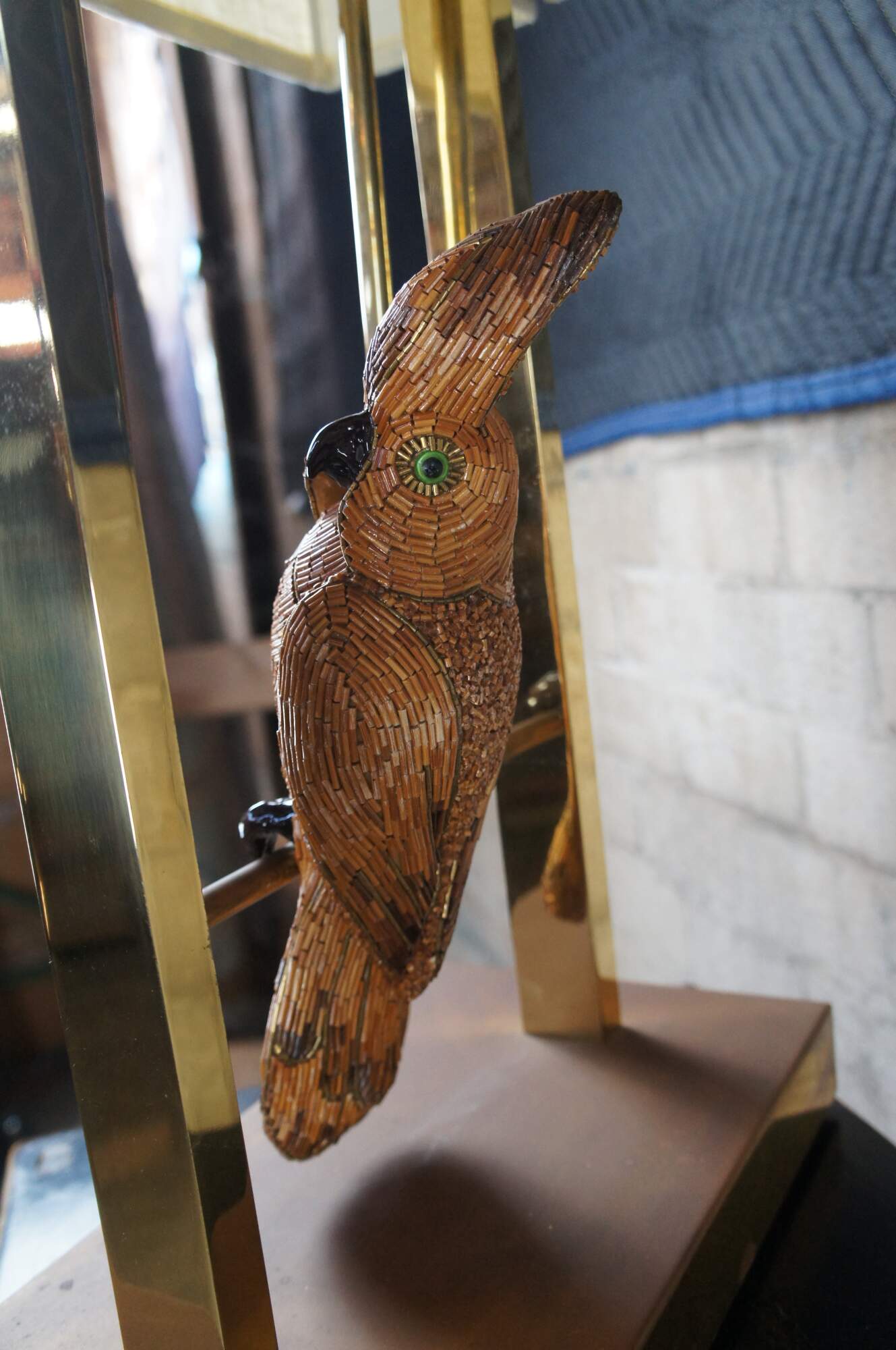 Rare Mid Century French Cockatoo / Macaw / Parrot lamp. The Cockatoo is beaded and is mounted on a working swing. Includes Original Mid Century linen shade