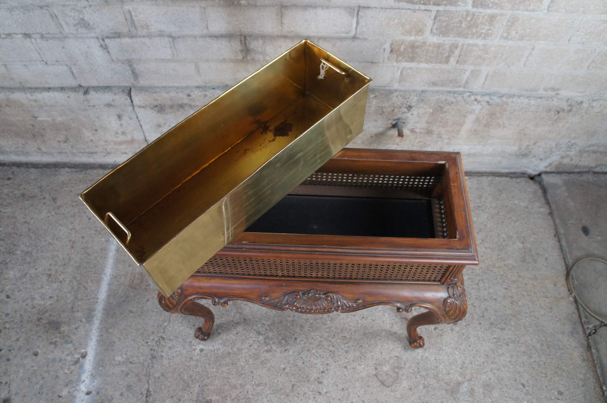A beautiful late 20th Century plant stand / planter by Maitland Smith. Made from mahogany with a rectangular form over swooping cabriole legs and scrolled feet. Features scallop carved knees, serpentine aprons, caned siding and a removable brass liner with handles. Display your favorite plants, or bring out for a gathering as a beverage / wine / beer chiller or cooler.