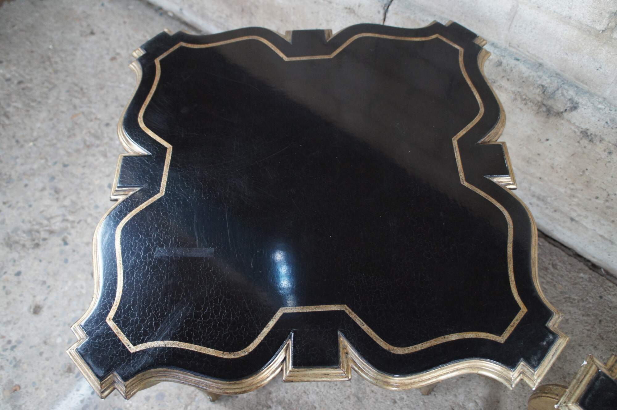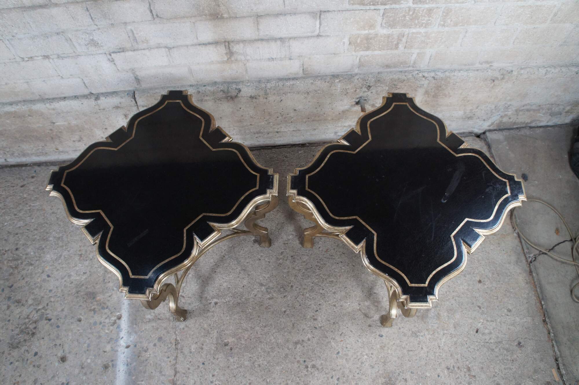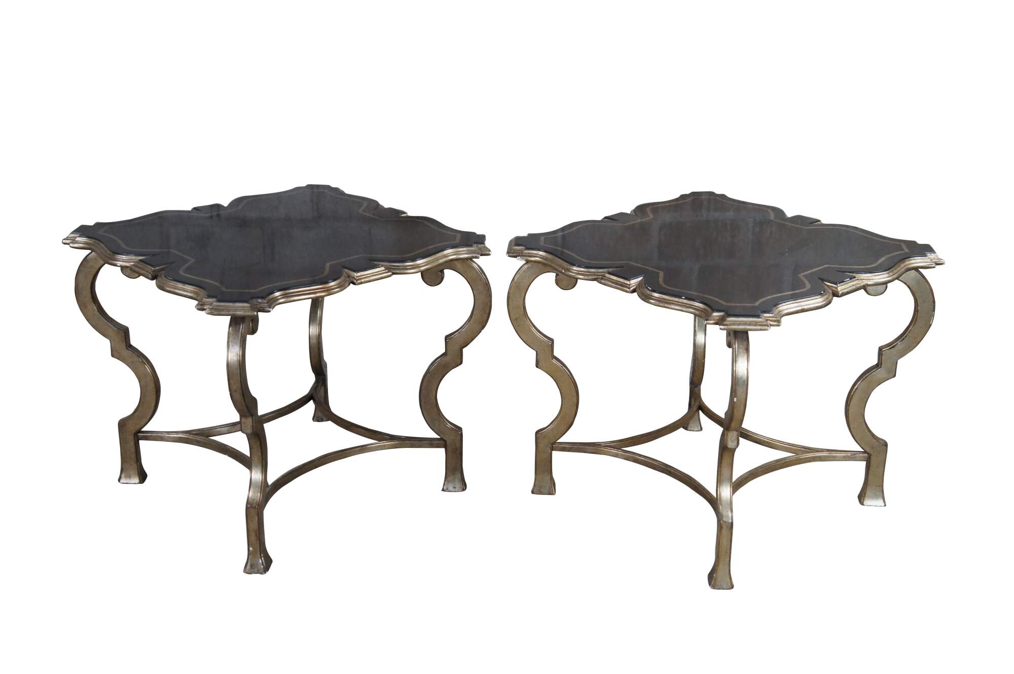 Pair of contemporary tables. Features an assymetral square form top with black crackle finish over ornate champagne colored bases.