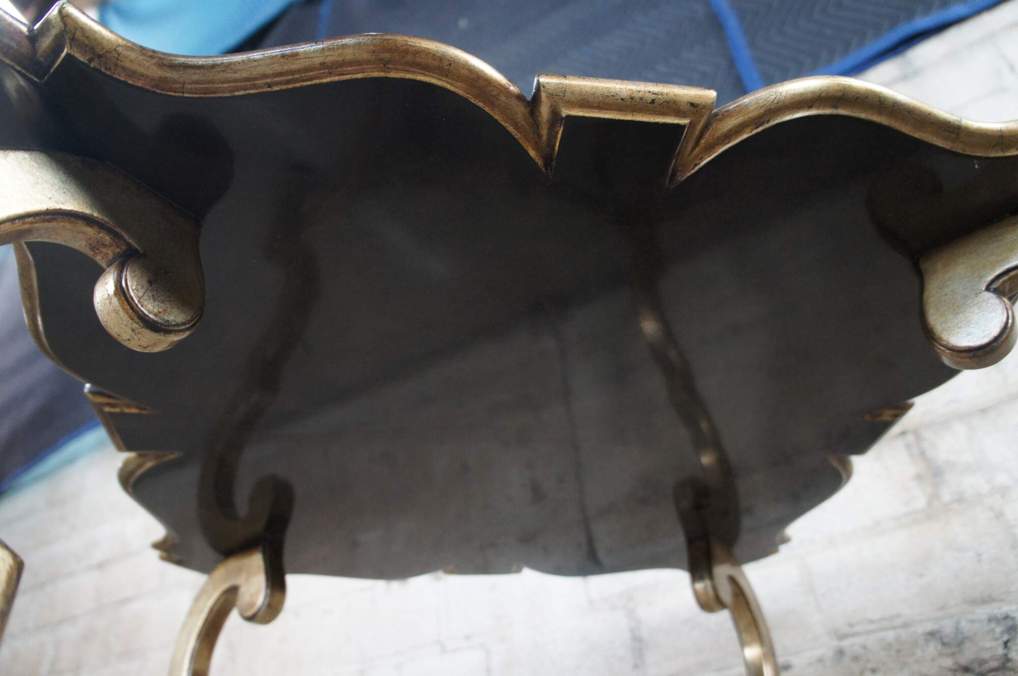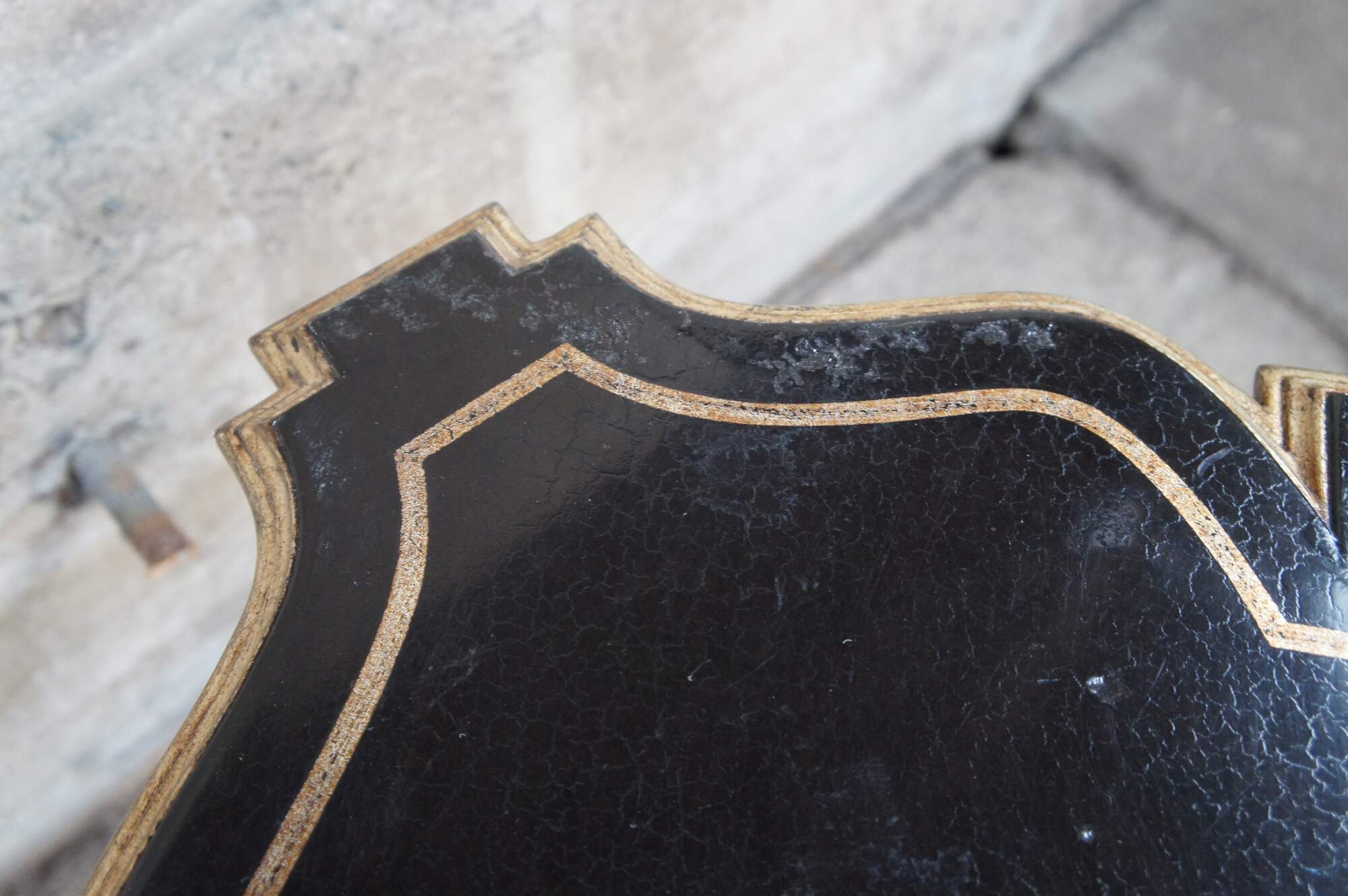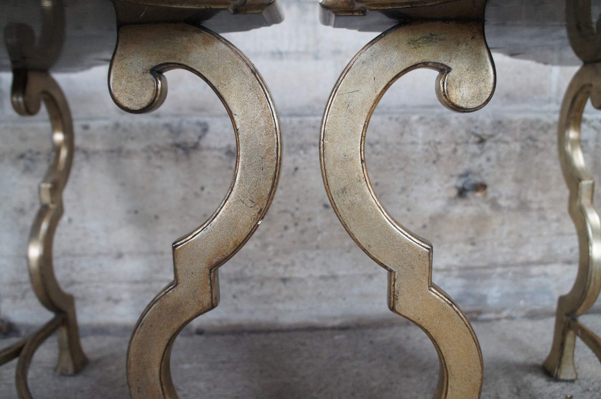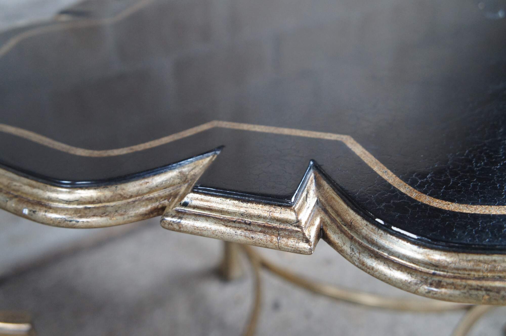 Pair of contemporary tables. Features an assymetral square form top with black crackle finish over ornate champagne colored bases.