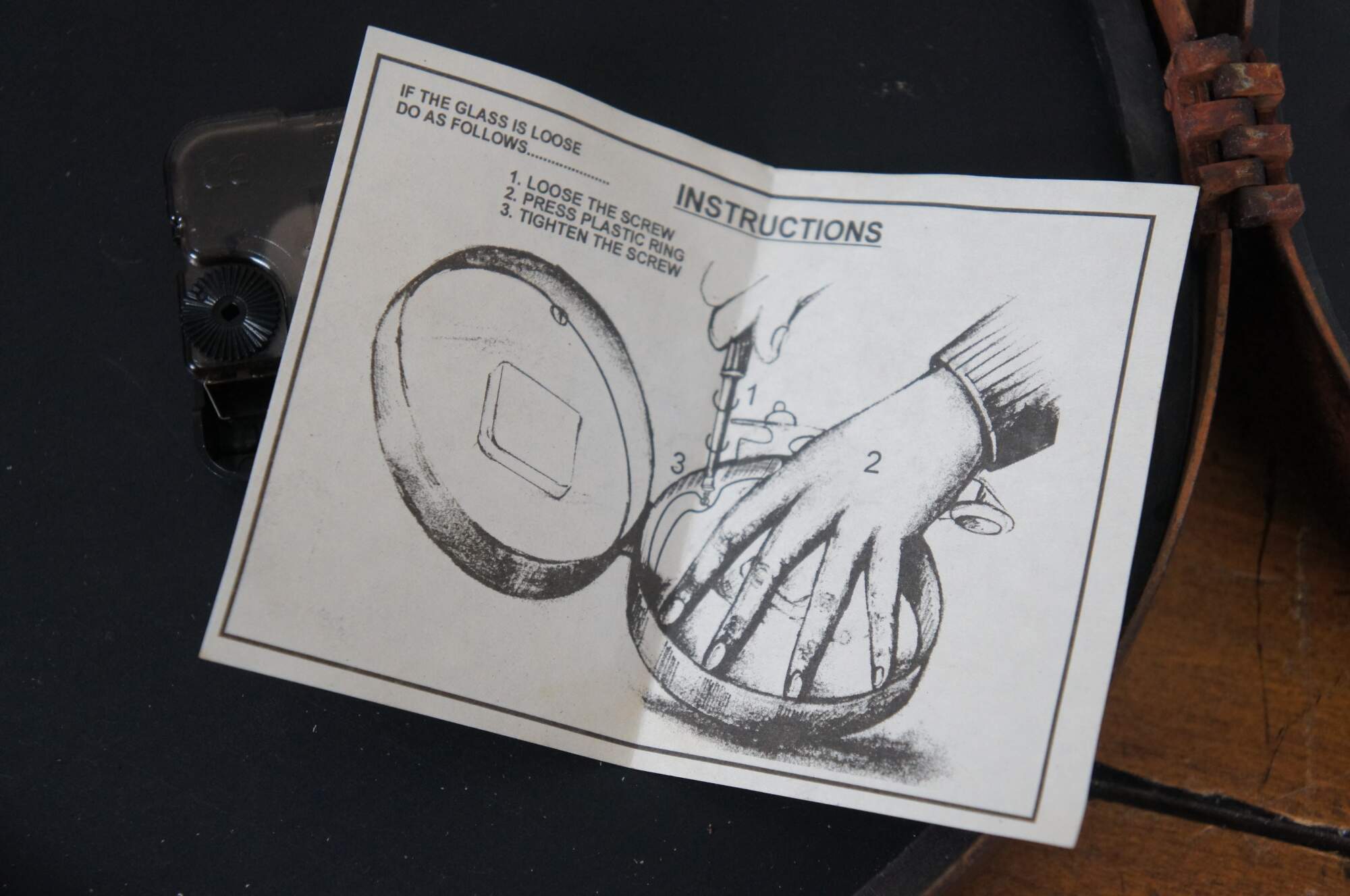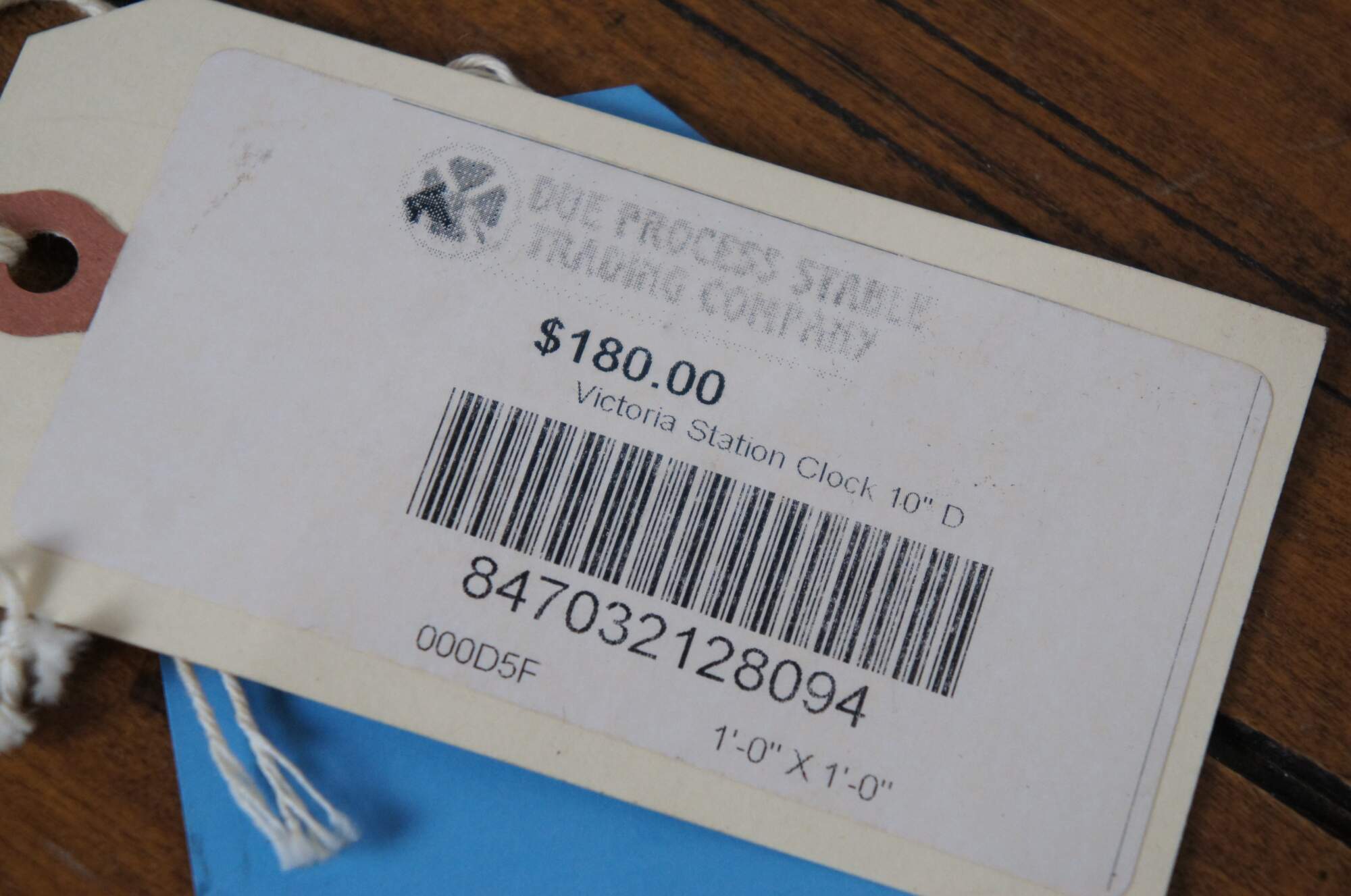 Late 20th century double sided railway clock styled after the famous clock at Victoria Station, London. Wrought metal wall mounted support and case in a dark bronze finish. 10 inch diameter printed face with faux distressing, Roman numerals, and the words Victoria Station 1747 in orange. Black metal hands. Young Town Quartz, battery operated movement.