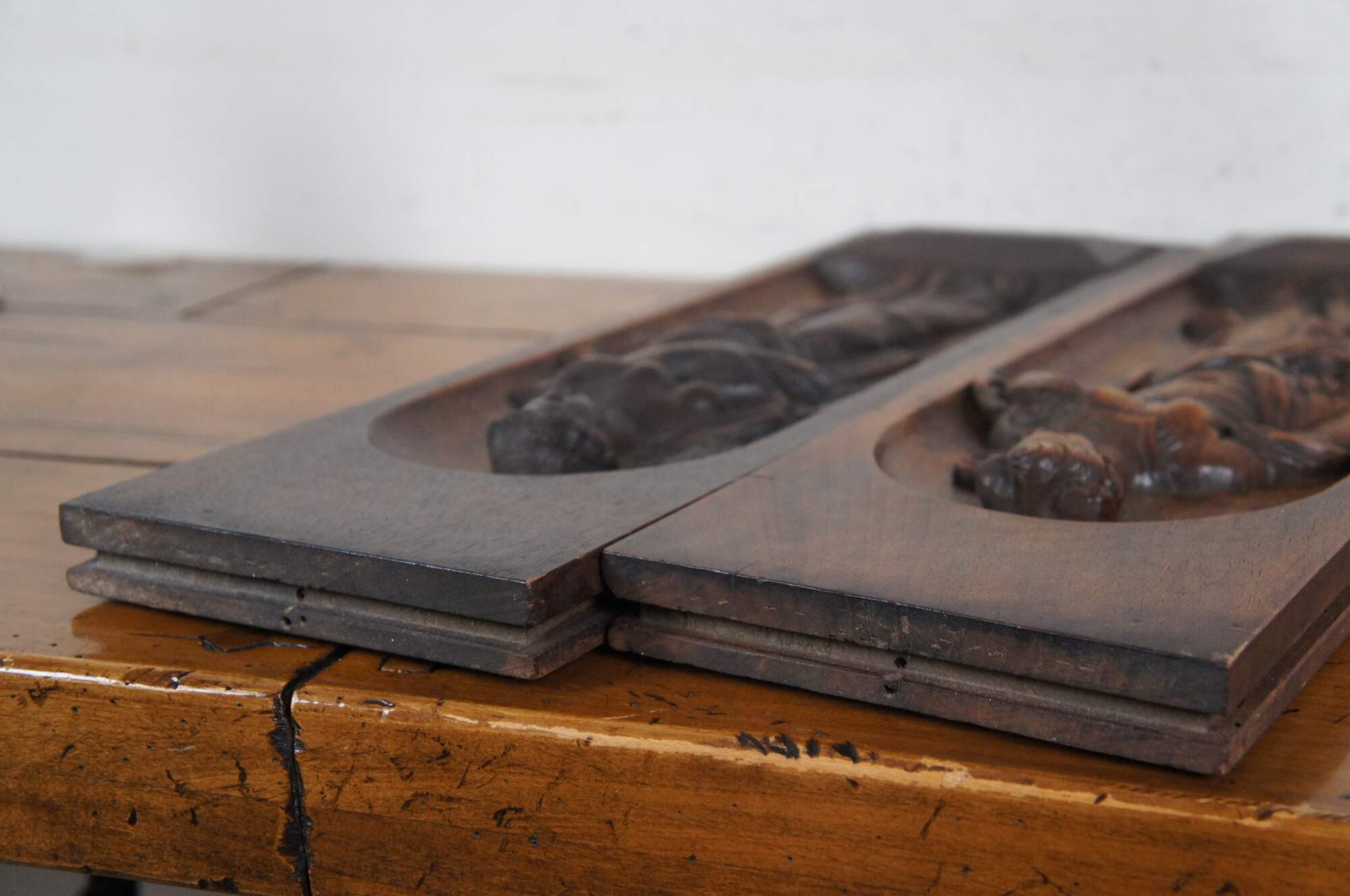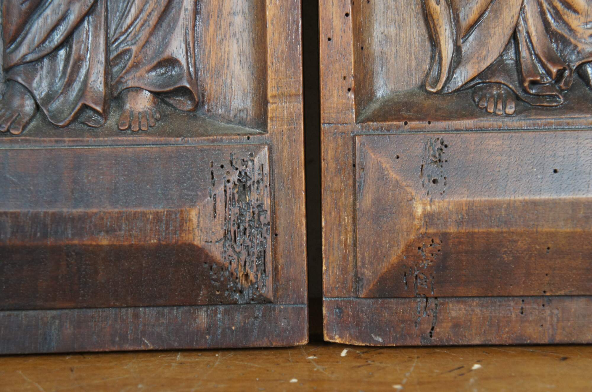 Pair of antique hand carved walnut bas relief panels / wall plaques, showing Neoclassical female figures, one holding sheaves of wheat and the other holding flowers.