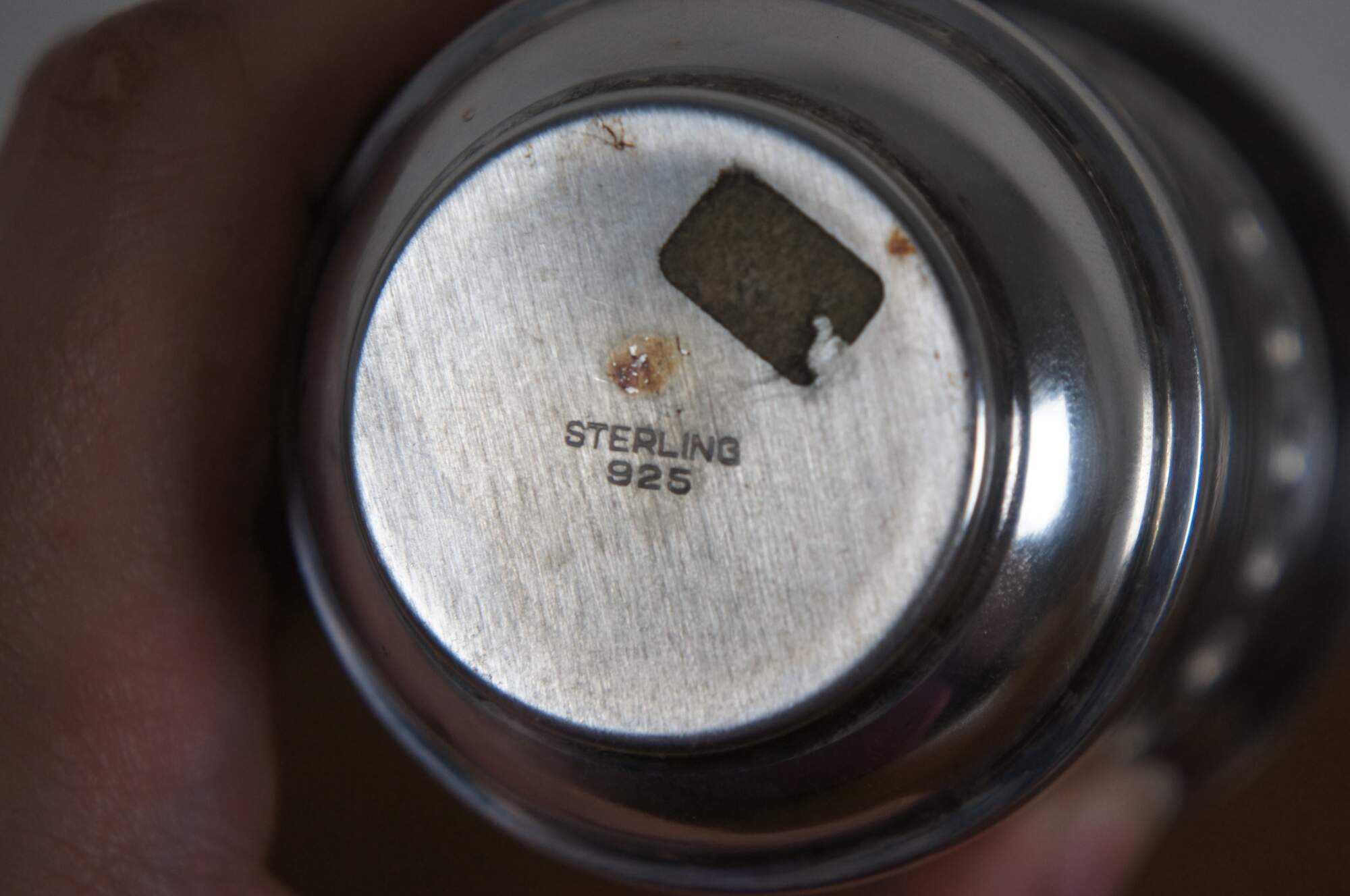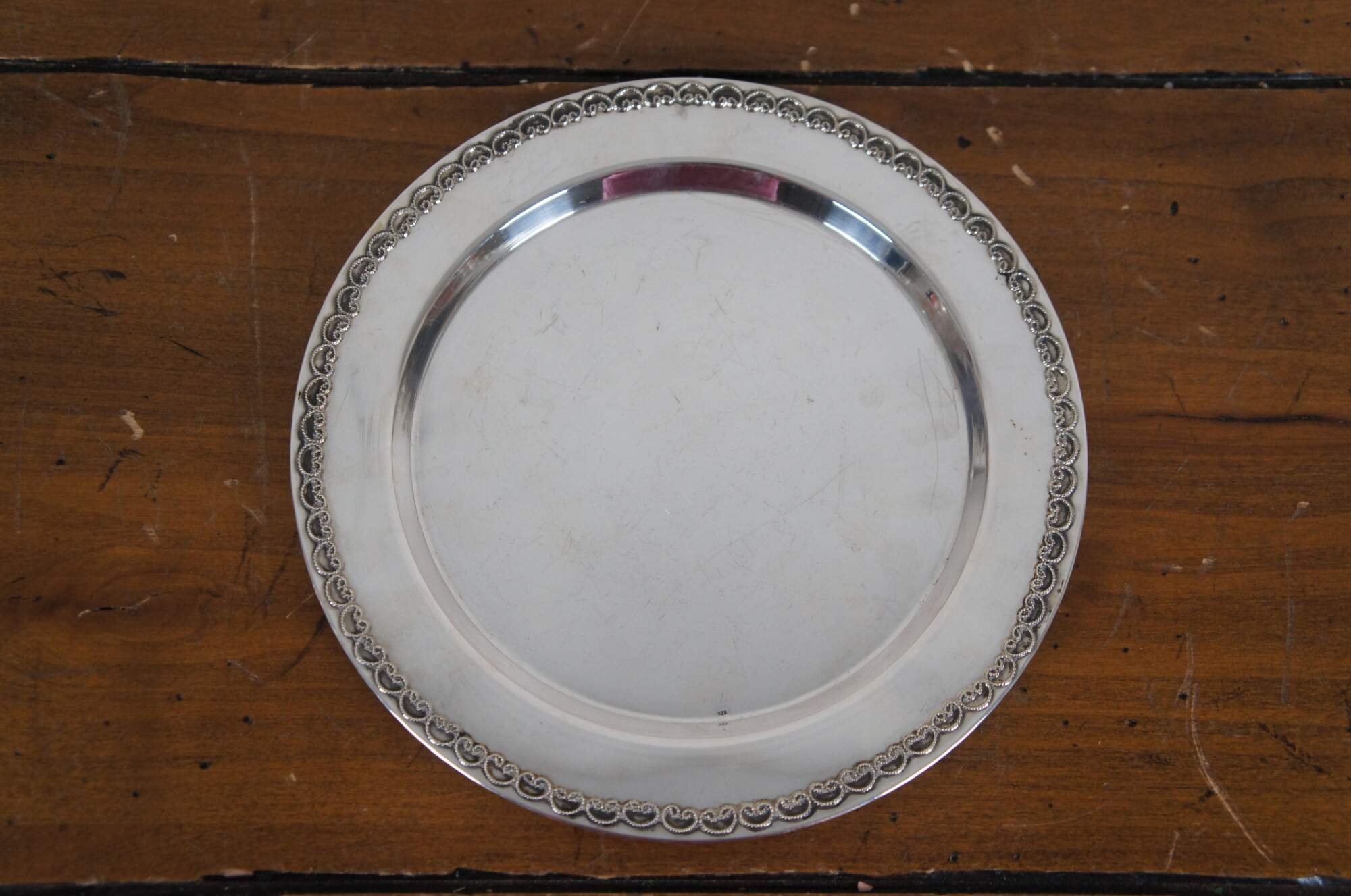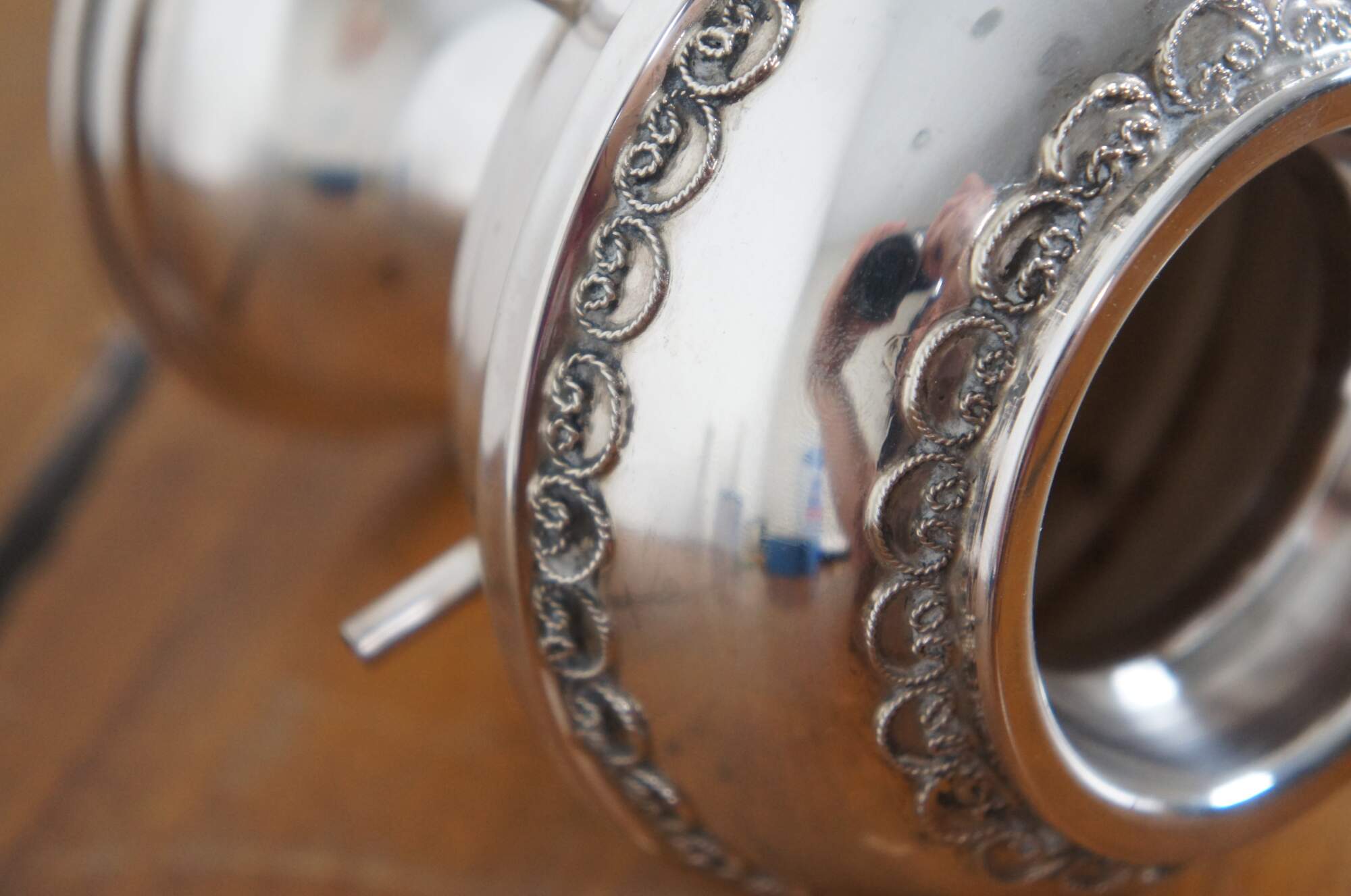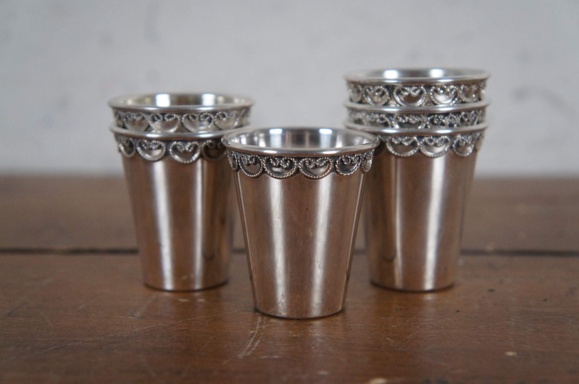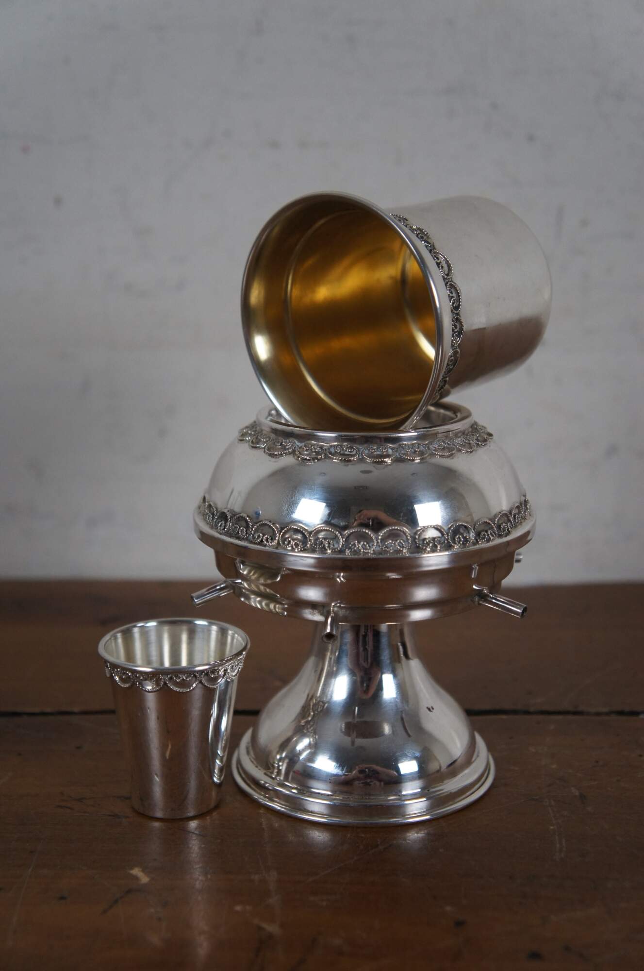 Vintage 925 sterling silver kiddush wine fountain set, decorated with bands of repeated filigree swirls. Set includes six cups, underplate, fountain and wine cup.