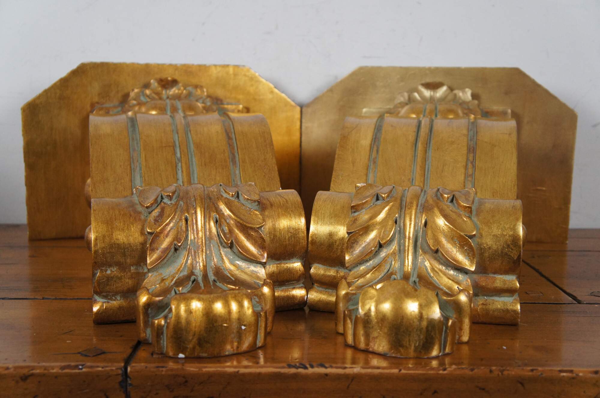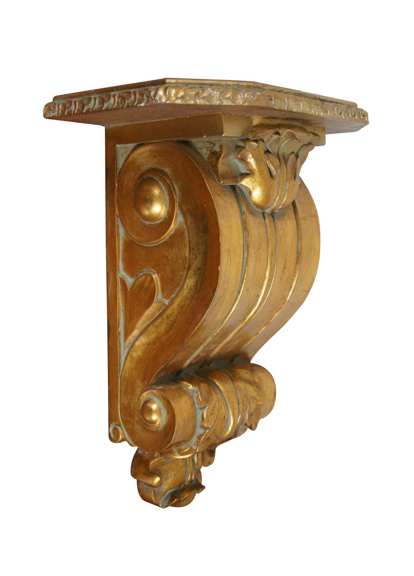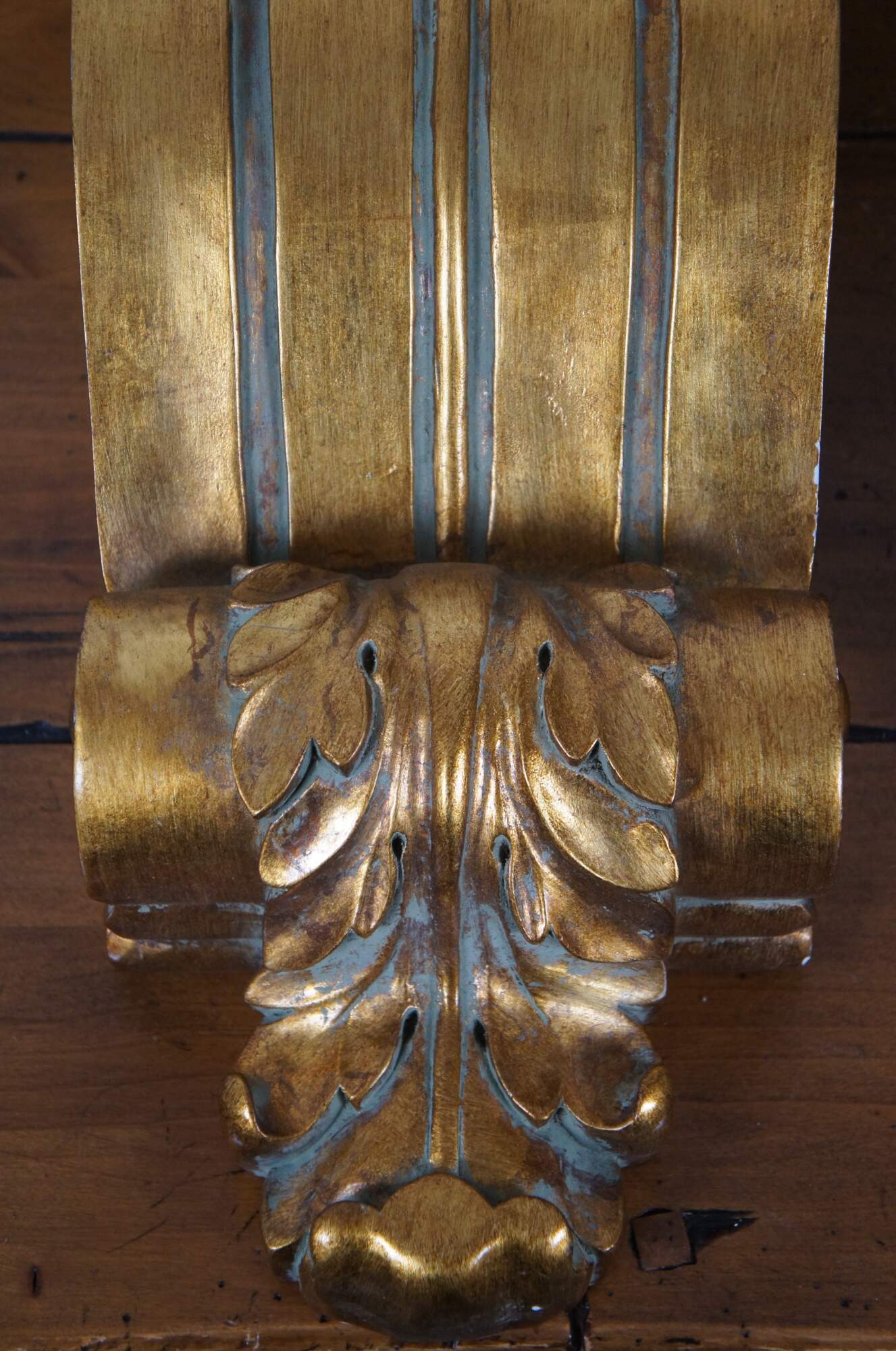 Pair of vintage 20th century giltwood corbels / wall brackets, featuring a grooved scrollwork body embellished with acanthus leaves. Rectangular top with clipped corners and foliate edge detail. WB-1016