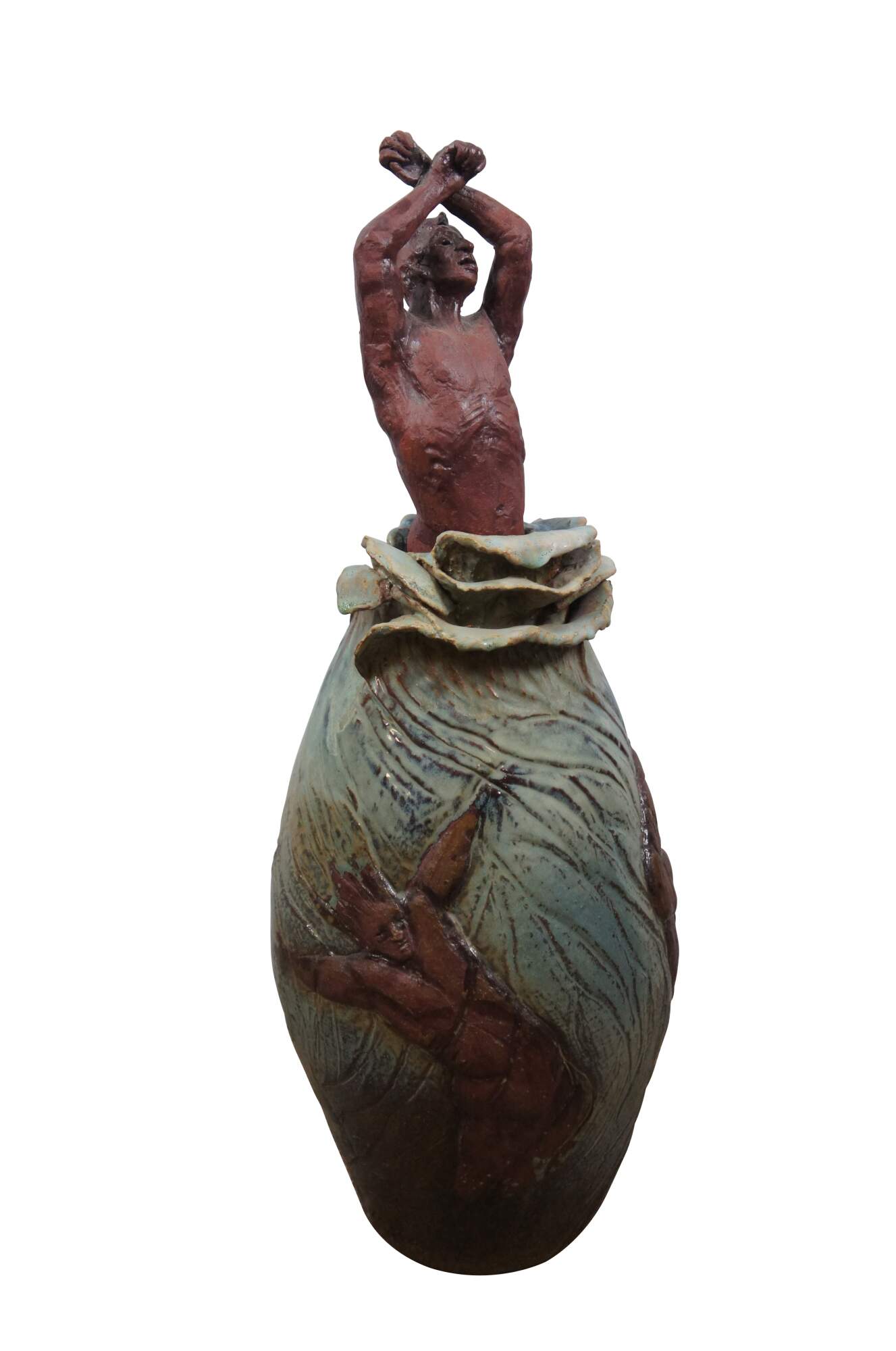 Vintage ceramic art sculpture by Bob Coates. Features a male figure emerging from the waist up from a swirling green base that resembles ocean waves or a veined flower bud, decorated with other brown figures in various dancing / falling attitudes. Signed Coates '02