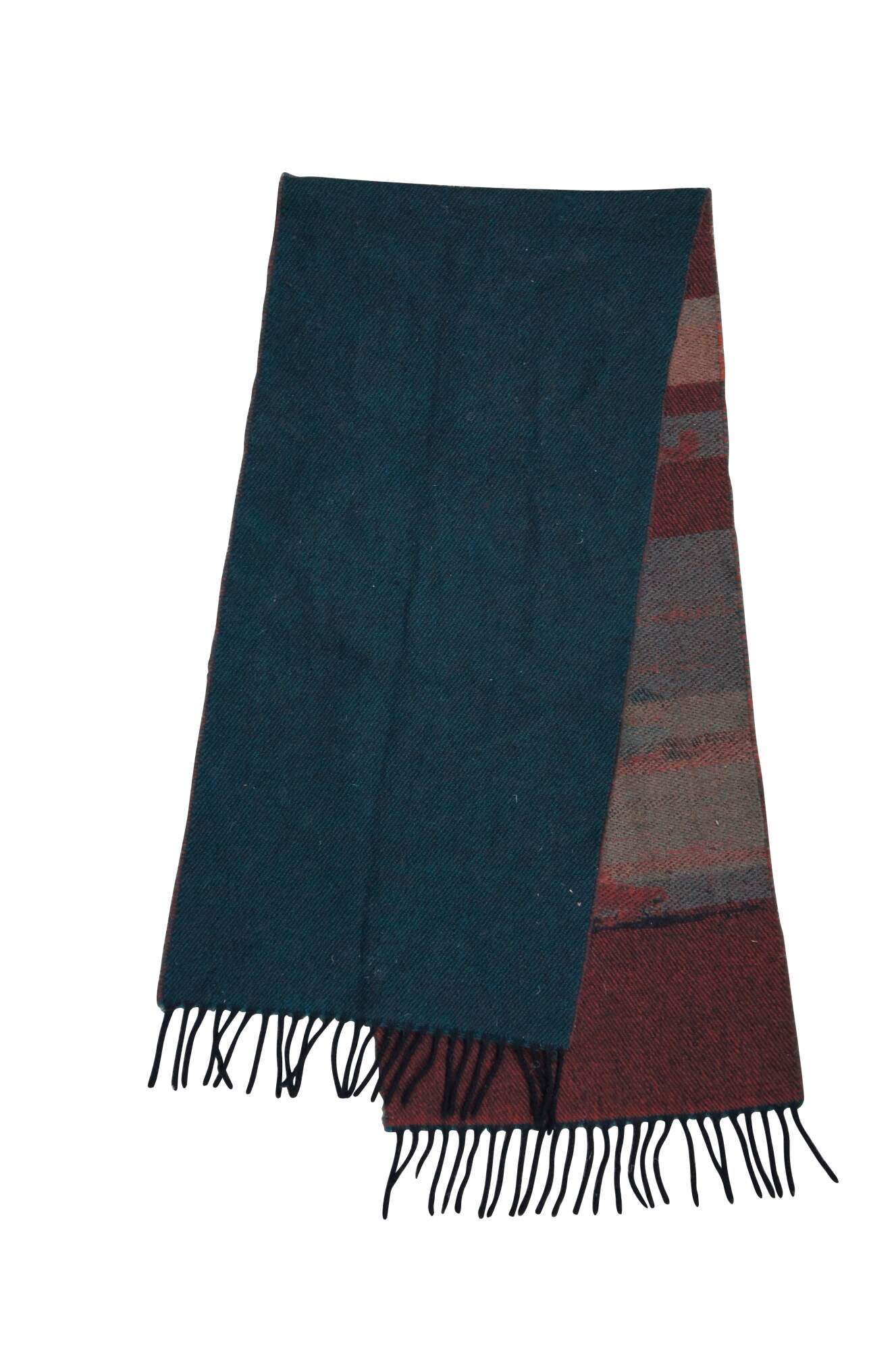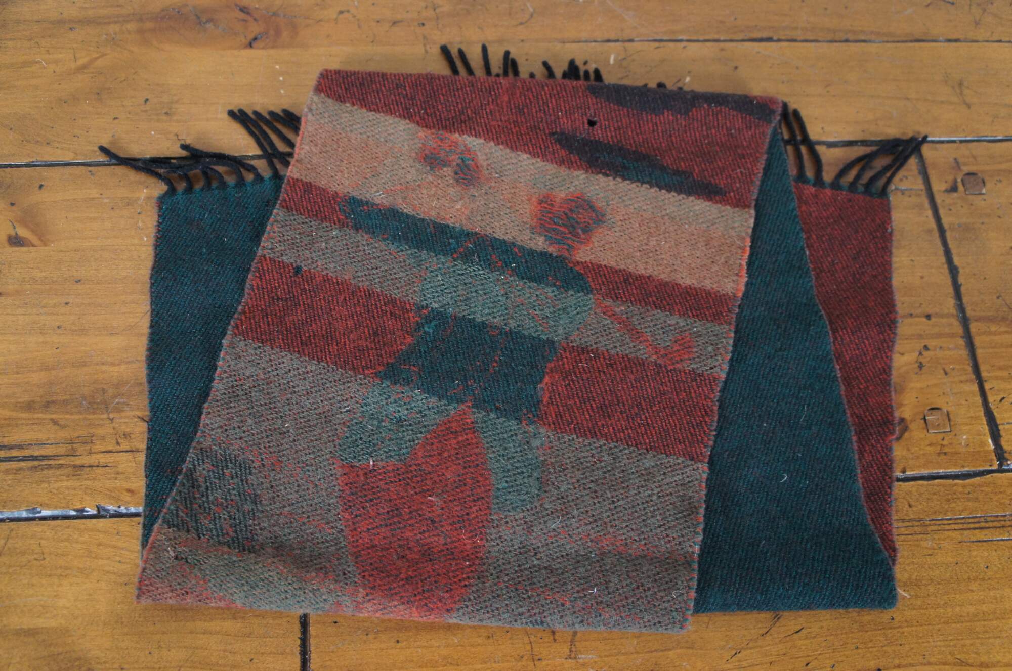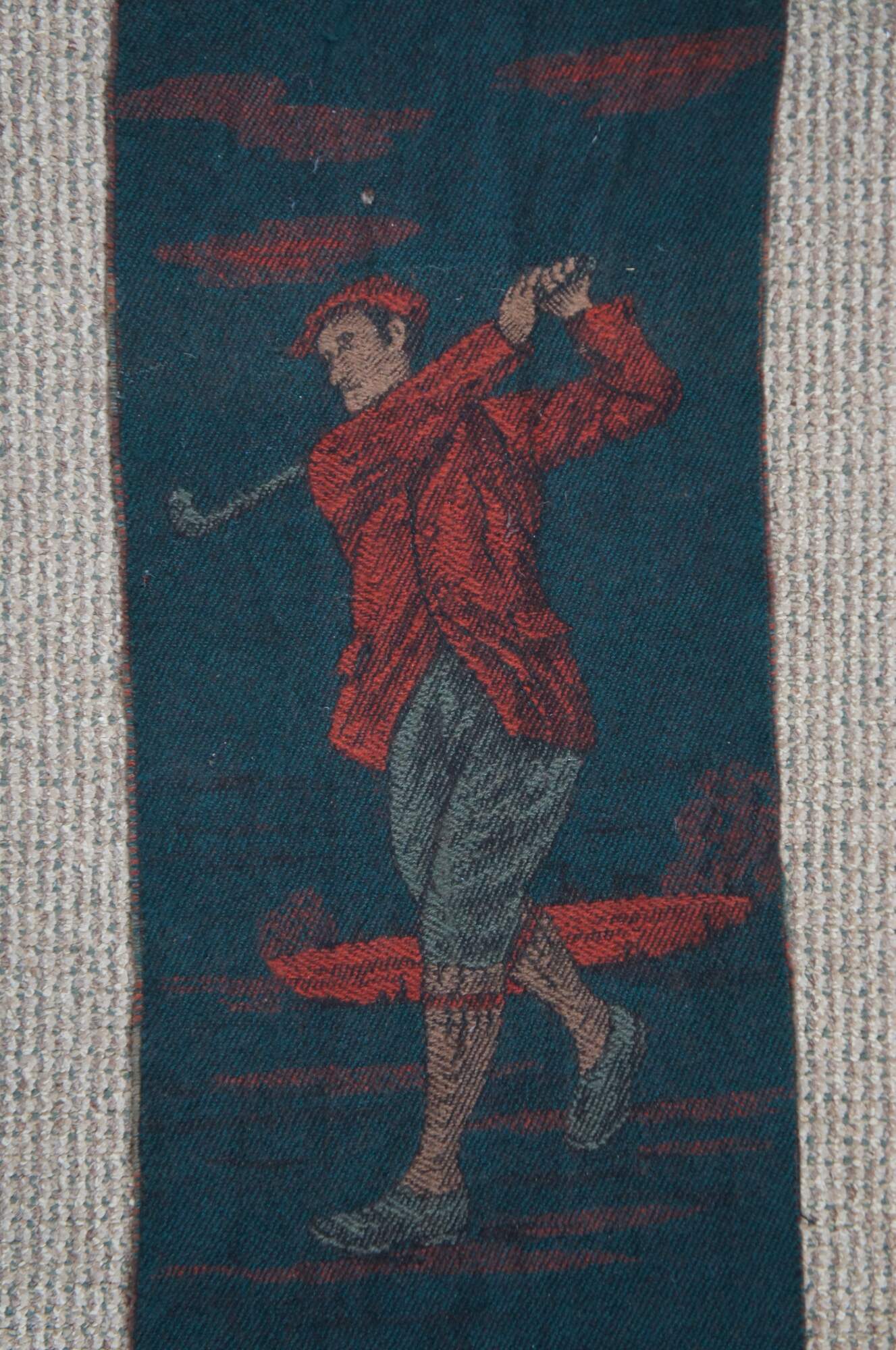 Vintage 20th century green and orange all wool scarf / muffler. Shows a golfer stepping into his swing. By Share of Lyon and New York. Made in France.