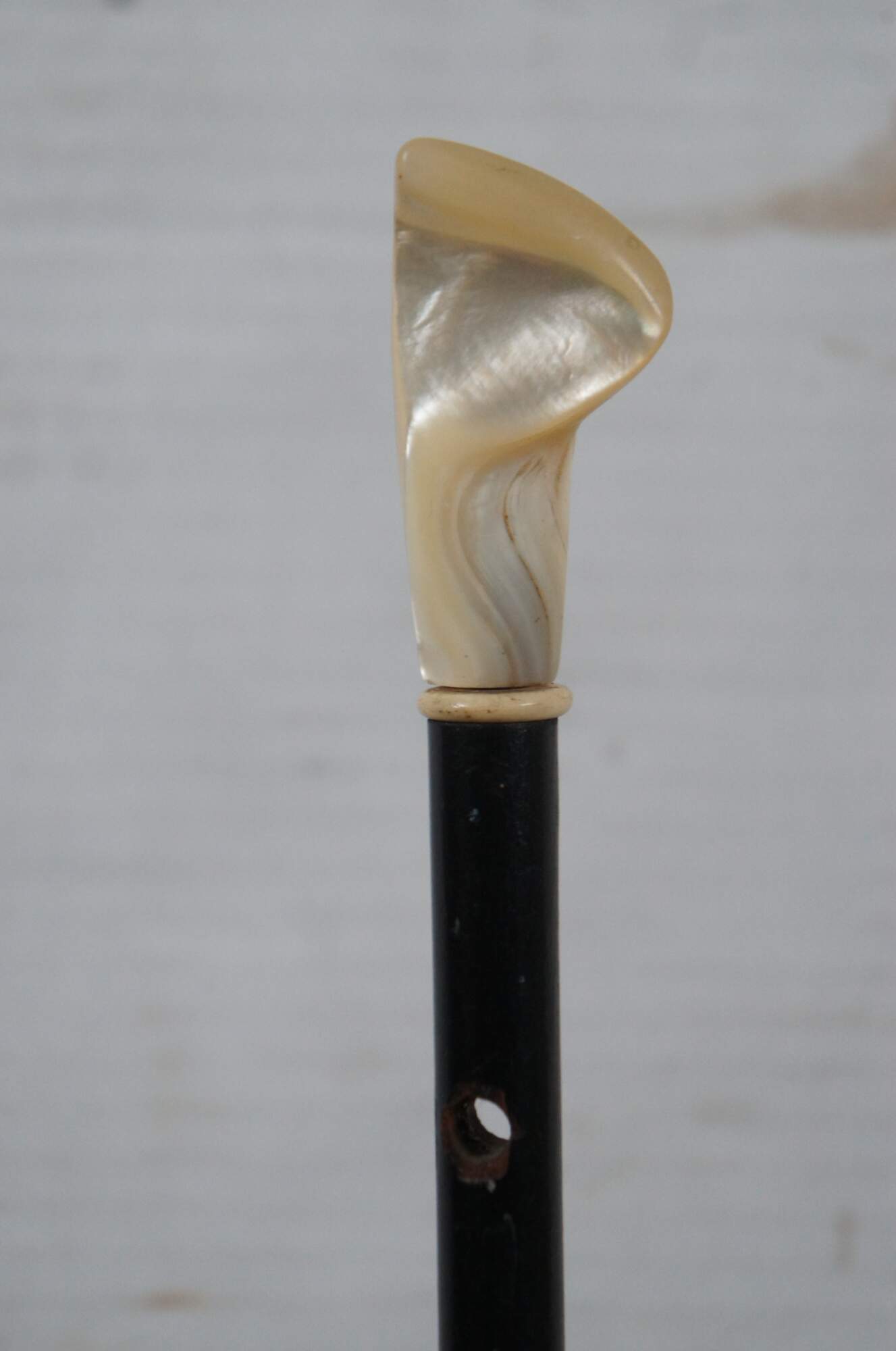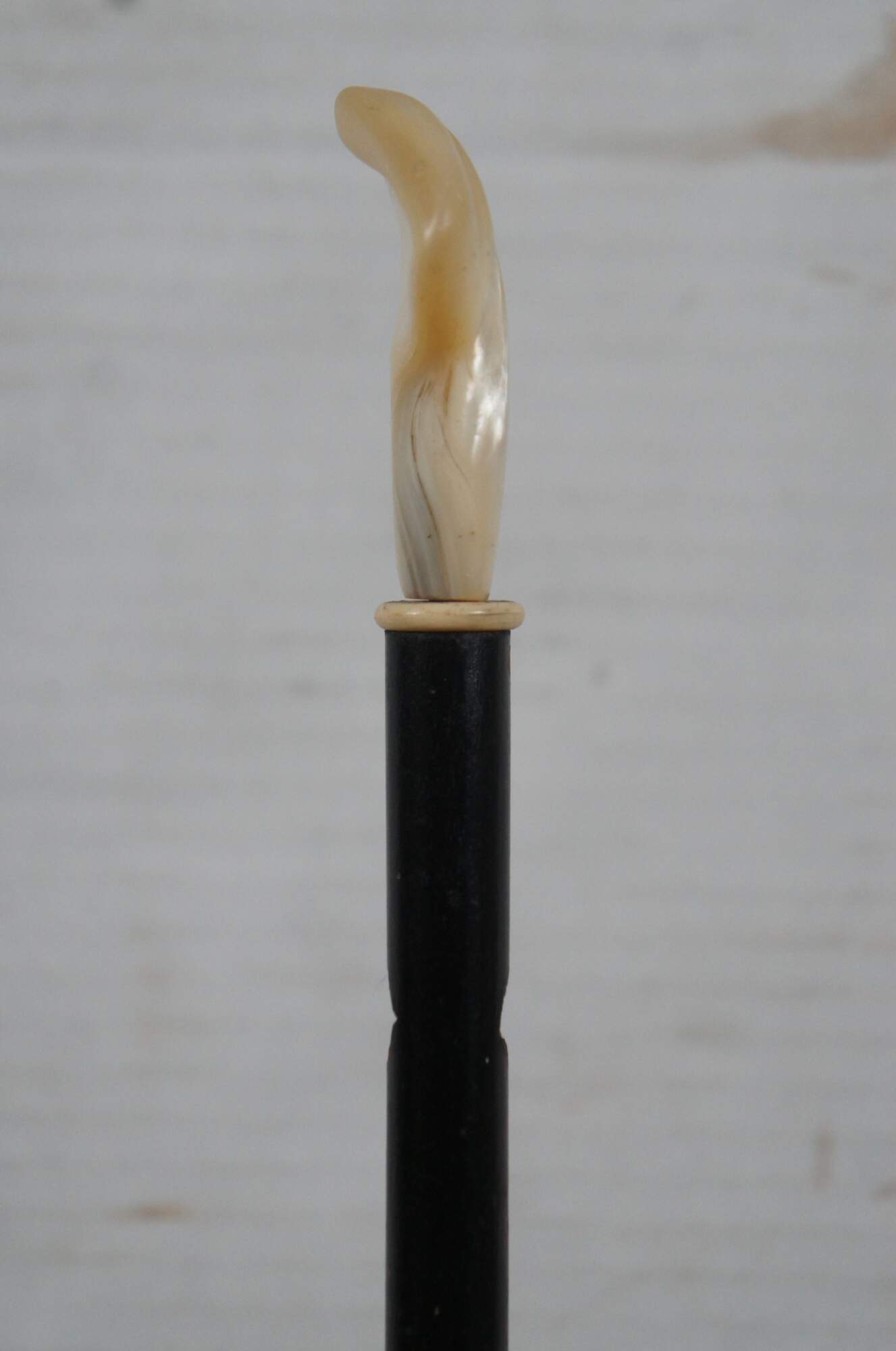 Late 19th century slim, wooden, black painted French walking stick / cane with horn ferrule and naturally shaped, polished mother-of-pearl knob. Hole drilled through upper part of shaft for a wrist strap.