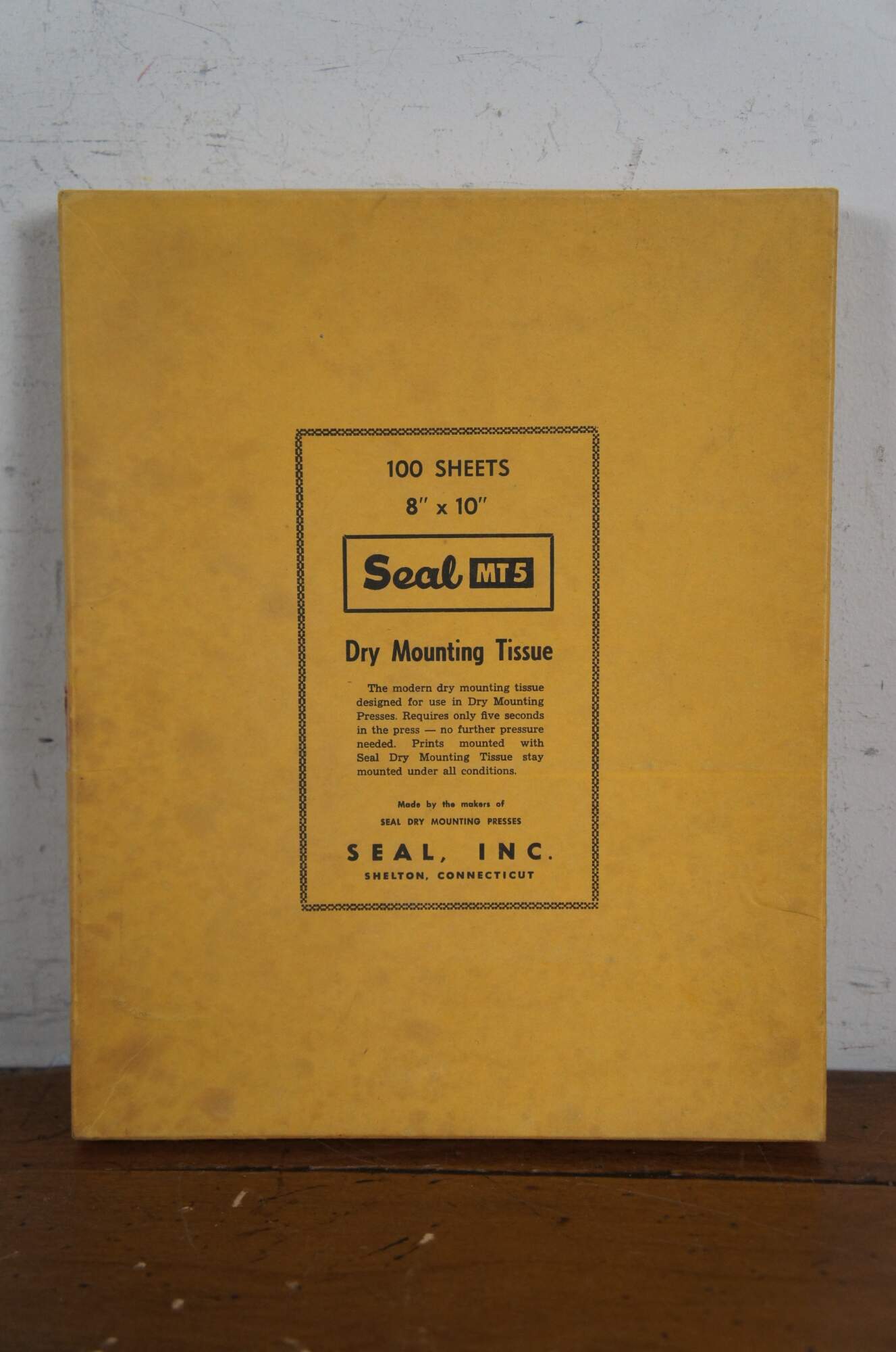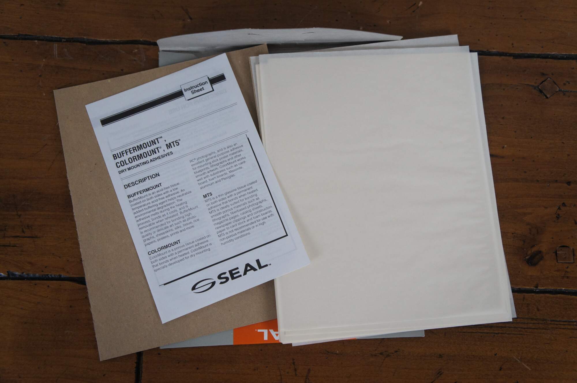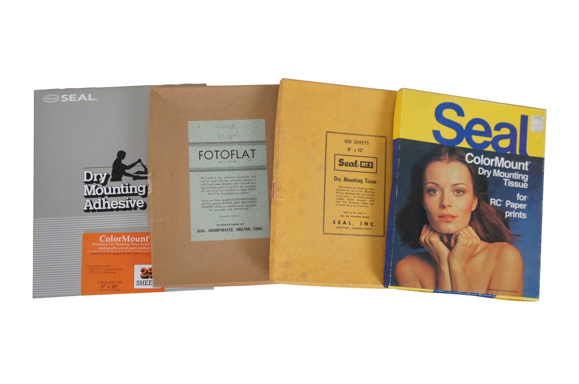 Lot includes: Seal ColorMount Dry Mounting Tissue (package sealed), Seal MT5 Dry Mounting Tissue sheets (open box), Seal Fotoflat dry mounting sheets (open box), Seal ColorMount Dry Mounting Adhesive (open box), and Seal Temperature Indicator Strips and Release Paper Sheets (open box). Open boxes are half to mostly full.