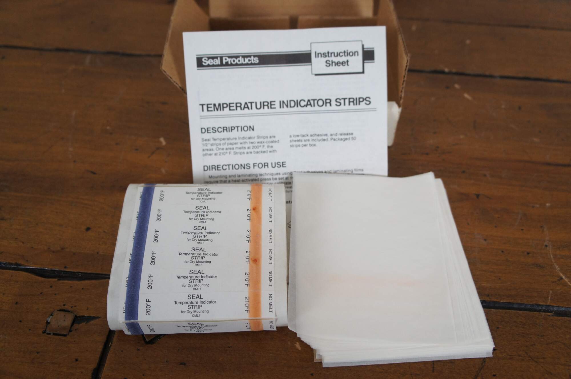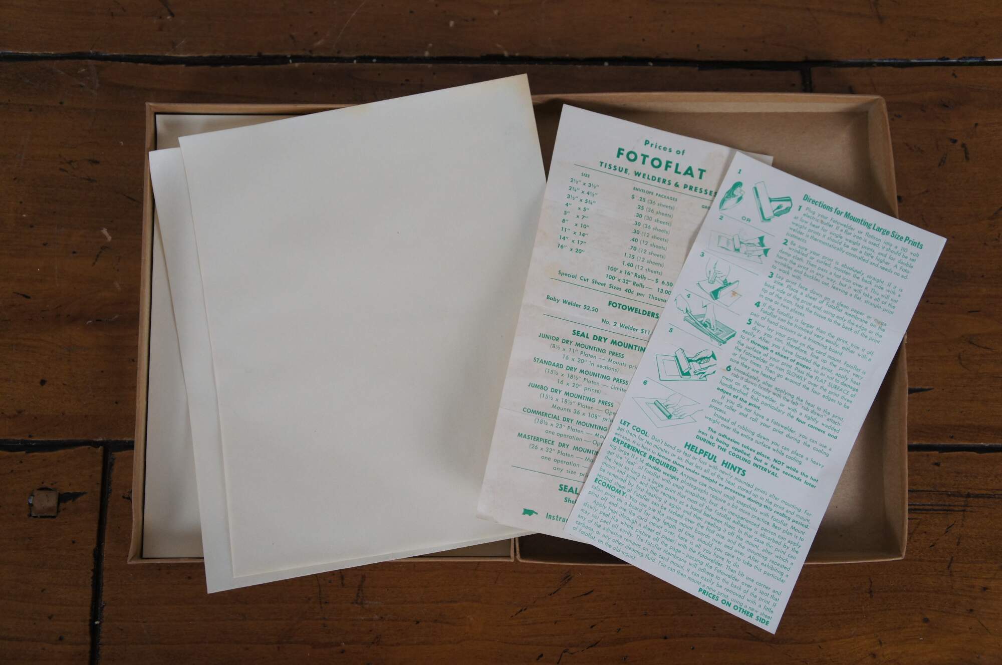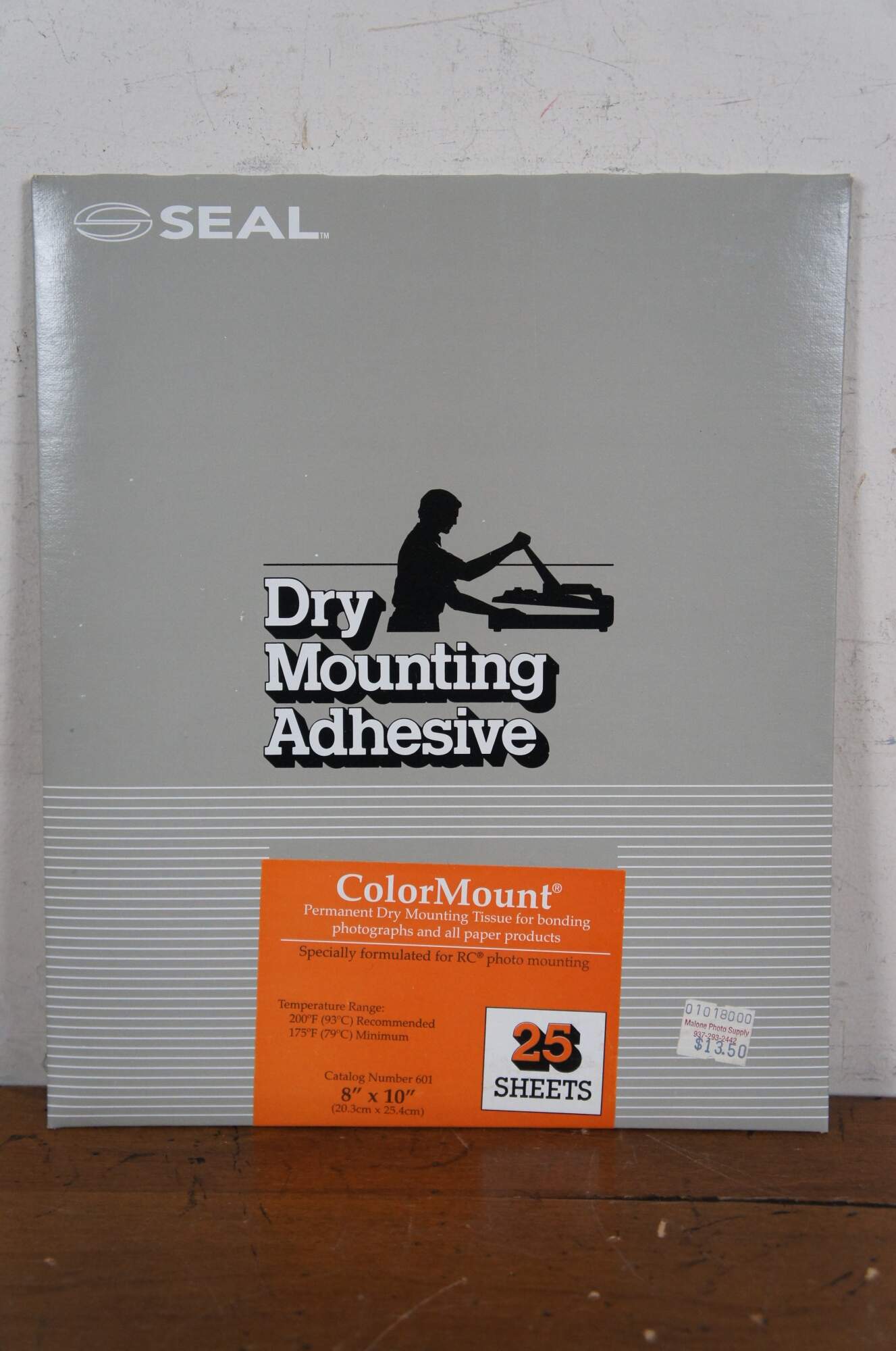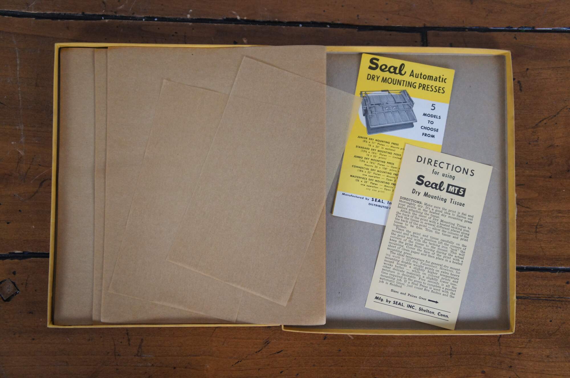 Lot includes: Seal ColorMount Dry Mounting Tissue (package sealed), Seal MT5 Dry Mounting Tissue sheets (open box), Seal Fotoflat dry mounting sheets (open box), Seal ColorMount Dry Mounting Adhesive (open box), and Seal Temperature Indicator Strips and Release Paper Sheets (open box). Open boxes are half to mostly full.