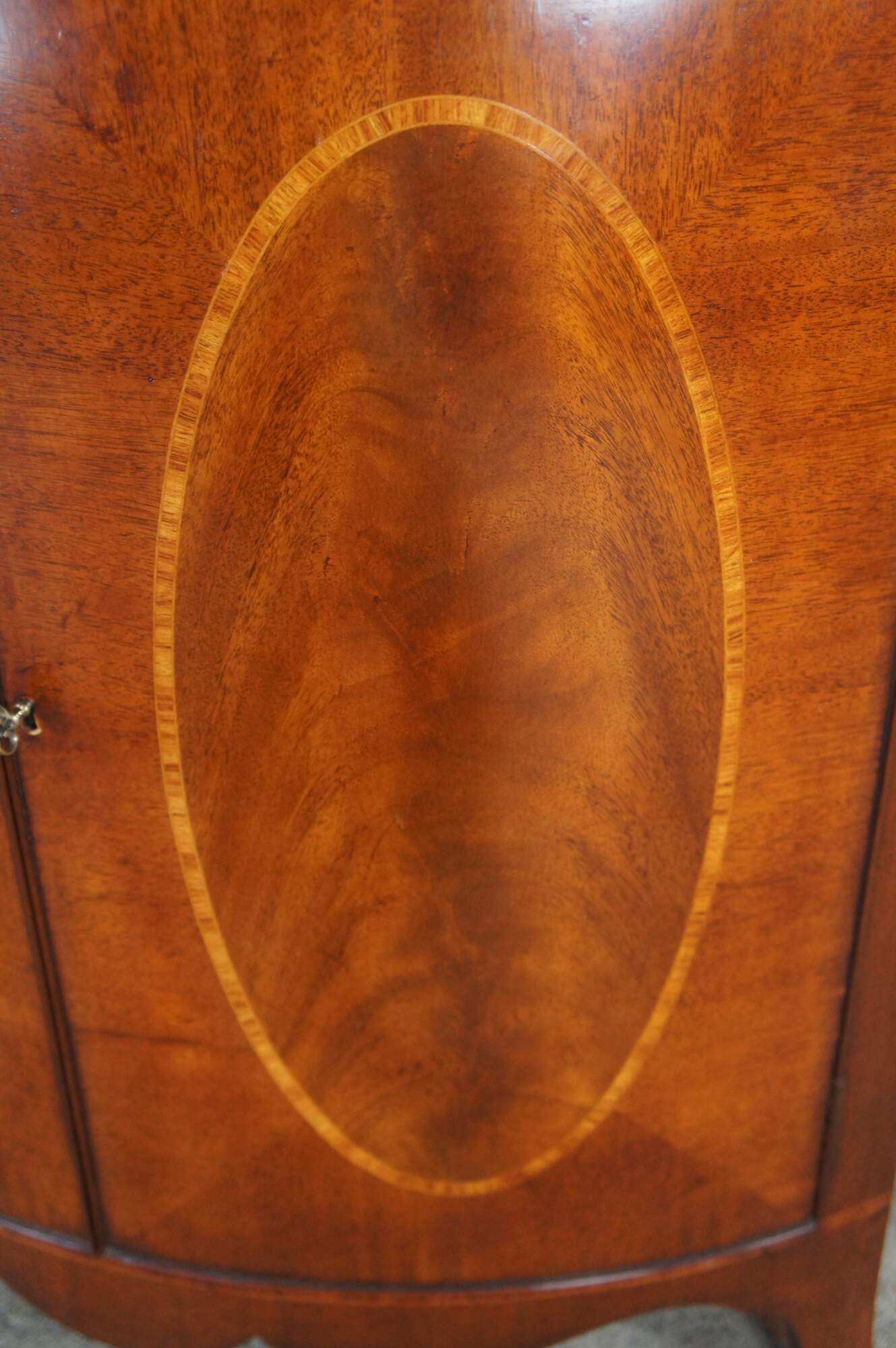 A petite English corner cabinet by Arthur Brett, circa 1980s. Features a curved form made from mahogany with a tall glass covered hutch, having ornate fretwork and two interior shelves. The base showcases two lower doors with crossbanded crotch mahogany panels and inlay. Opens to one removable shelf. The cabinet is supported by splayed legs between a serpentine apron. Crown is open pediment with turned trophy finial. Makers mark along backside. The cabinet breaks down intwo three pieces for ease of movement. Includes lock and key.