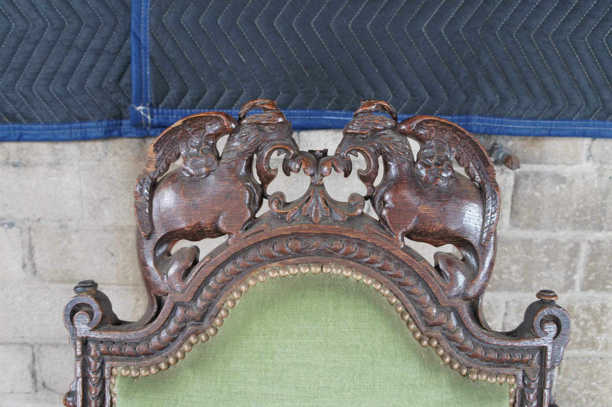 Fair; wear, distressing, scuffing, chipping and edge wear. some missing carvings, most notably the right side of the griffon on the arm.