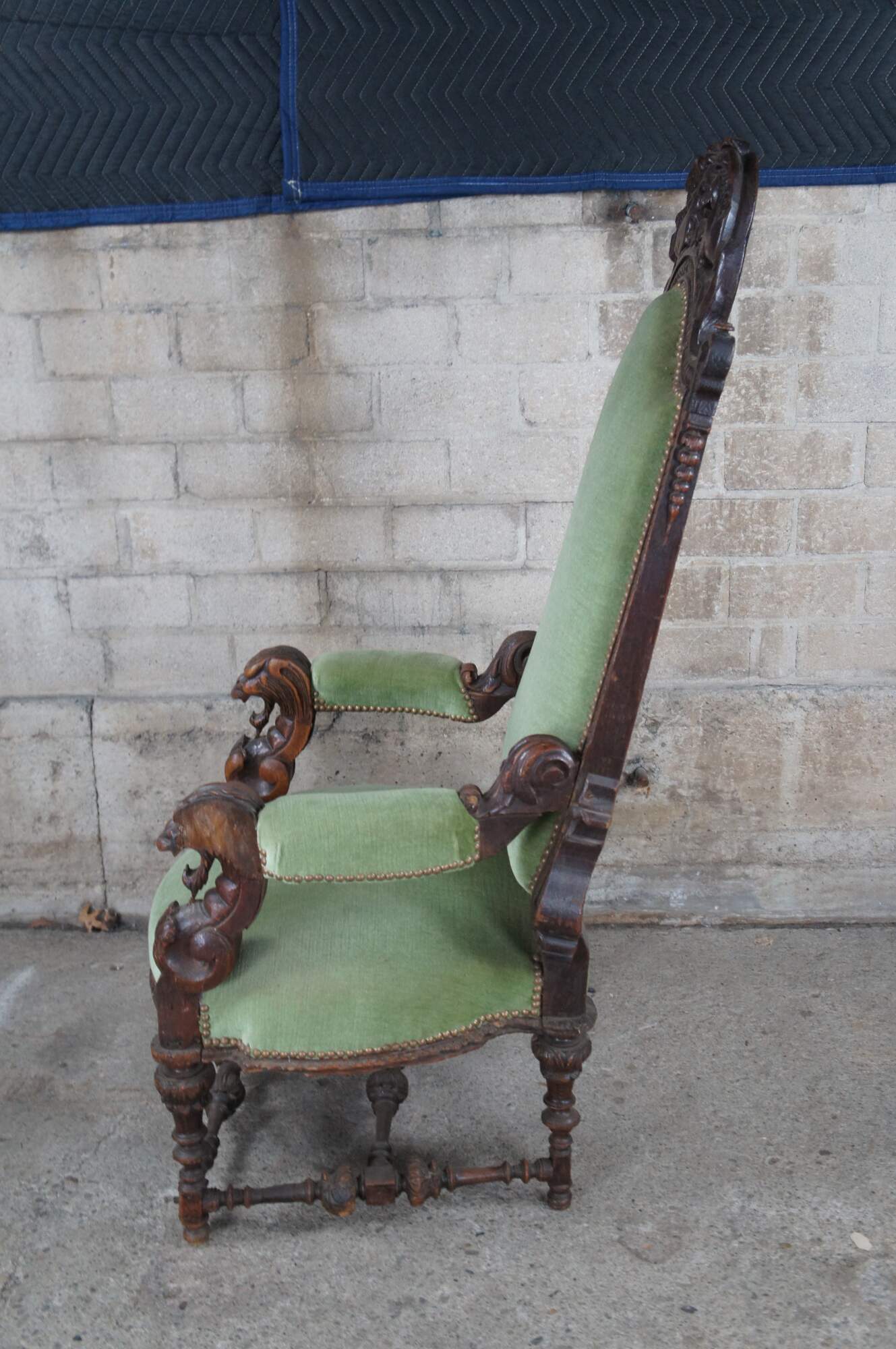 An antique Victorian arm chair, circa 1880s. Features a high back with figural Gothic flair. Crafted from oak with intricate carving thoroughout. Upholstered in a green velvet with brass nailhead trim.