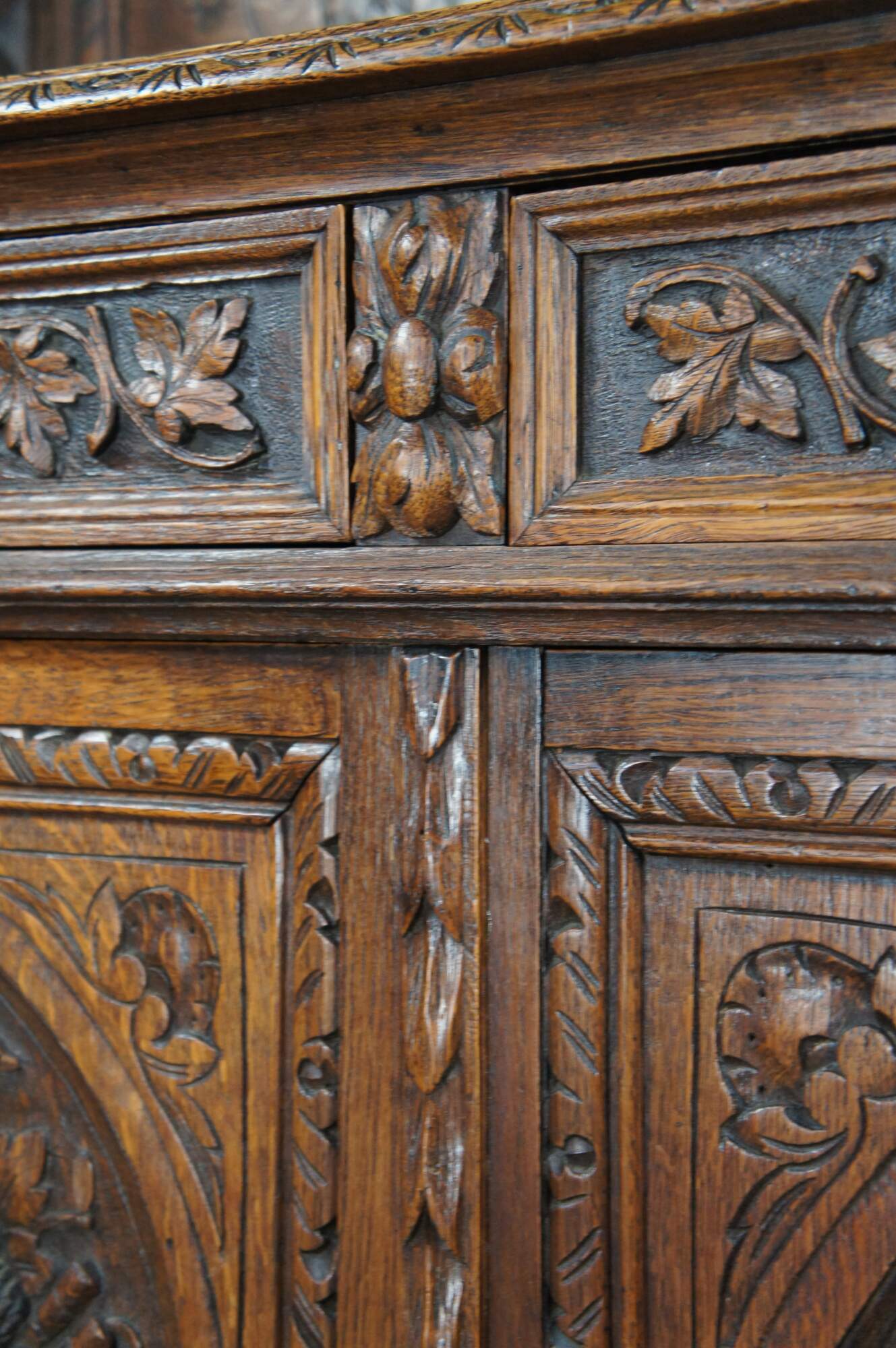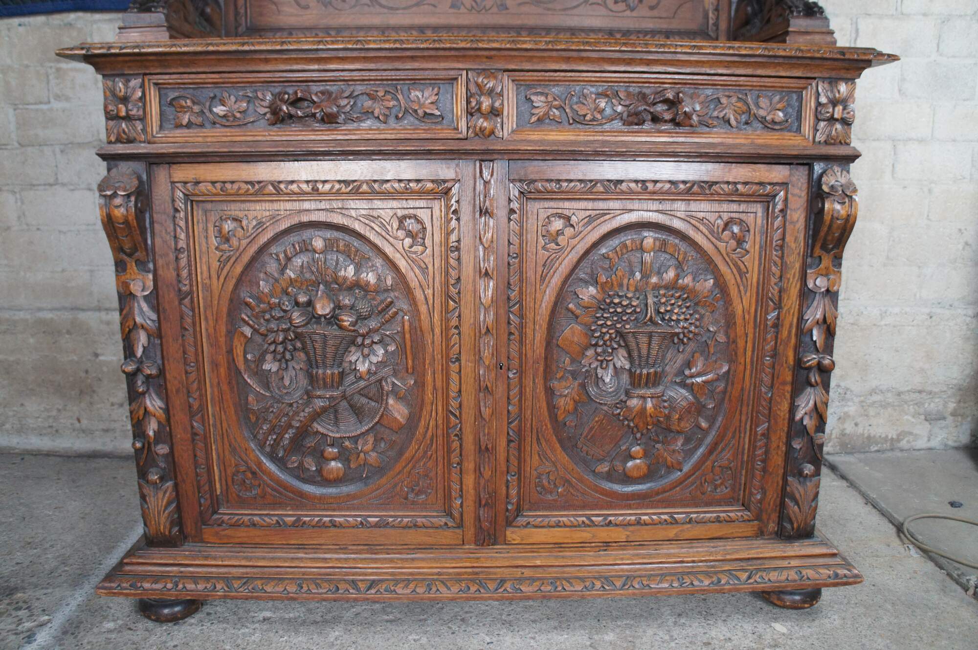 Exceptional Antique 19th Century Renaissance Revival Hunt Cabinet. Hand carved from oak with an upper display portion raised over a figural griffon carved backsplash. Features low relief carved doors with neoclassical motifs showcasing a basket of fruit over a quiver, foliate and leaves. Interior opens to two adjustable shelves. The outer stiles of the hutch are carved with figural spandrels over an acanthus and berry motif. Crown is centered by a prenounced gargoyle motif between a leaf and vine motif set between French medallions.