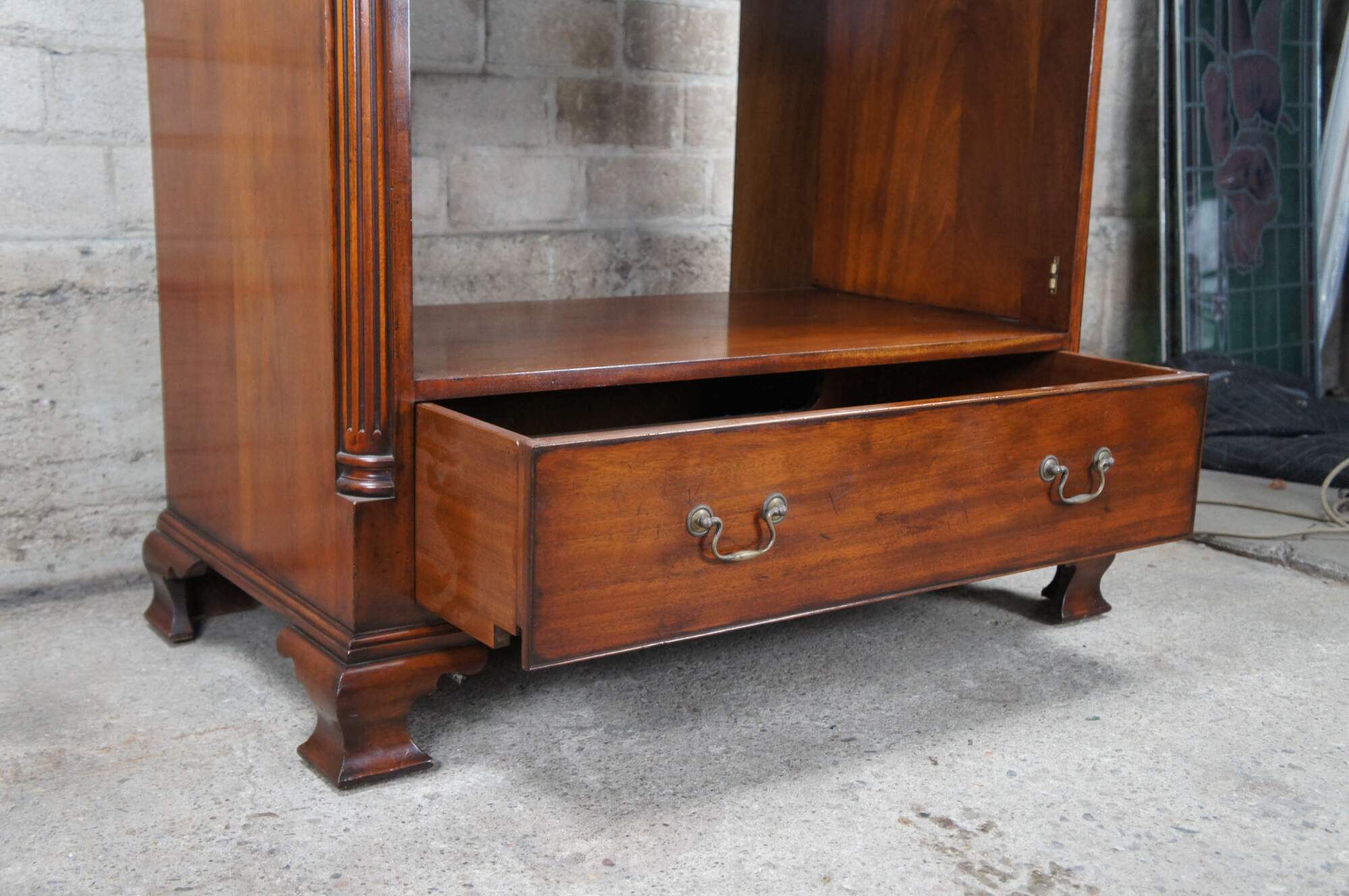 An exquisite 18th Century reproduction in the form of a mahogany bachelors chest by Arthur Brett. Features a faux 2 over 4 drawer graduated design which draws forward and slides back to reveal an interior compartment intended for a television. Interior compartment can also be used as a drybar or other accessory storage. The cabinet is fitted with one lower drawer and drop lid allowing for ease of use with electronics / setup boxes. The corners also known as "stiles" showcase quarter cut fluted columns. The case is supported by Ogee bracket feet. A truly exceptional example of craftsmaship and world class design. Makers mark along backside.