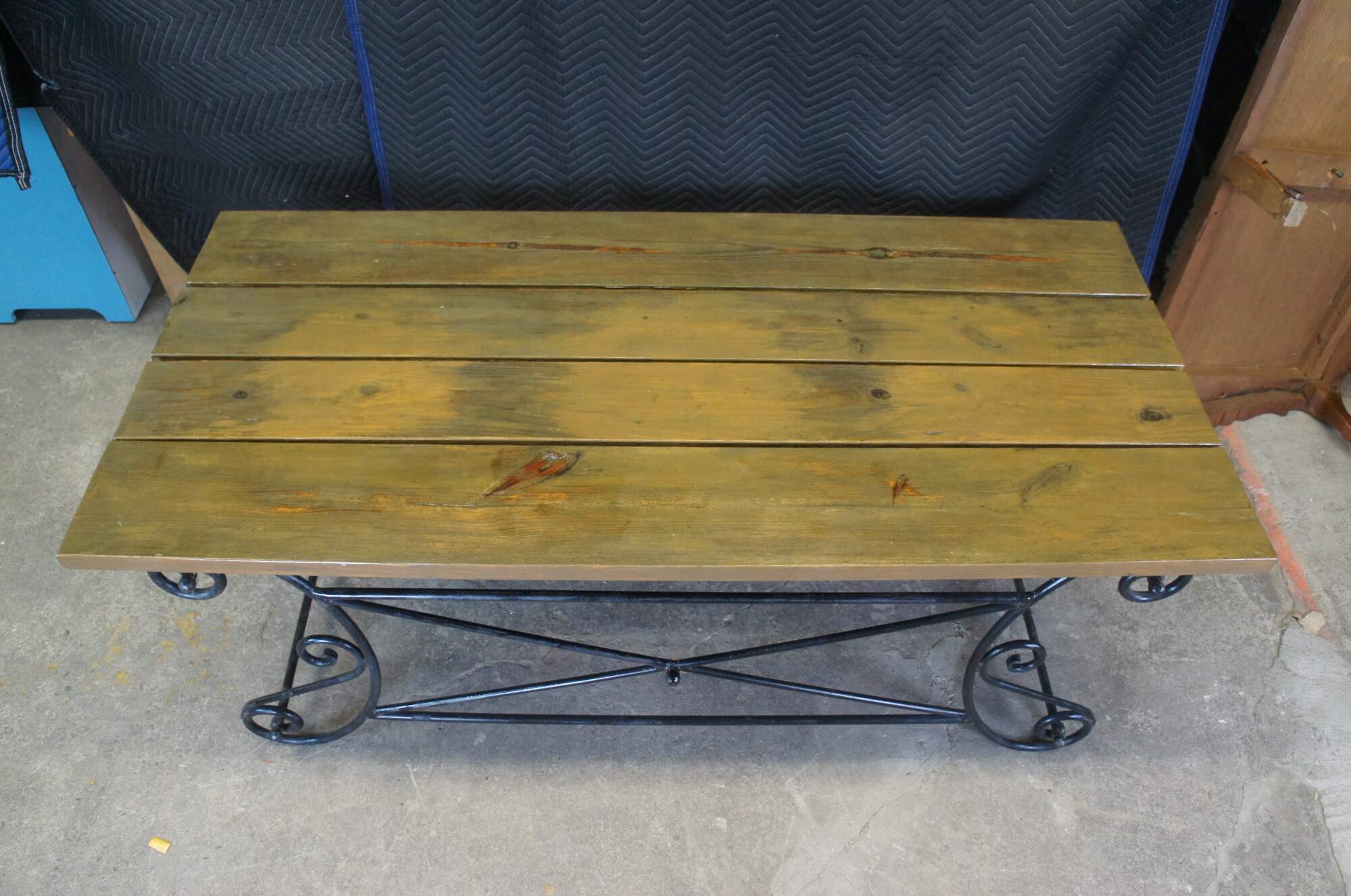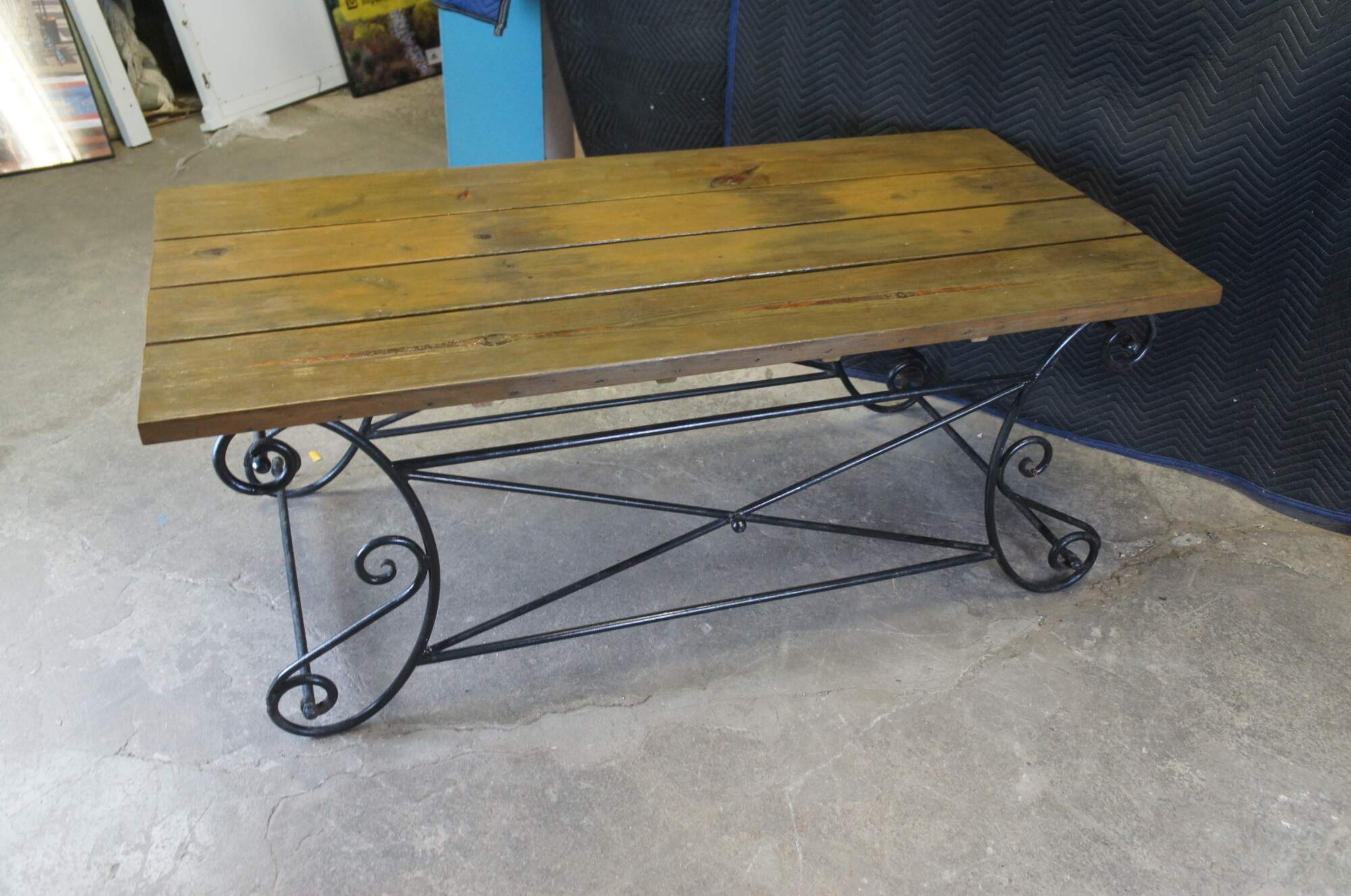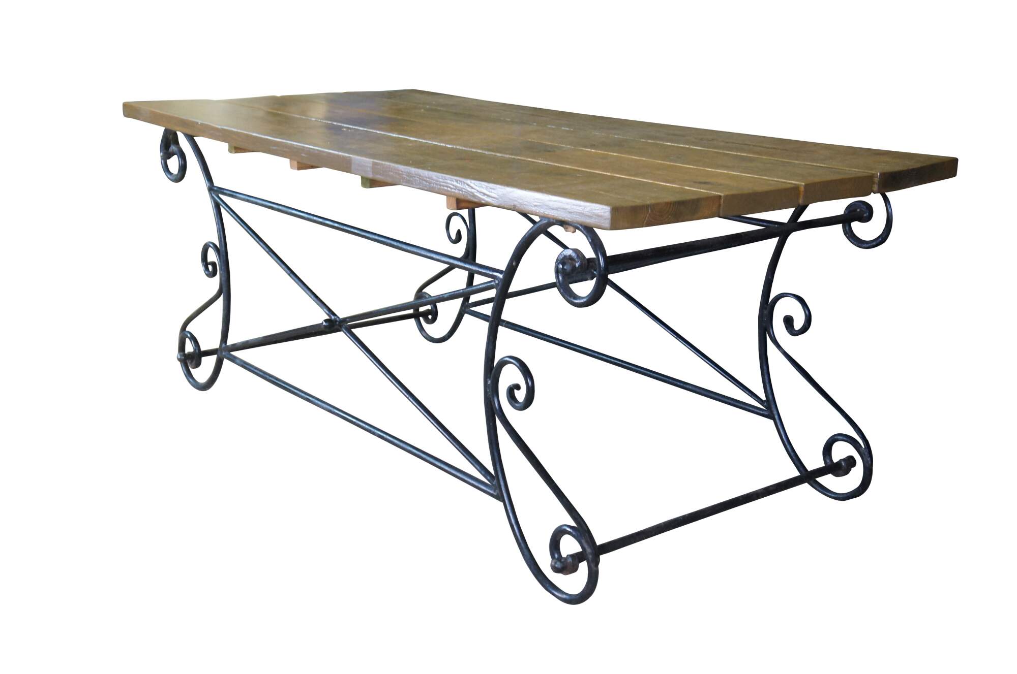 Vintage directoire / farmhouse style outdoor table. Made of iron featuring scrolled accents and pine plank top.