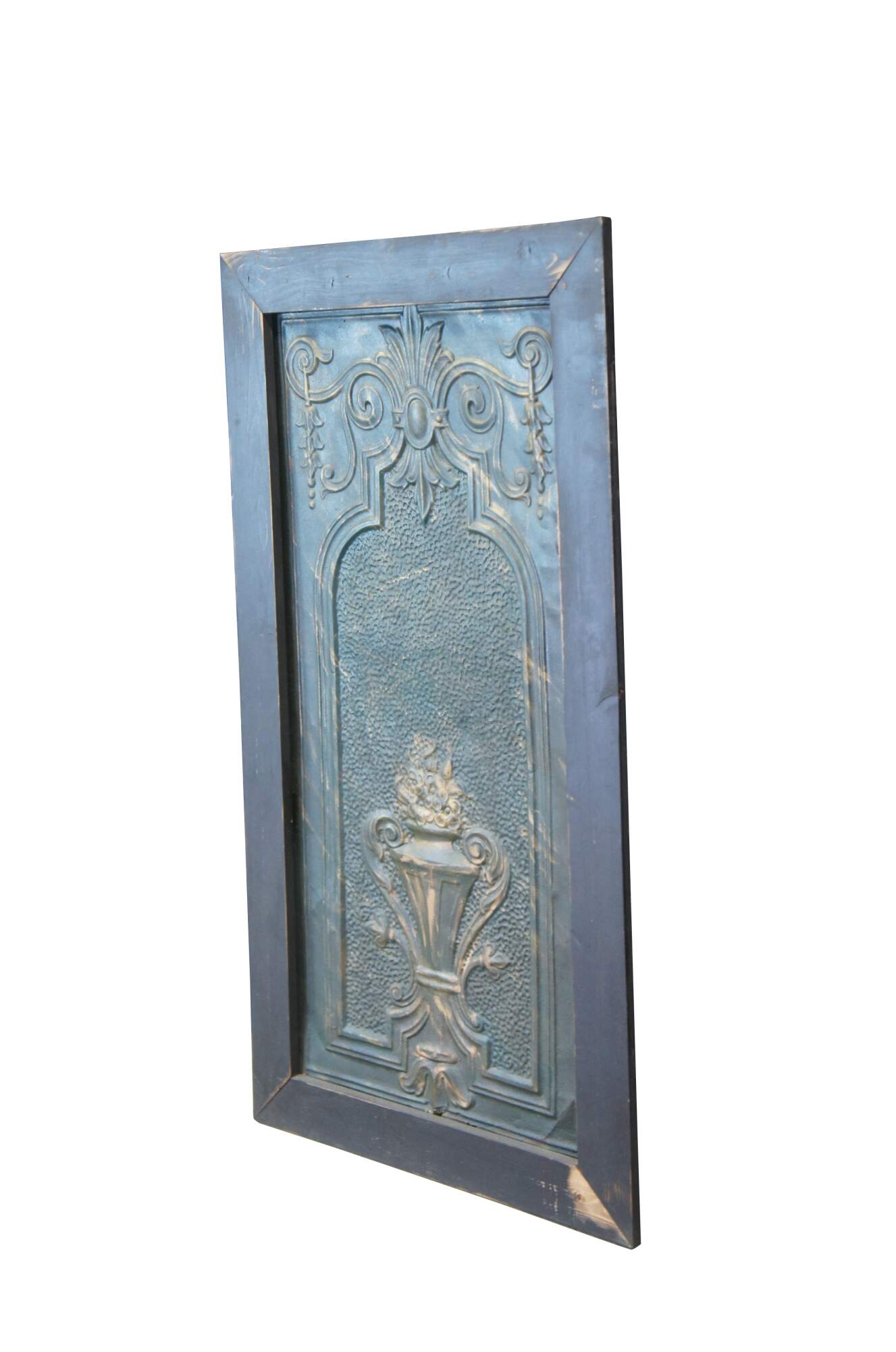 Vintage decorative embossed and hammered tin panel featuring a trophy urn with flowers, fleur de lis and acanthus accents.