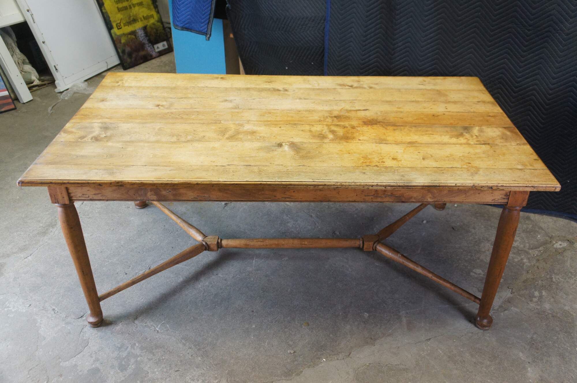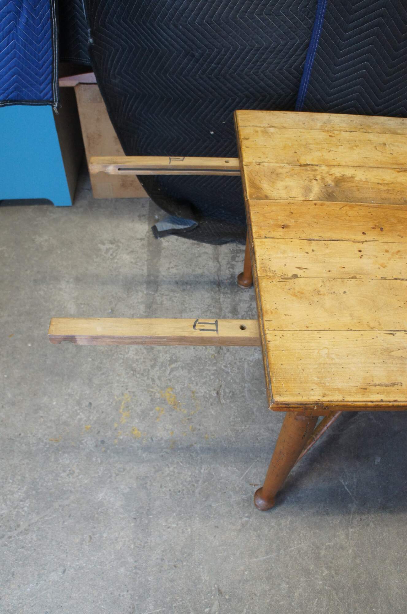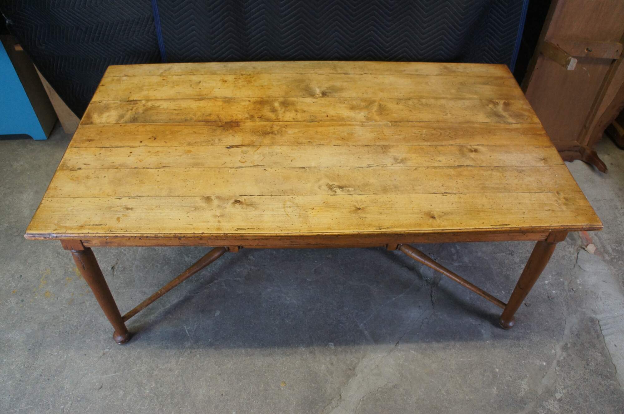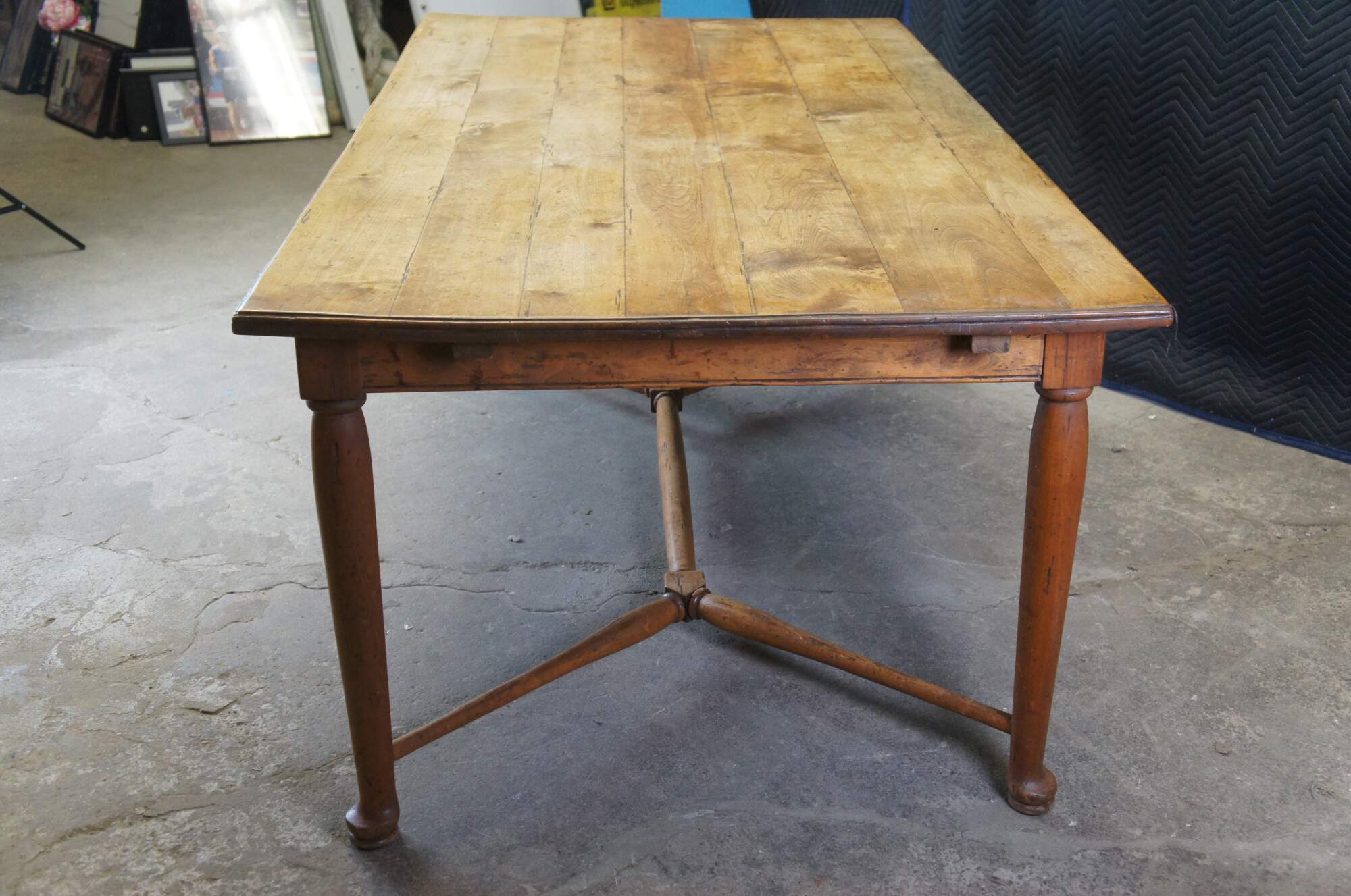 Antique primitive country farmhouse dining table. Made of pine featuring a plank top with slipper feet connected by trestle base stretcher.
