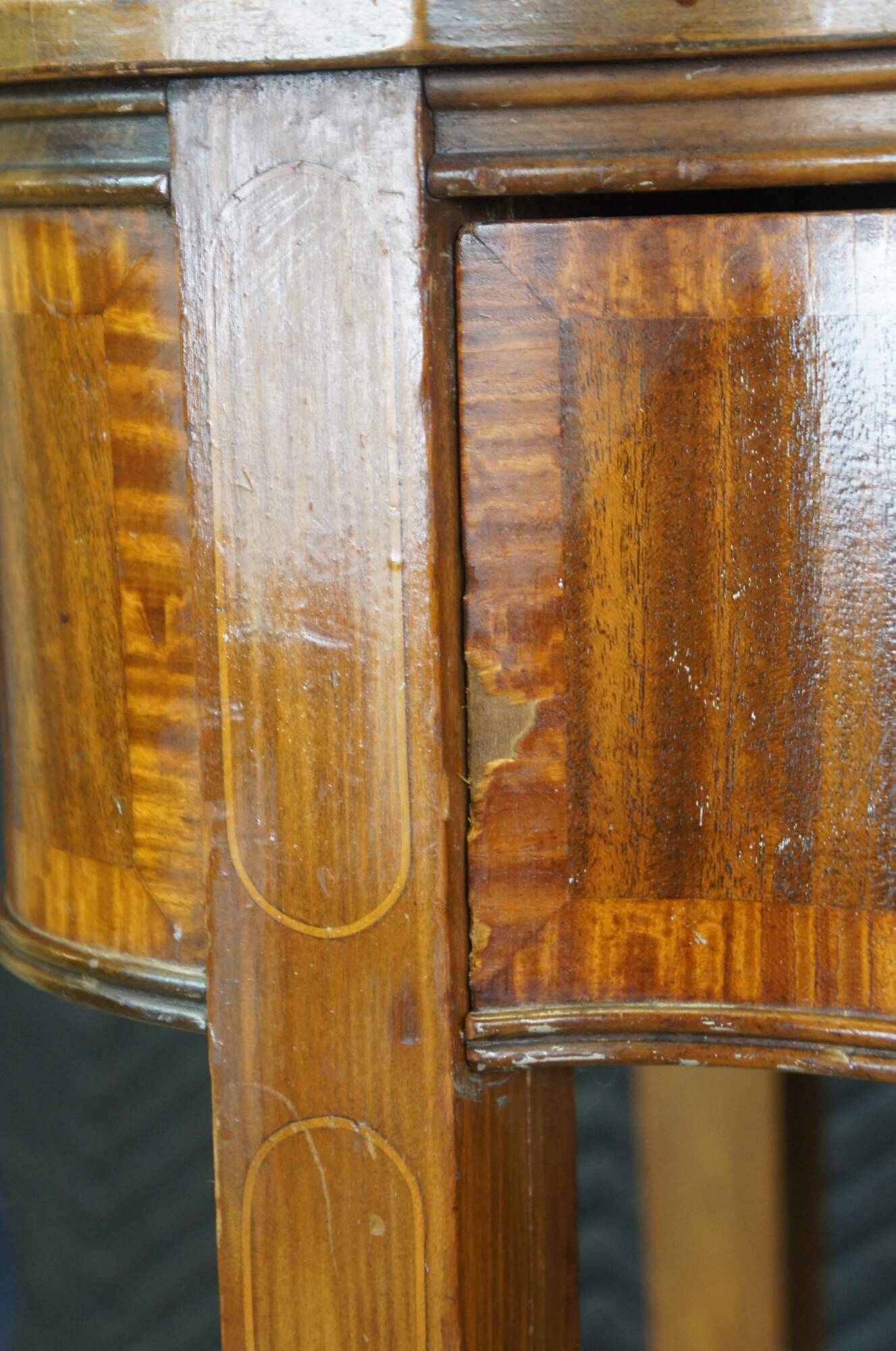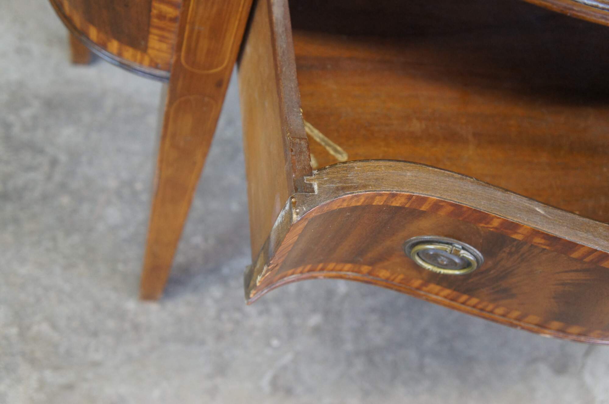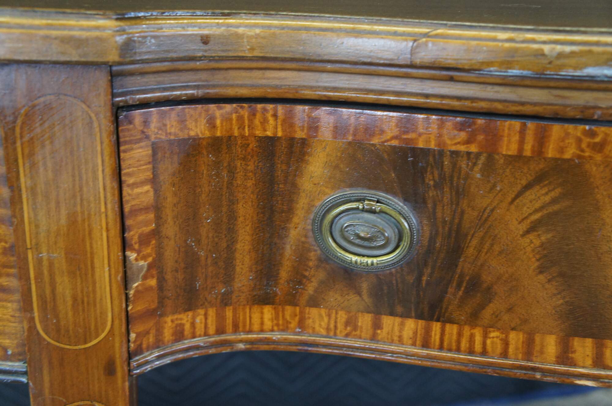 Antique Flame Mahogany console table featuring English Hepplewhite styling with serpentine form, inlaid accents and large drawer.