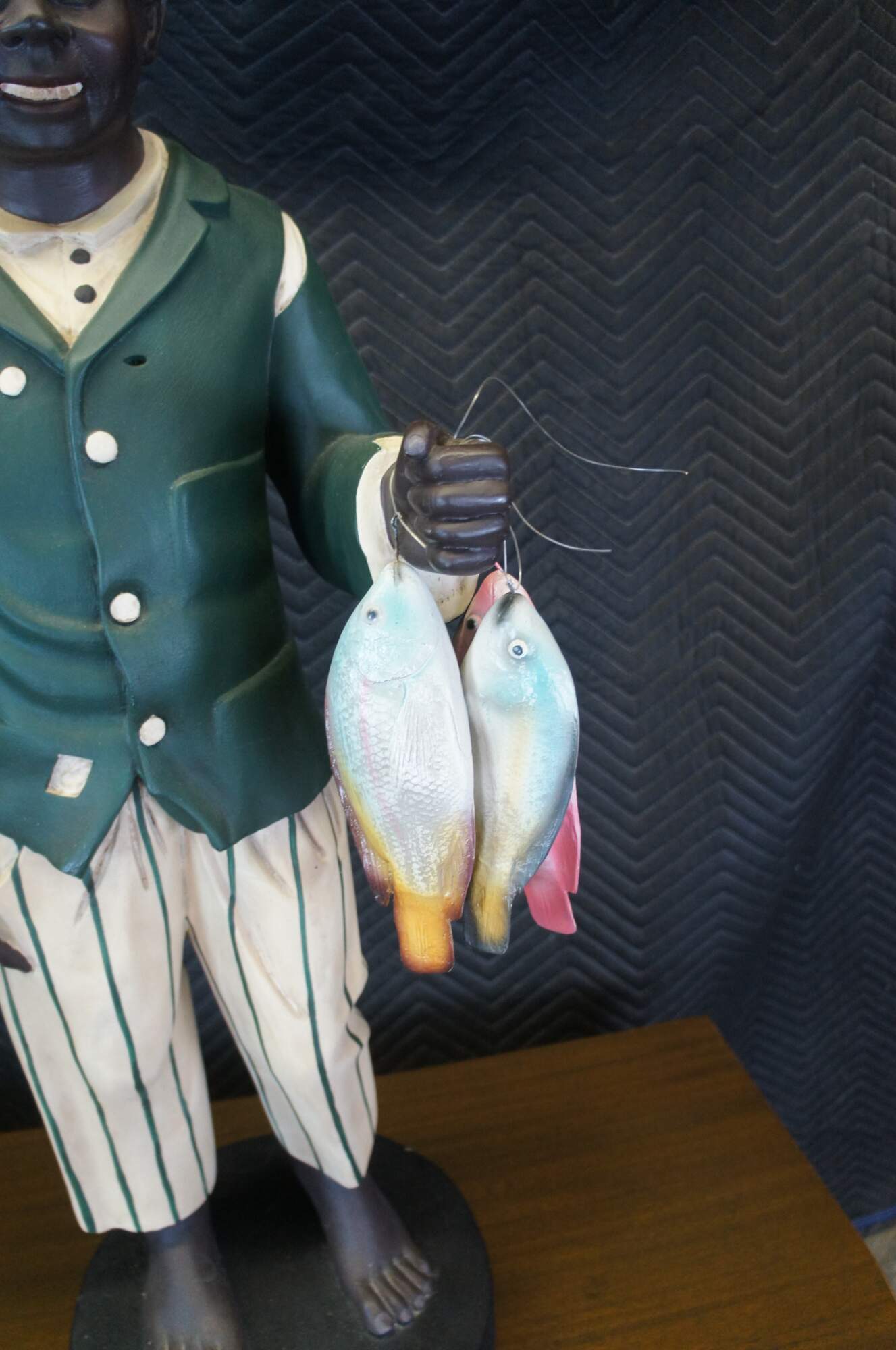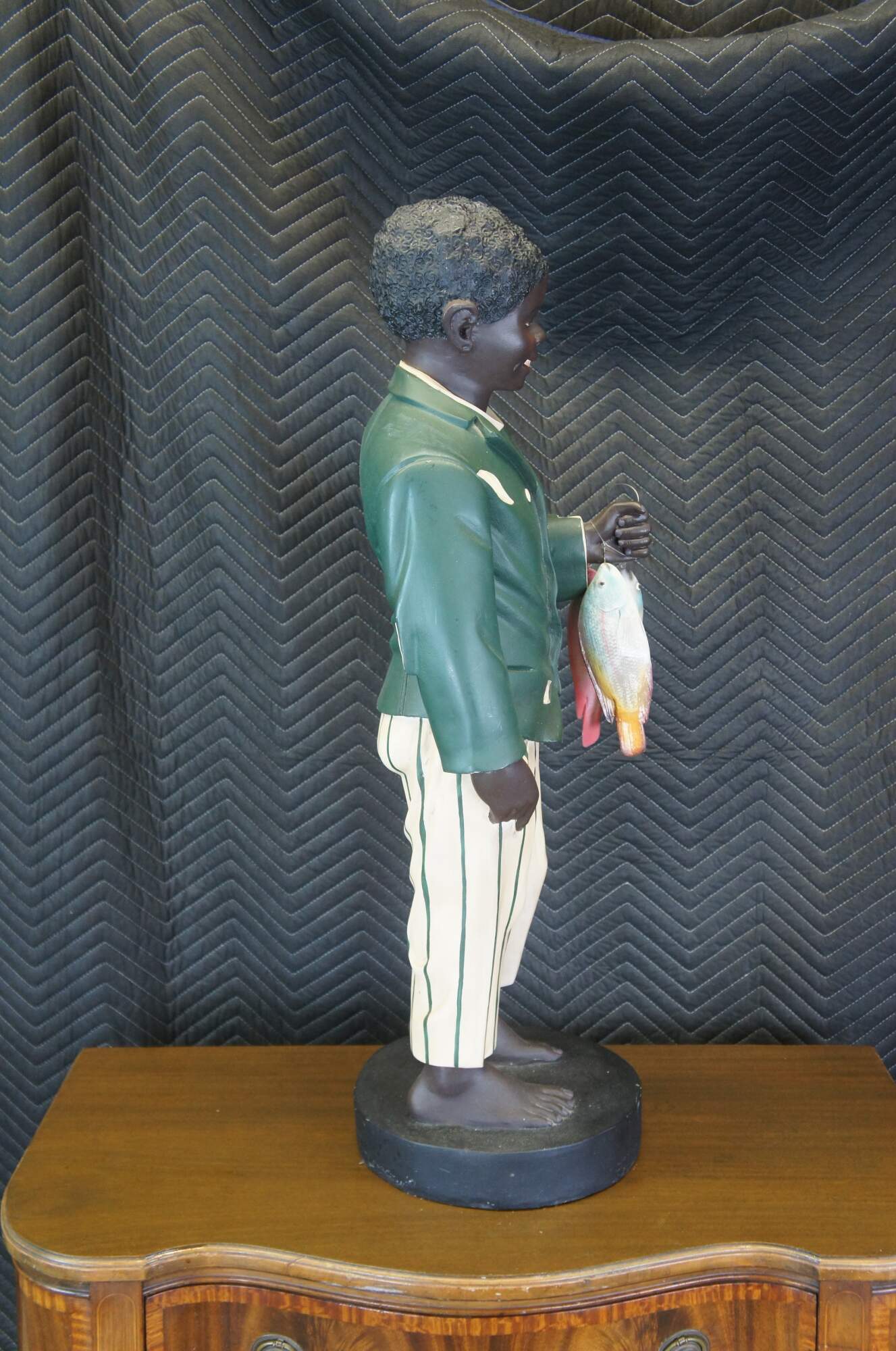 Vintage Americana figurine or statue. Made of fiberglass resin featuring a young man in formal attire, standing with the catch of the day, three fish. After Delarue Picard.