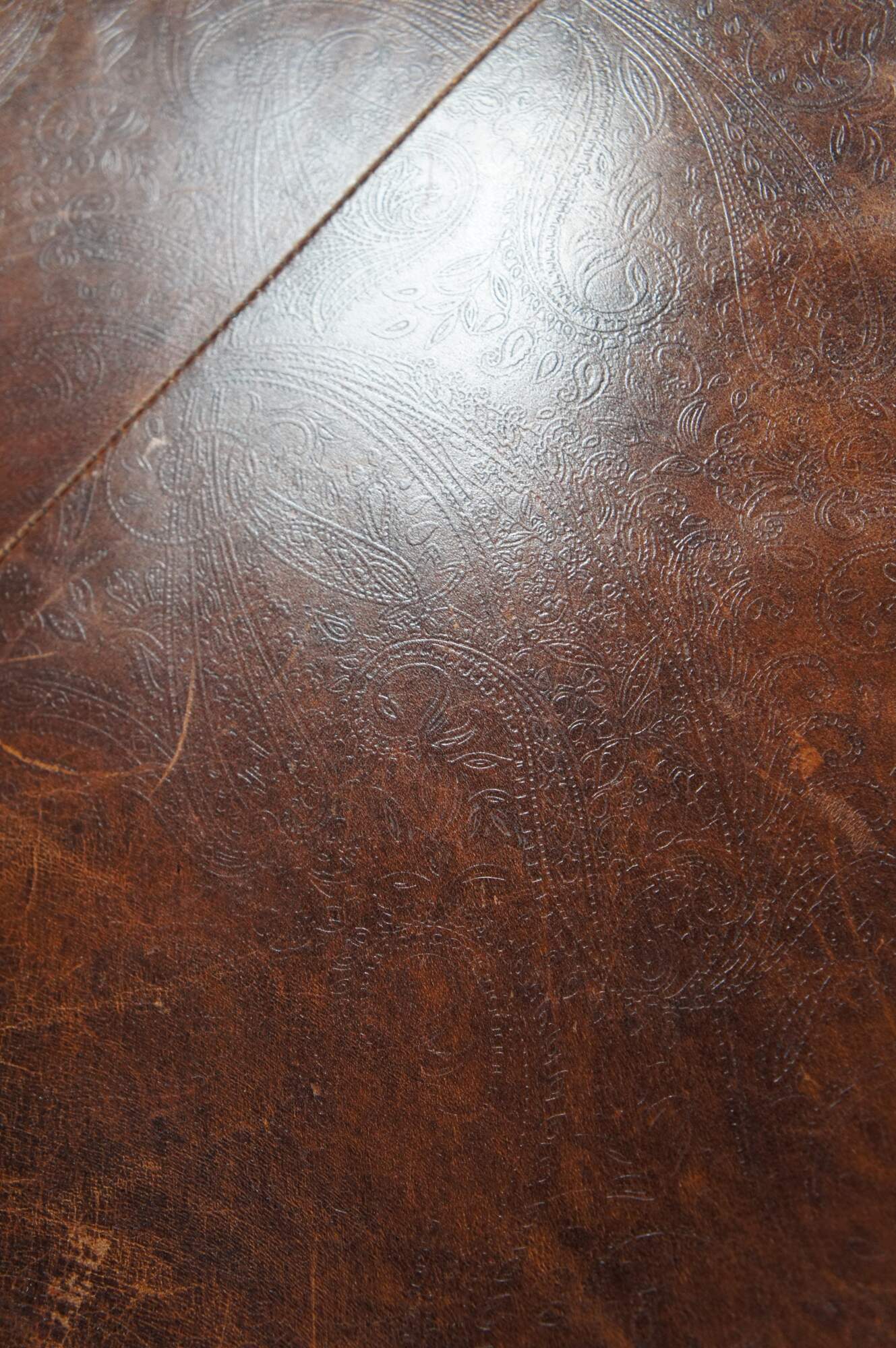 Vintage Vanguard brown leather square ottoman featuring mitered paisley and nailhead design with button tuft.