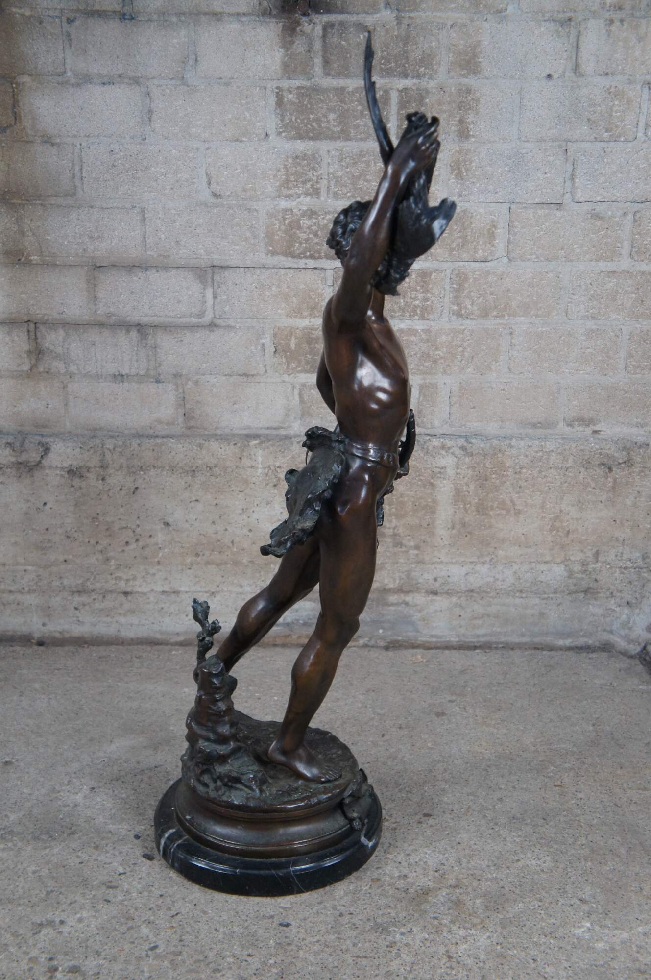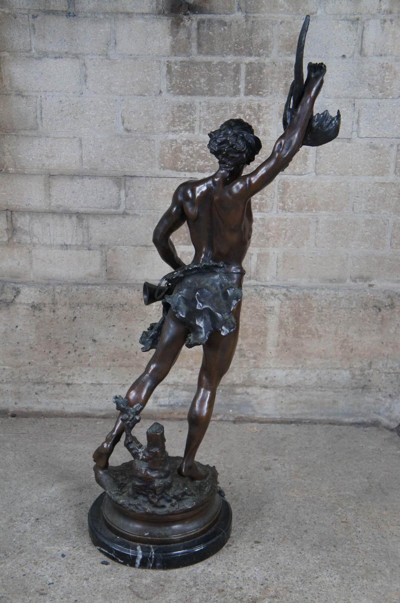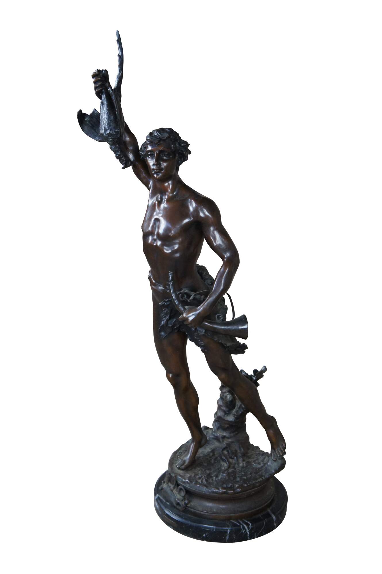 A remarkable French Bronze sculpture of Acteon by Adrein Etienne Gaudez. The statue is sculpted in lifelike detail, featuring Acteon with a bird in his outstretched arm, standing on one leg with a French horn in his other arm. Includes a neat Cartouche label surrounded by a bat and horn. The bronze is signed along the top of the base and rests on a marble plinth.
