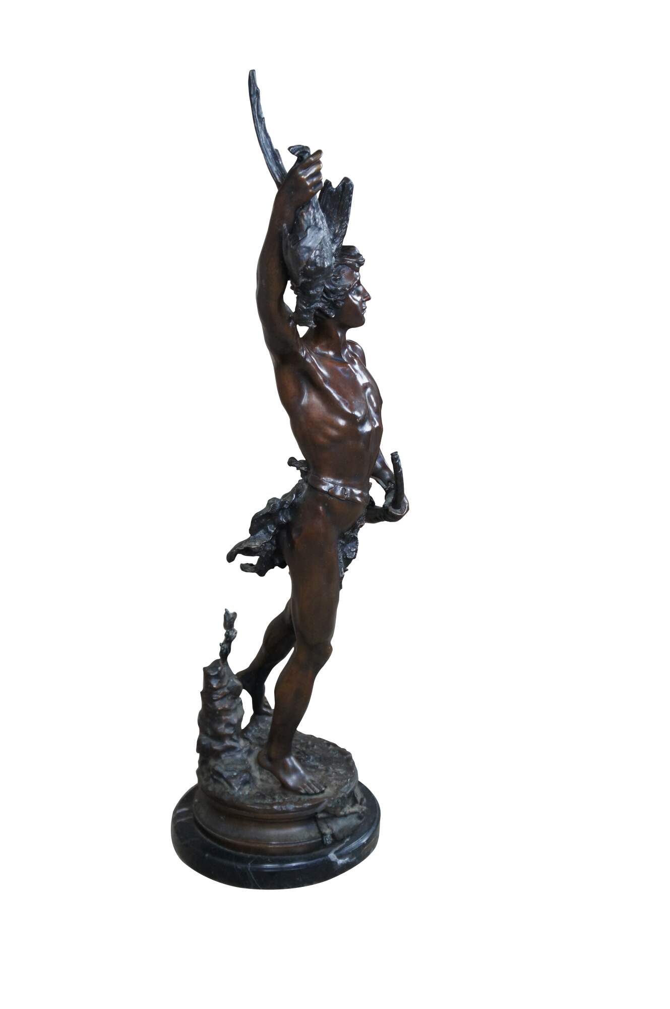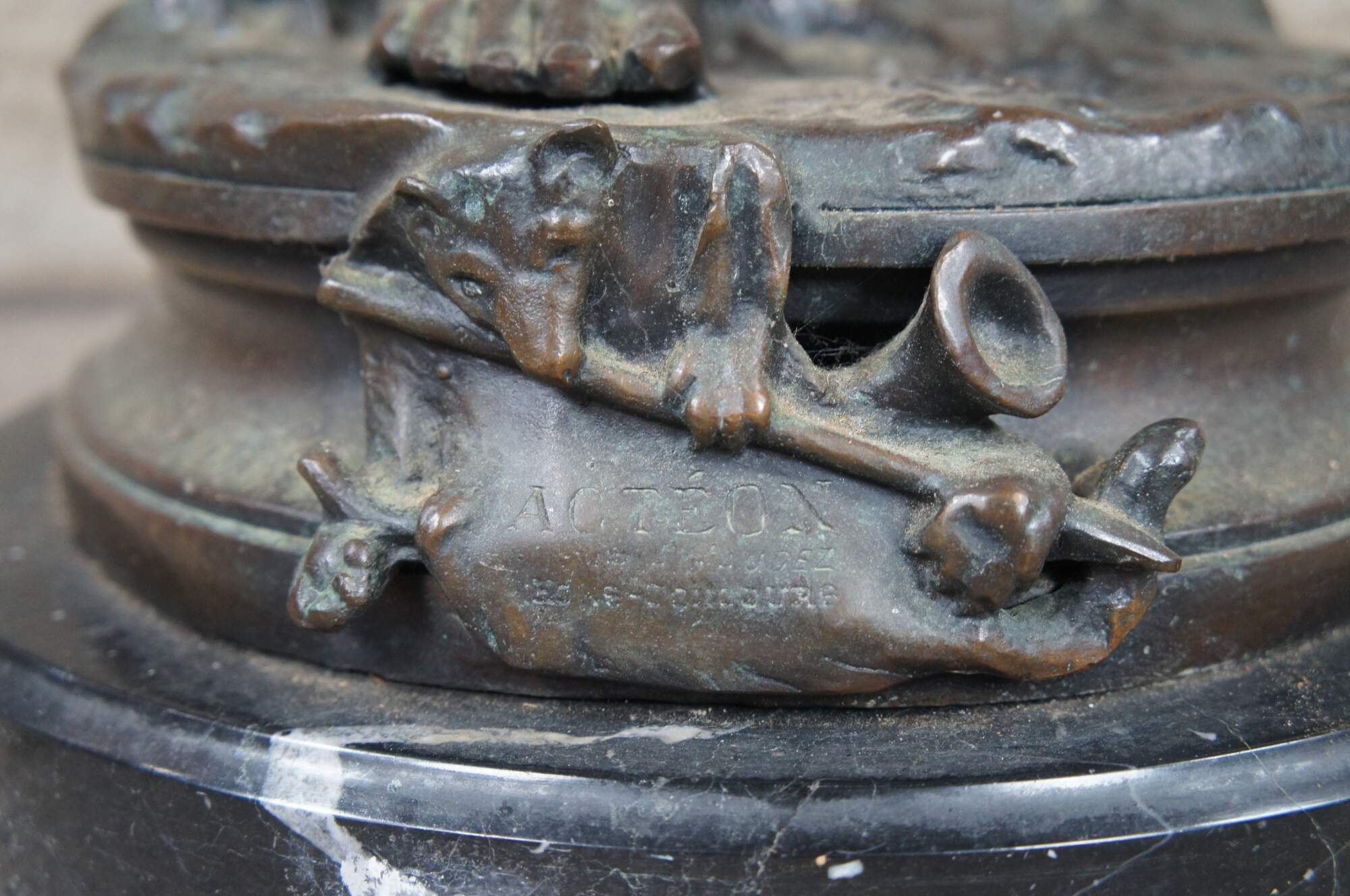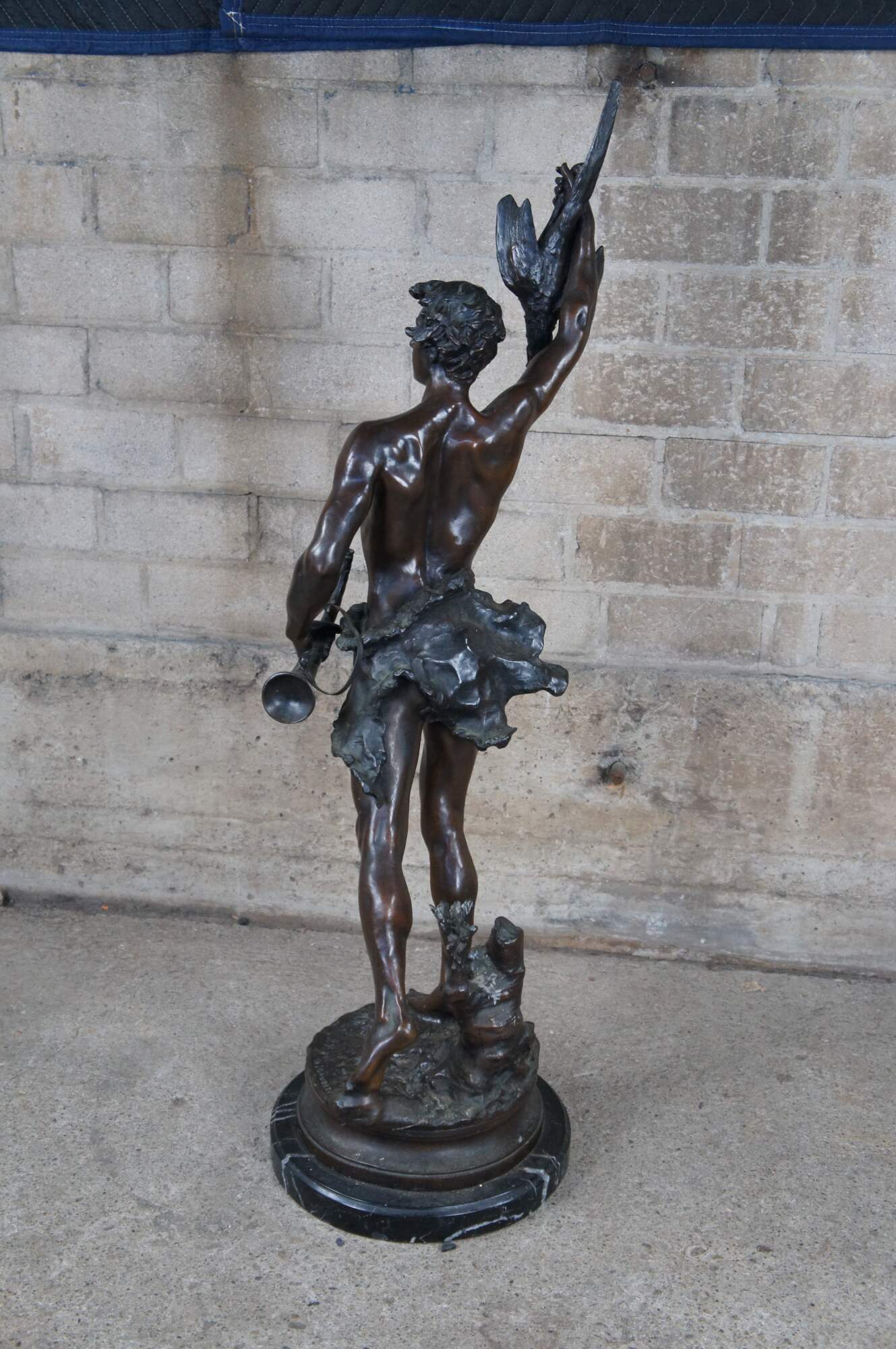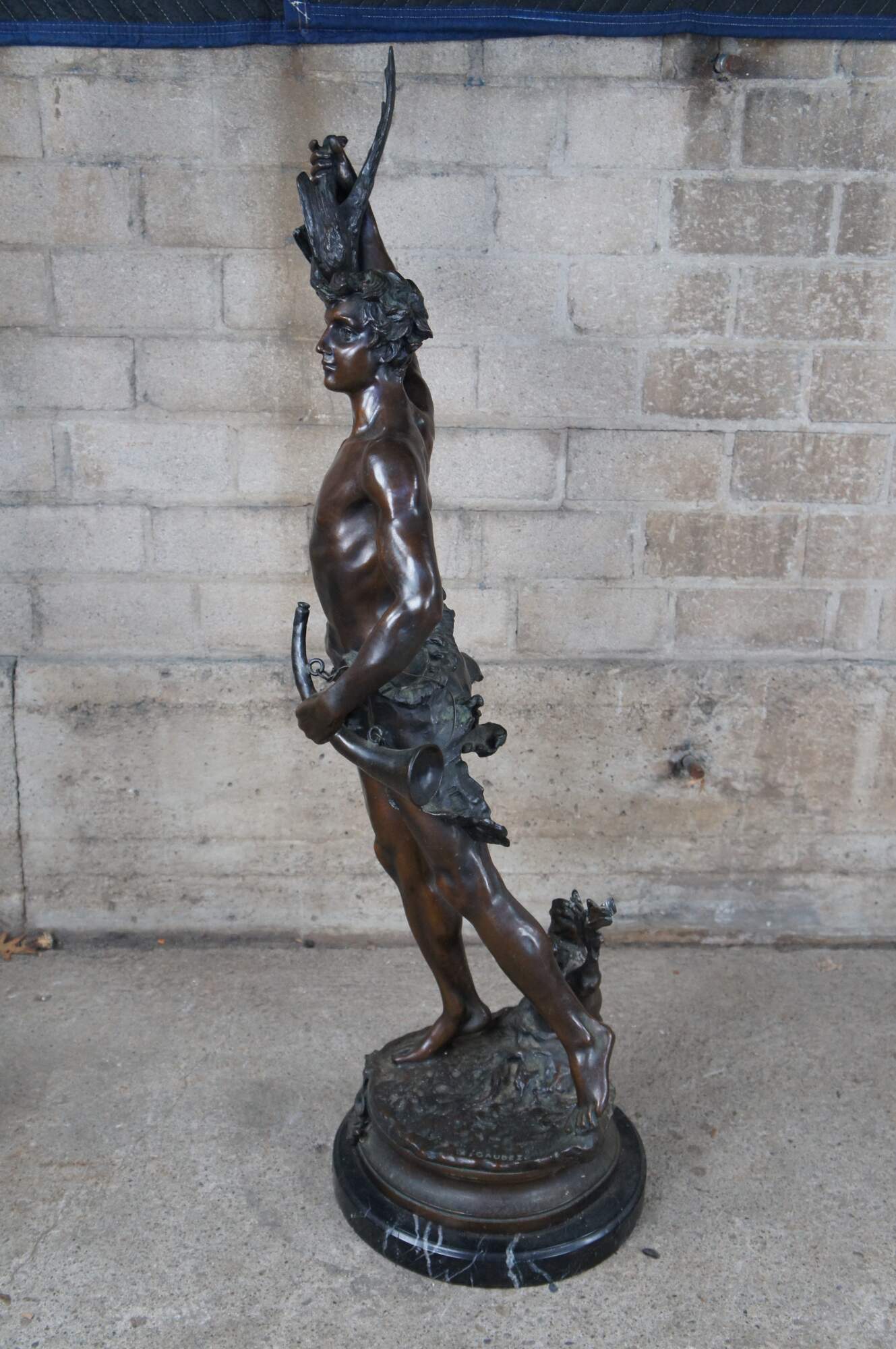 A remarkable French Bronze sculpture of Acteon by Adrein Etienne Gaudez. The statue is sculpted in lifelike detail, featuring Acteon with a bird in his outstretched arm, standing on one leg with a French horn in his other arm. Includes a neat Cartouche label surrounded by a bat and horn. The bronze is signed along the top of the base and rests on a marble plinth.