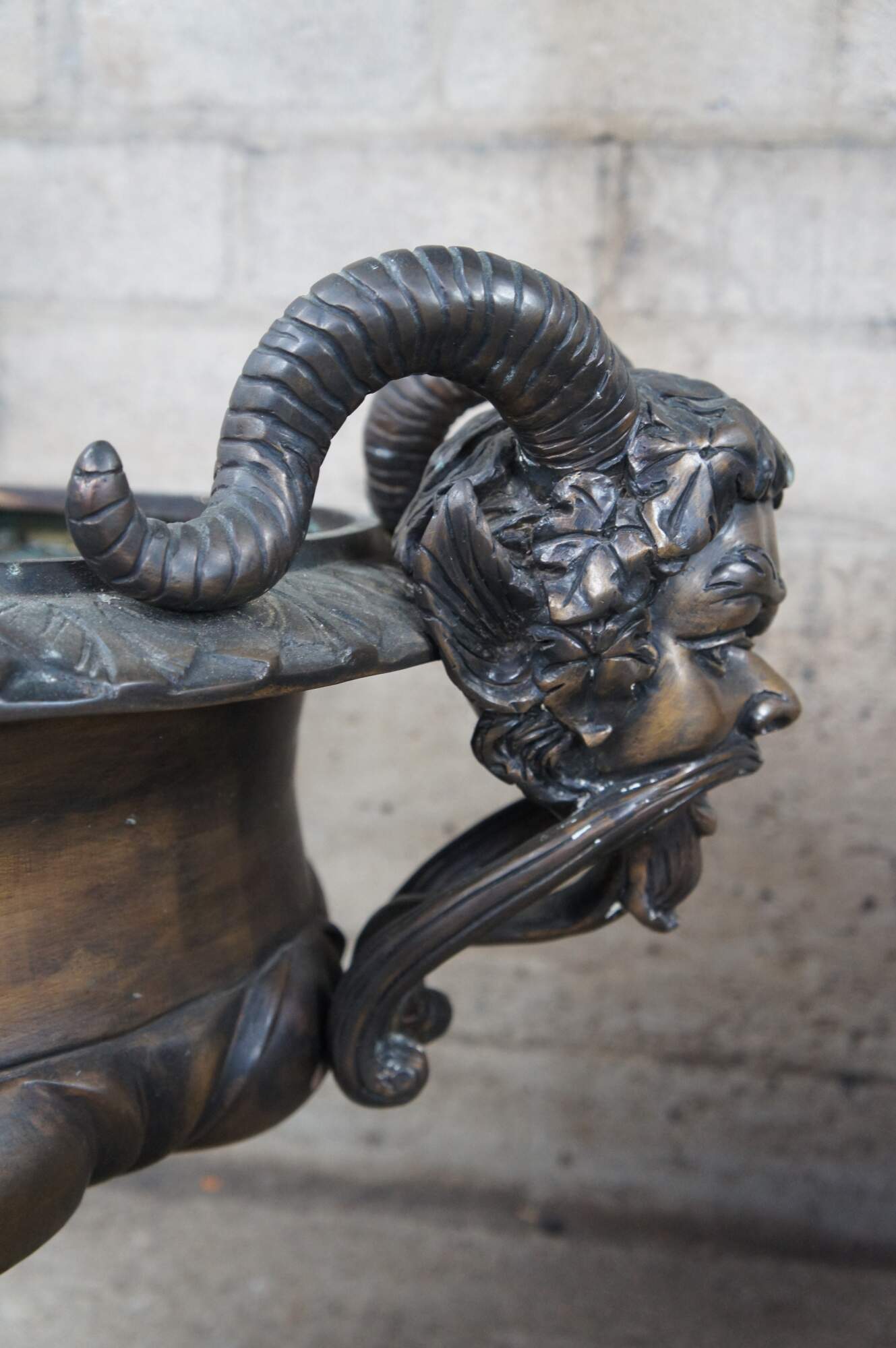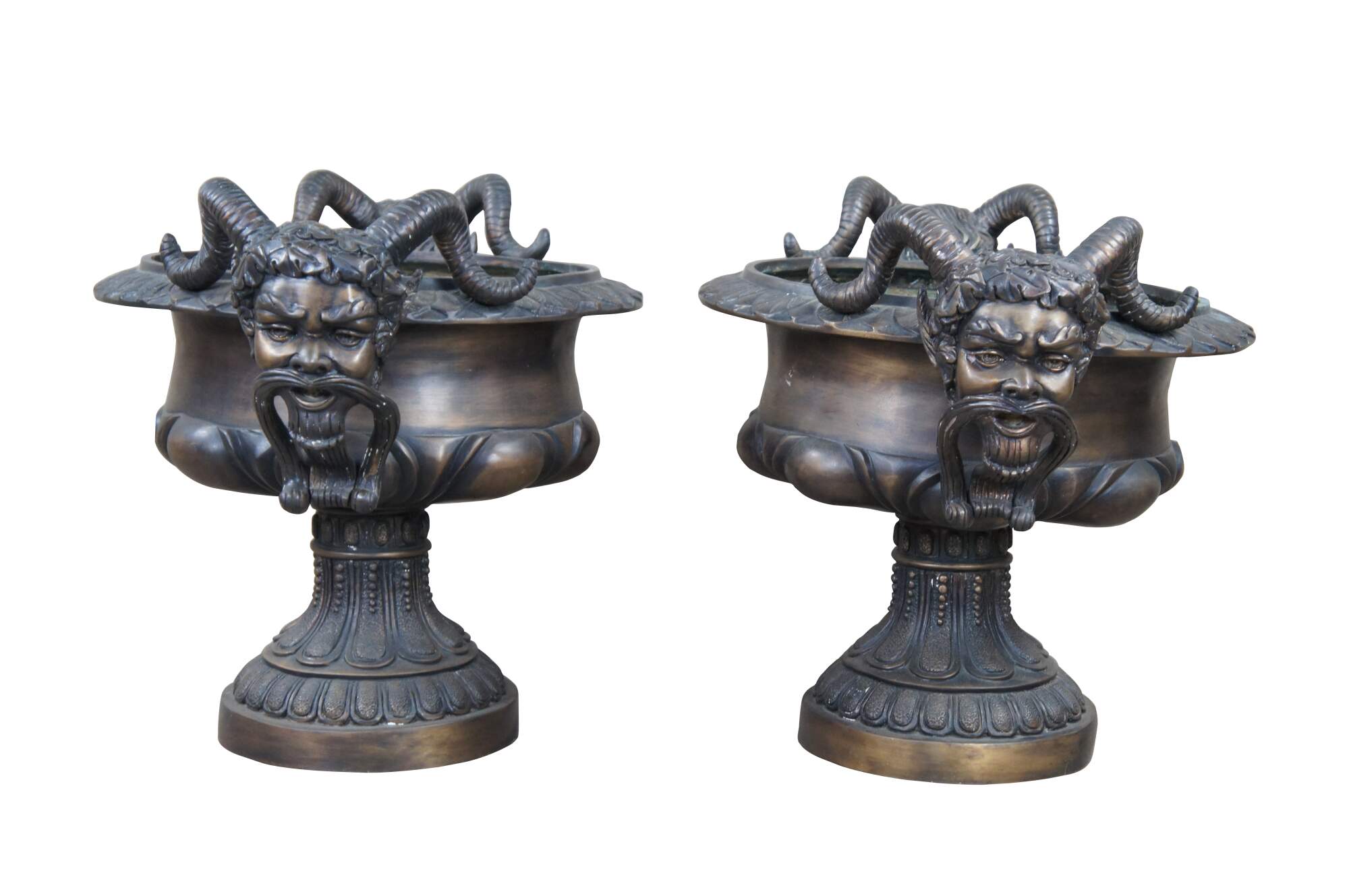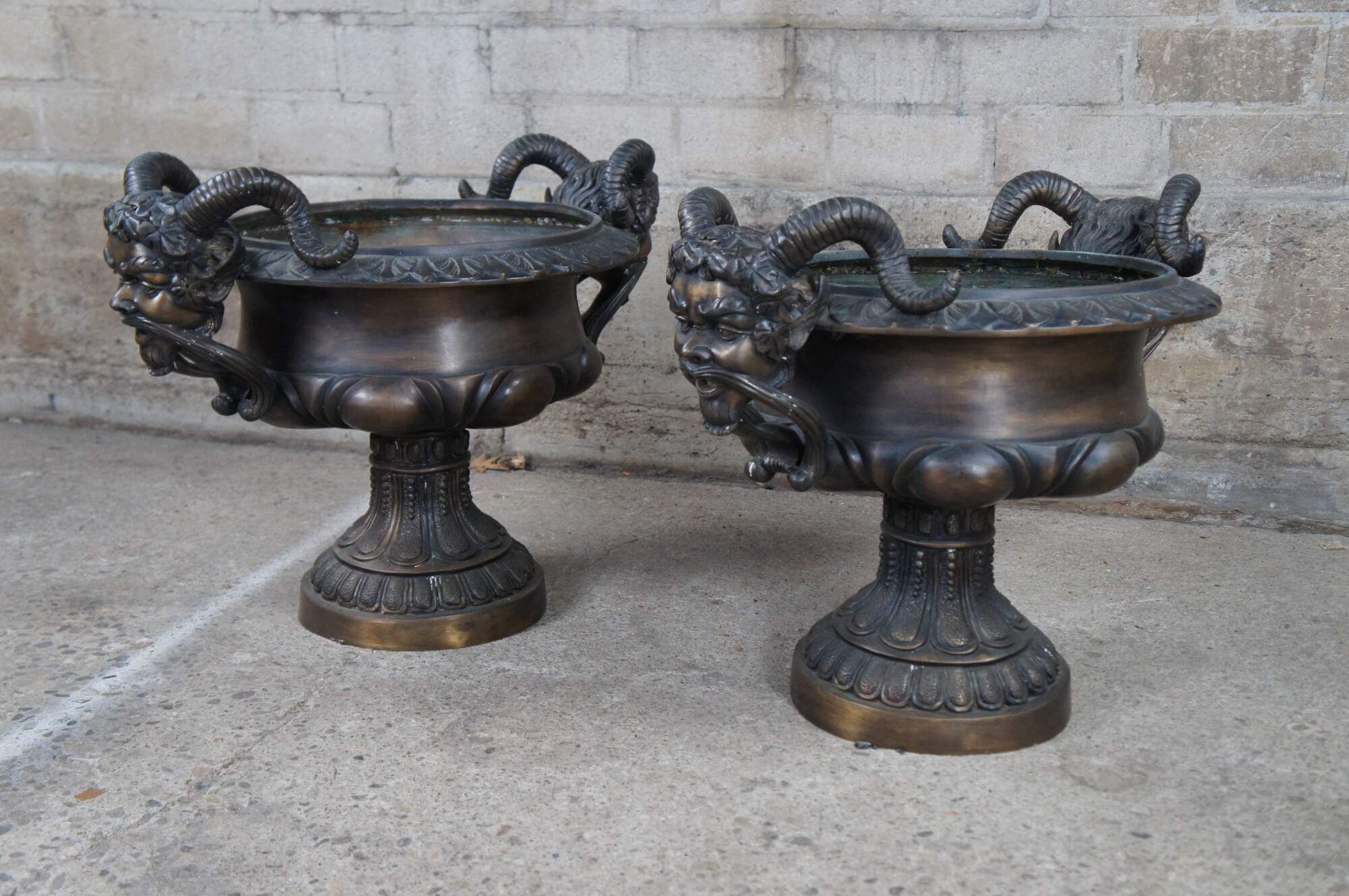 Exceptional set of footed bronze tazza urns. Features traditional Grecian form with gadrooned body and flared mouth with leaf trim. The urn is flanked on each side with magnificent figural Bacchus handles. He is poised with an open mouth, long goatee, serpentine ram horns and hair made from grape leaves.