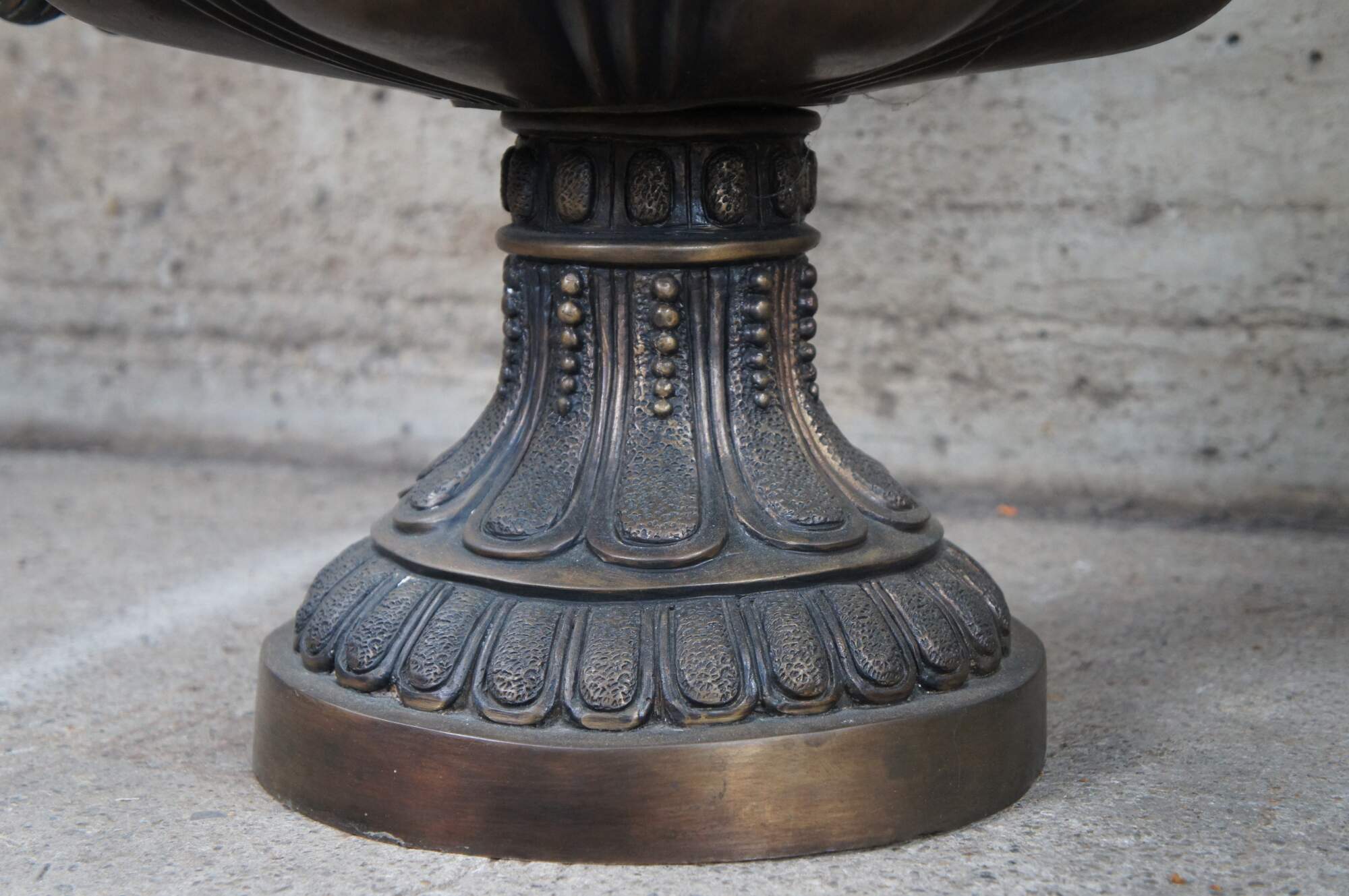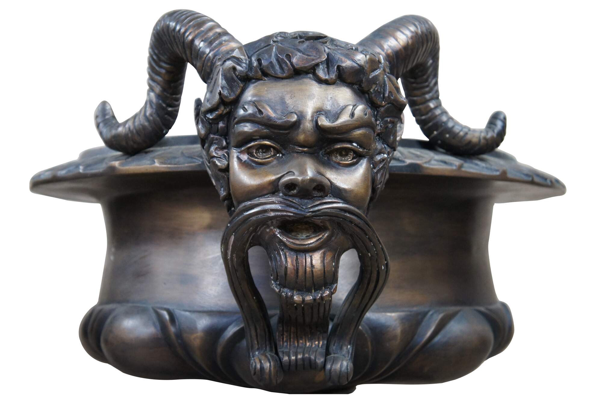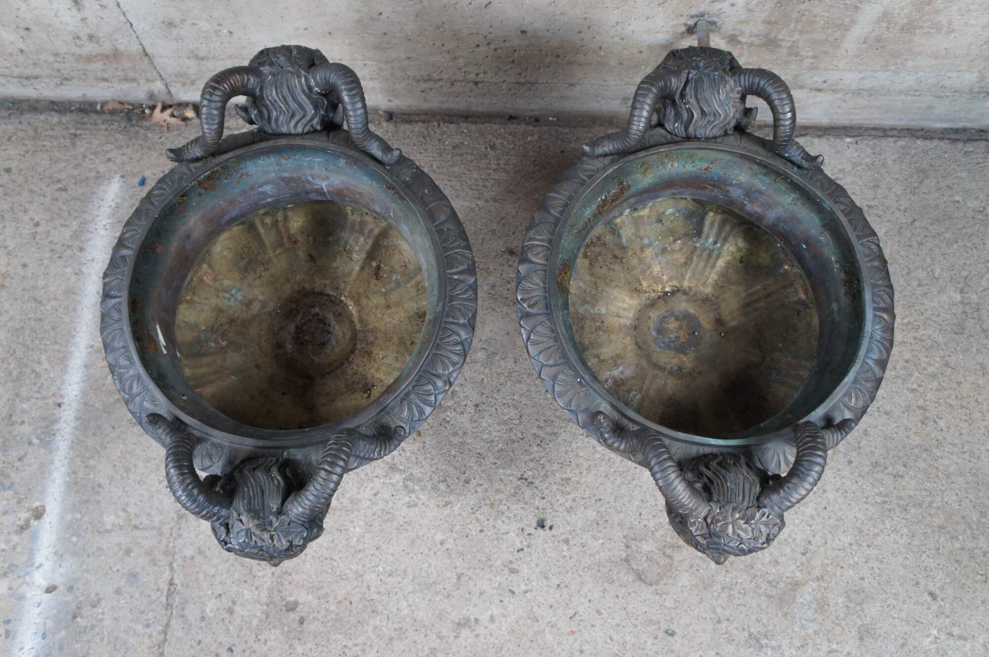 Exceptional set of footed bronze tazza urns. Features traditional Grecian form with gadrooned body and flared mouth with leaf trim. The urn is flanked on each side with magnificent figural Bacchus handles. He is poised with an open mouth, long goatee, serpentine ram horns and hair made from grape leaves.