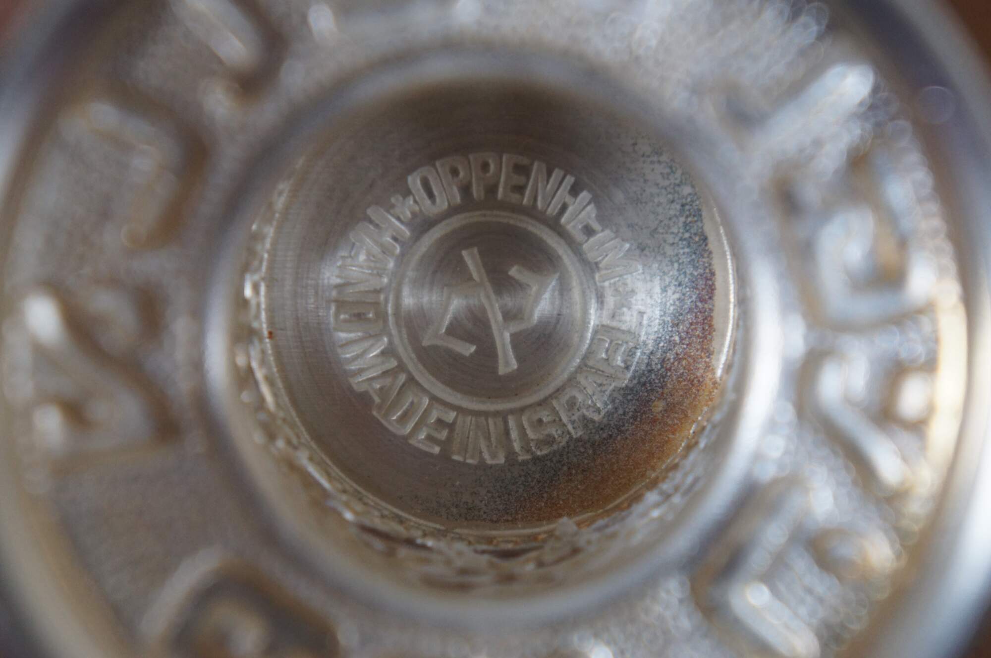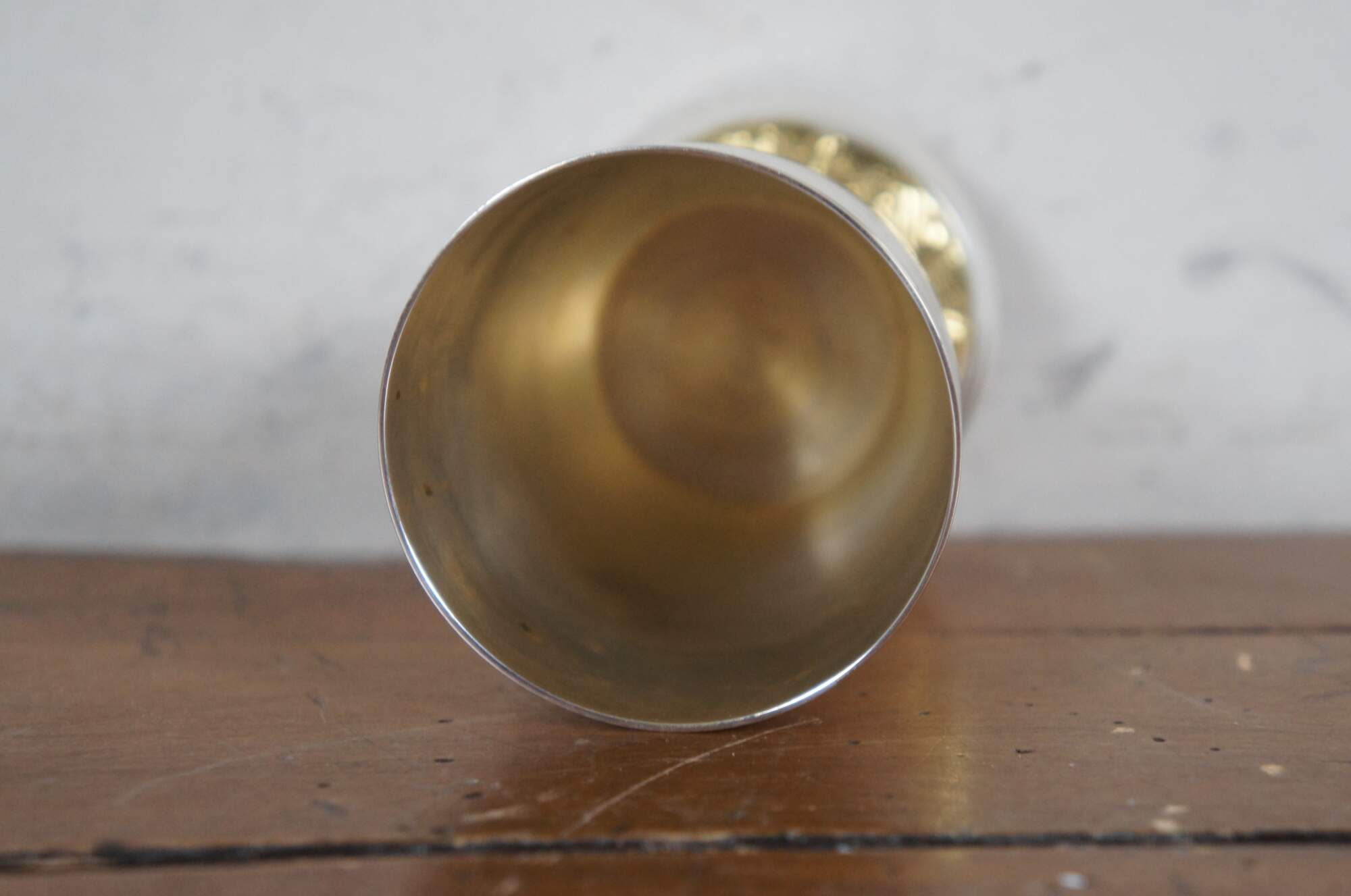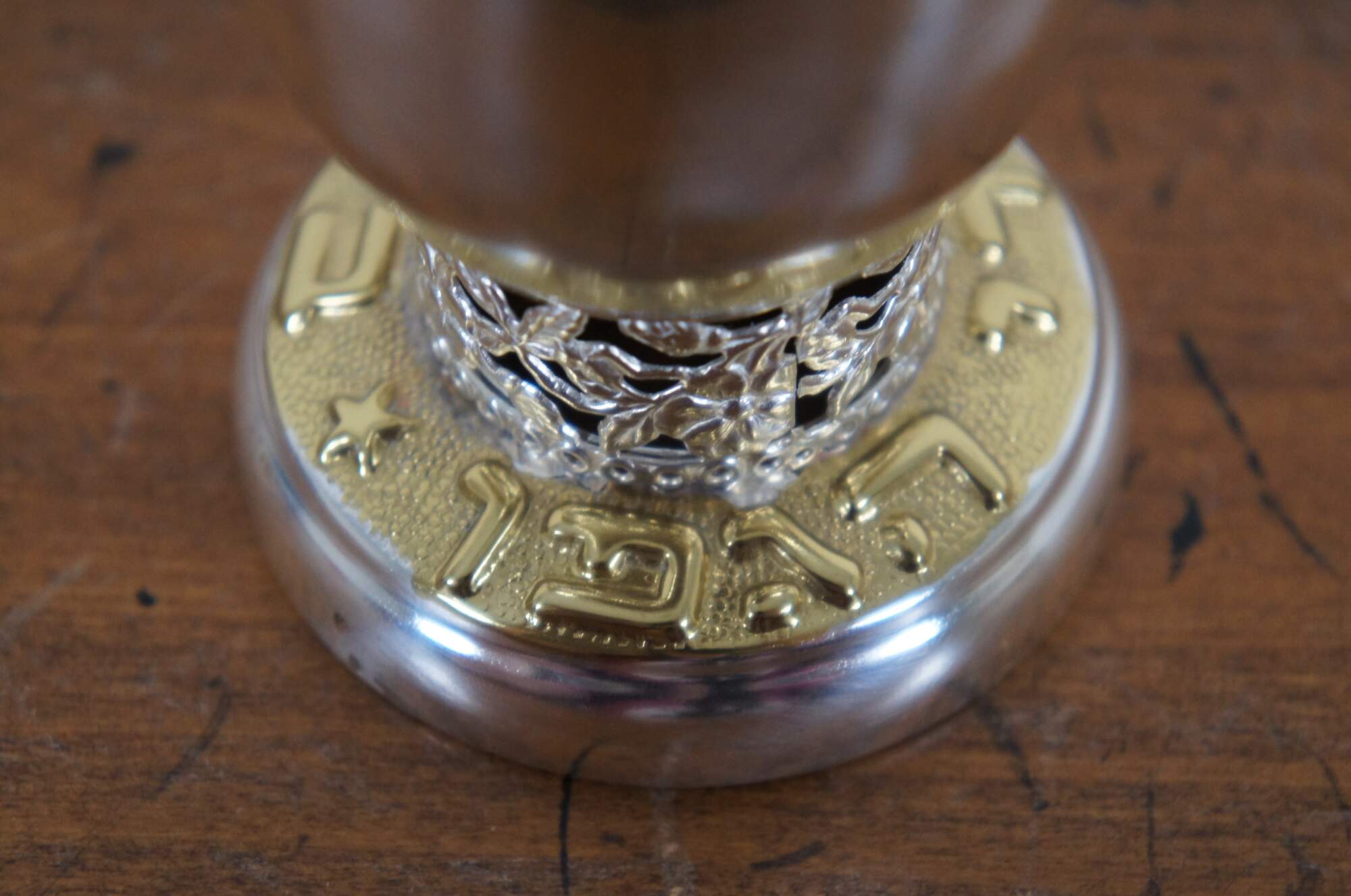 Late 20th century Oppenheim silver plate kiddush cup / goblet with pierced floral collar and band of gilt lettering around the base. Made in Israel.