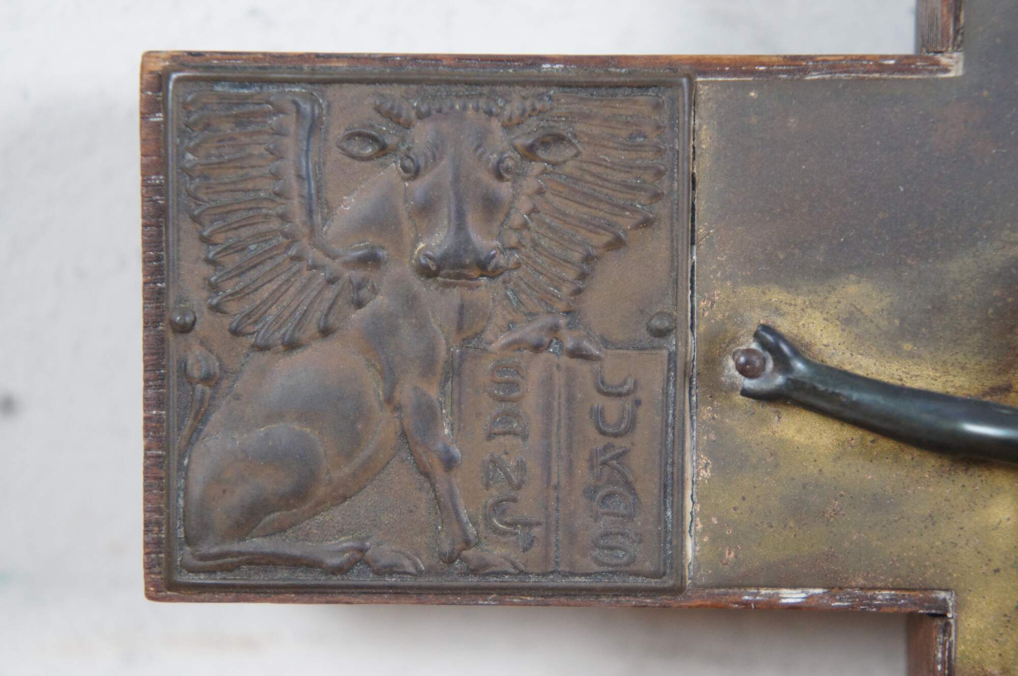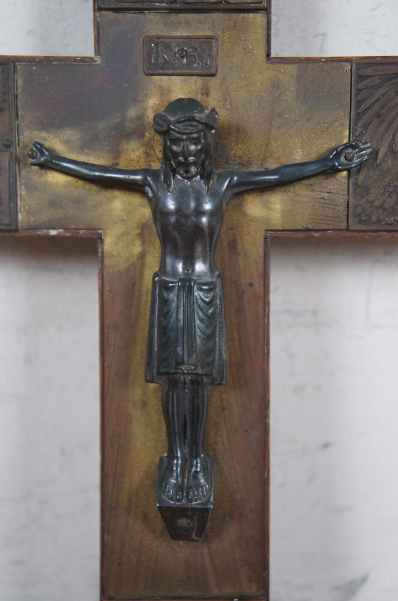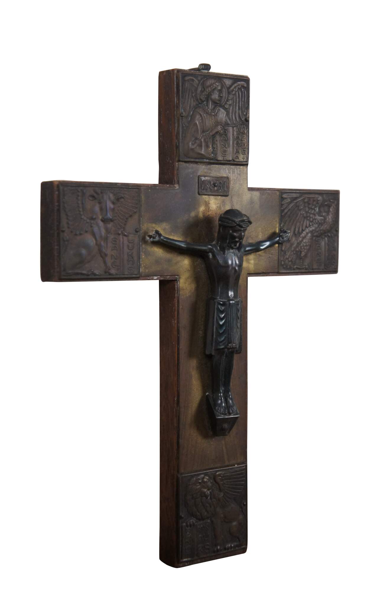 Circa mid 20th century tetramorph crucifix. Wood base overlaid with embossed brass plates representing the Four Evangelists - Mathaeus, Markus, Lukas, and Johannes- the authors attributed to the four Gospels in the Christian Bible. Matthew is represented with a winged man, Luke a winged bull, Mark a winged lion, and John an eagle. These images surround the traditional crucified body of Jesus and INRI plaque.
