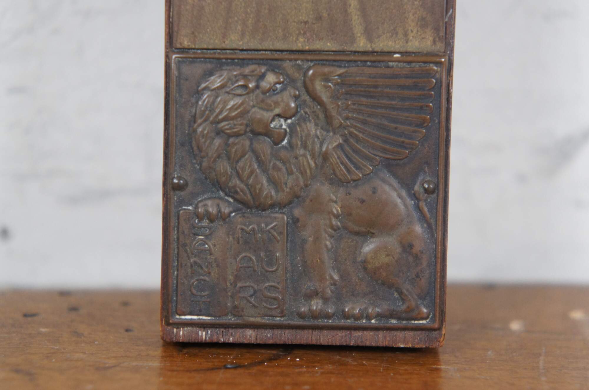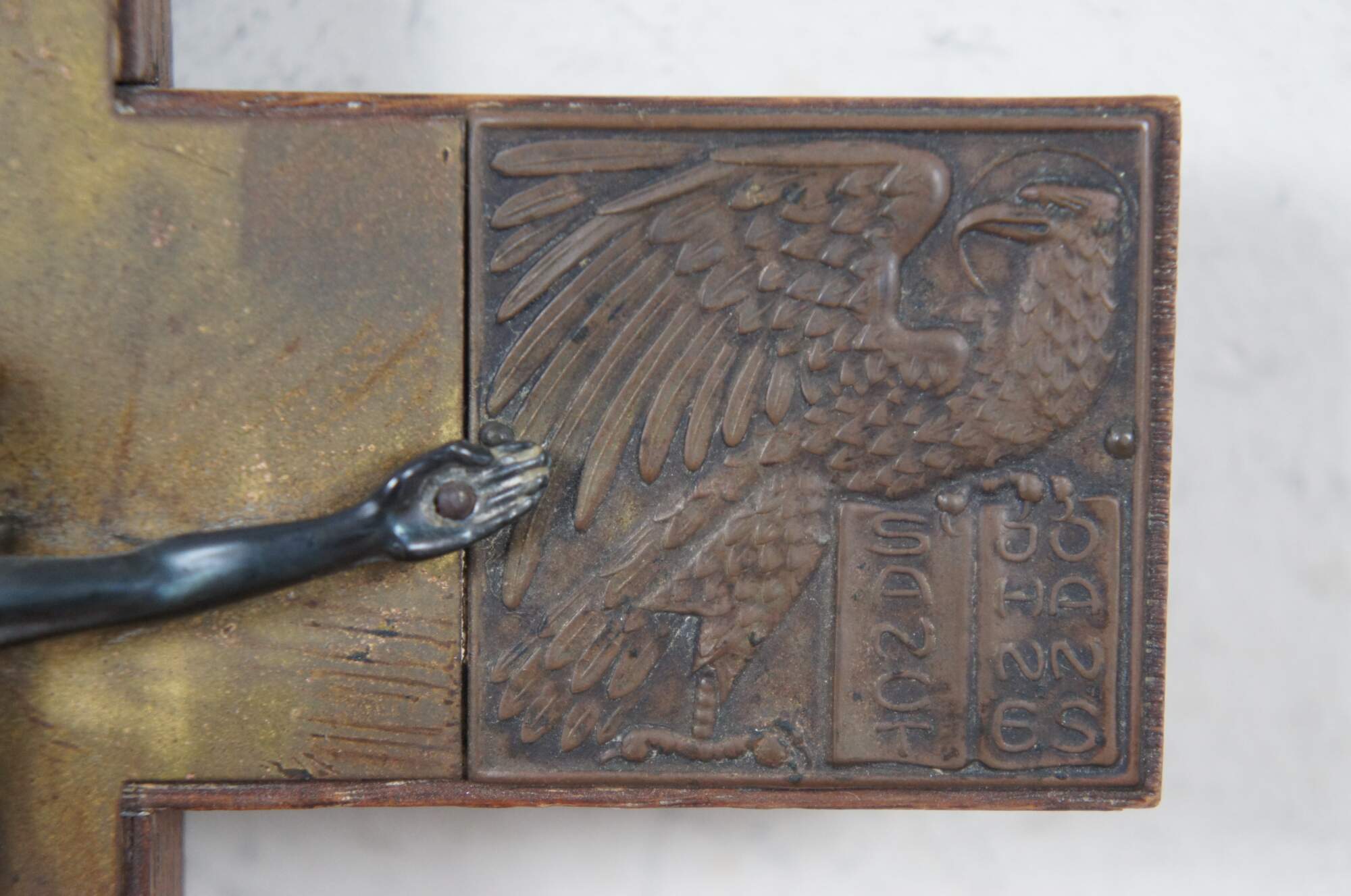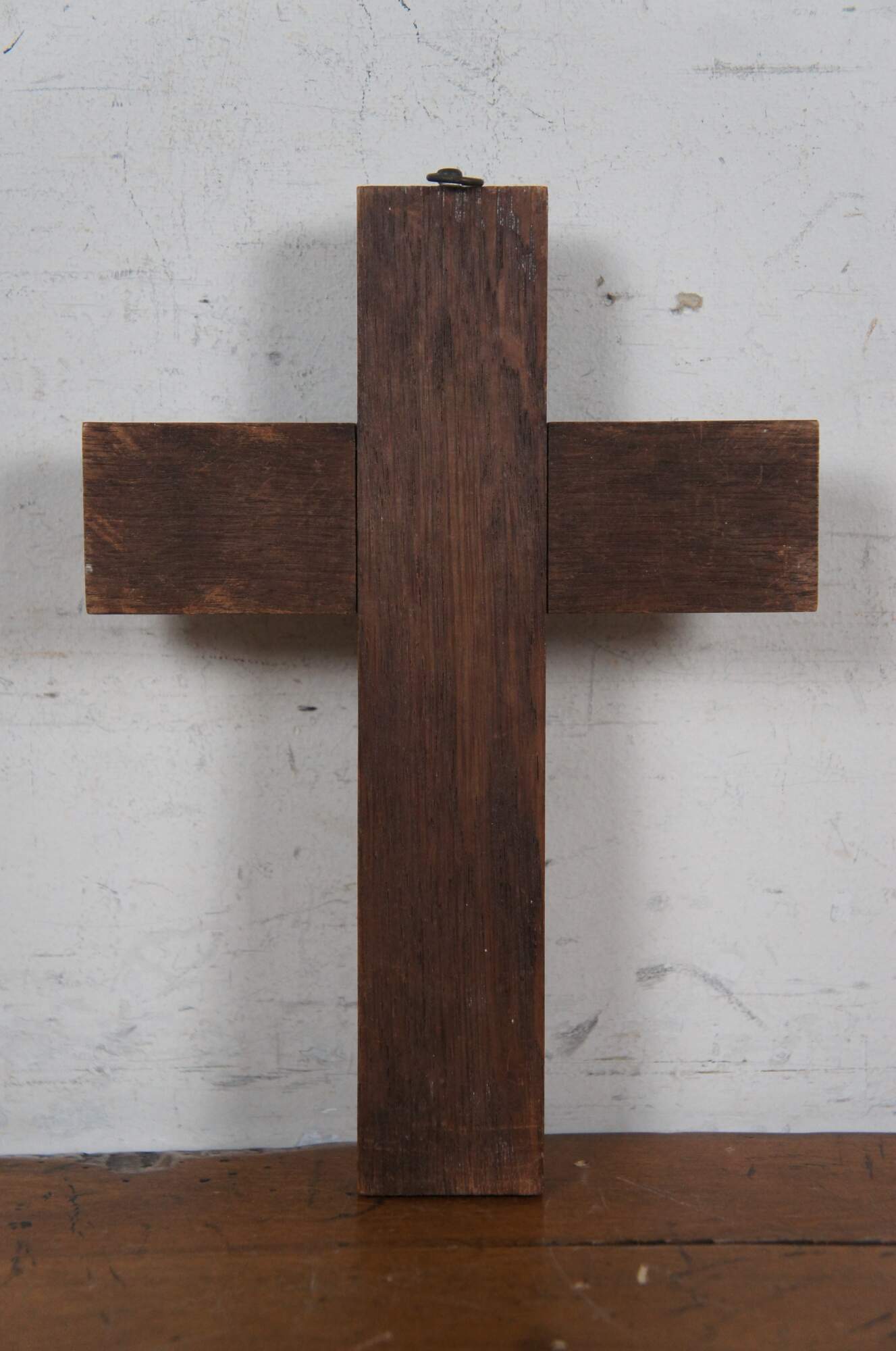Circa mid 20th century tetramorph crucifix. Wood base overlaid with embossed brass plates representing the Four Evangelists - Mathaeus, Markus, Lukas, and Johannes- the authors attributed to the four Gospels in the Christian Bible. Matthew is represented with a winged man, Luke a winged bull, Mark a winged lion, and John an eagle. These images surround the traditional crucified body of Jesus and INRI plaque.