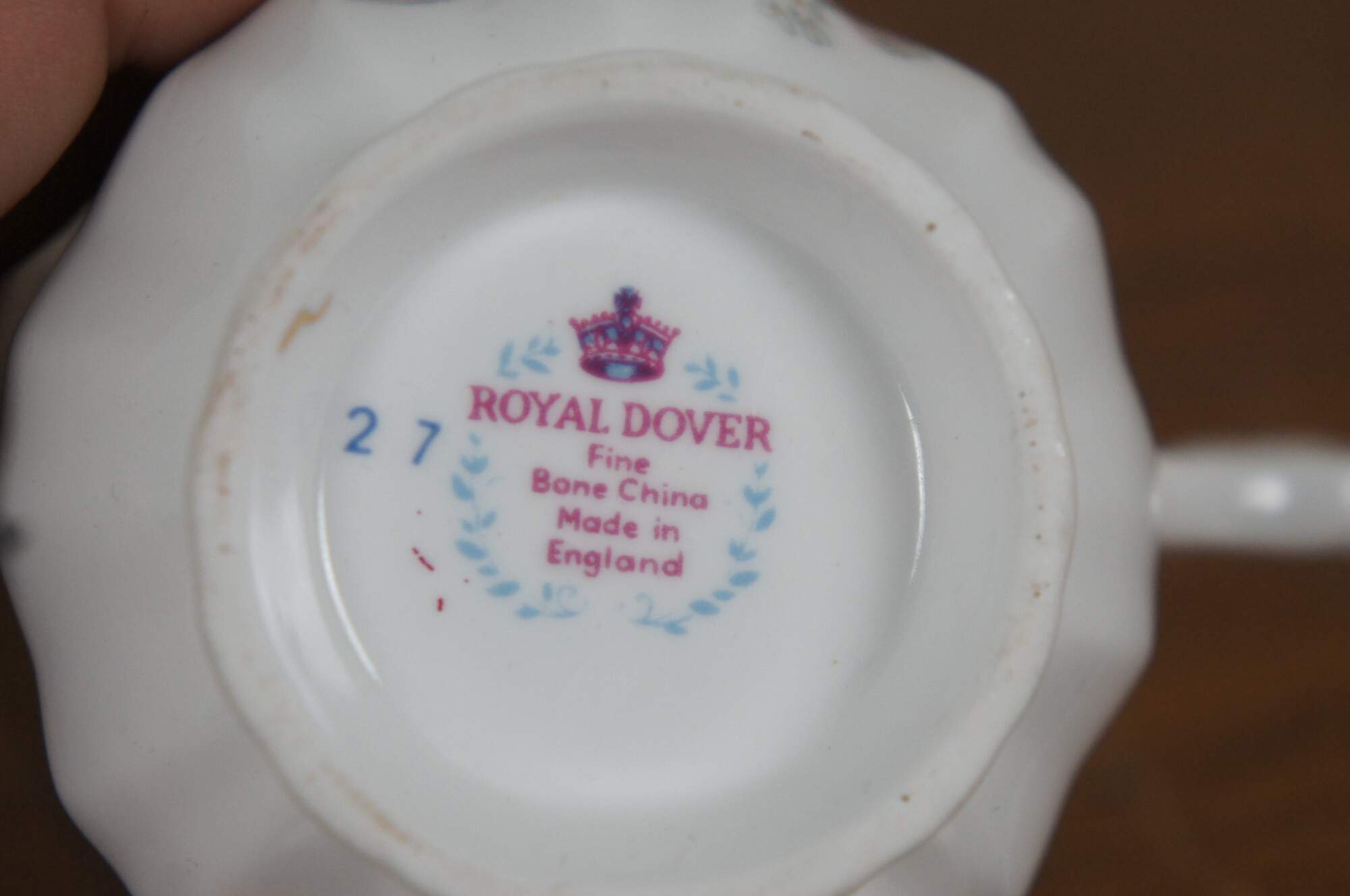 Circa mid 20th century porcelain teacup and saucer by Royal Dover, item number 27. Made in England. Lightly scalloped design with gilt details and litho print motif of male and female cardinals on branches.