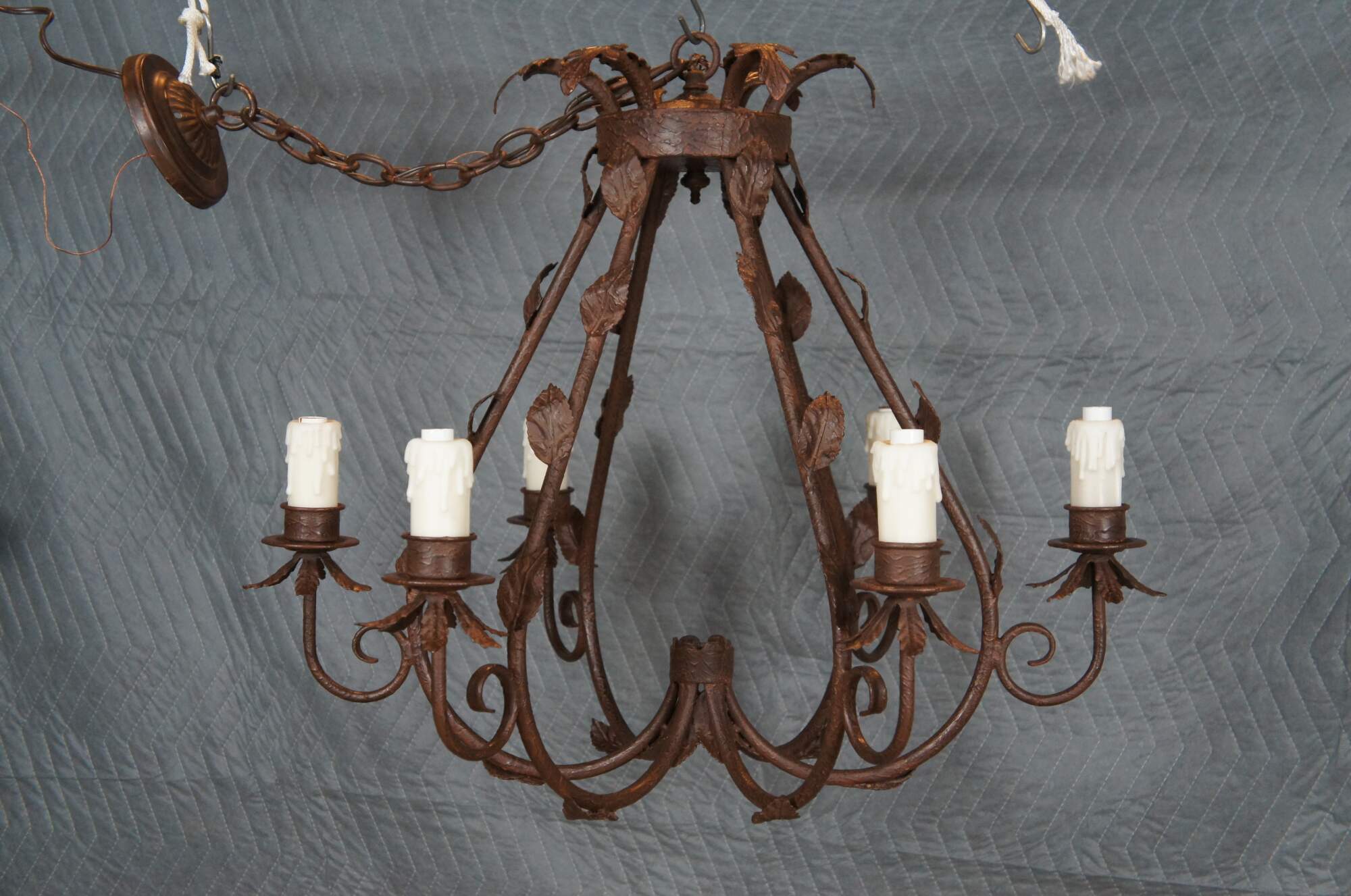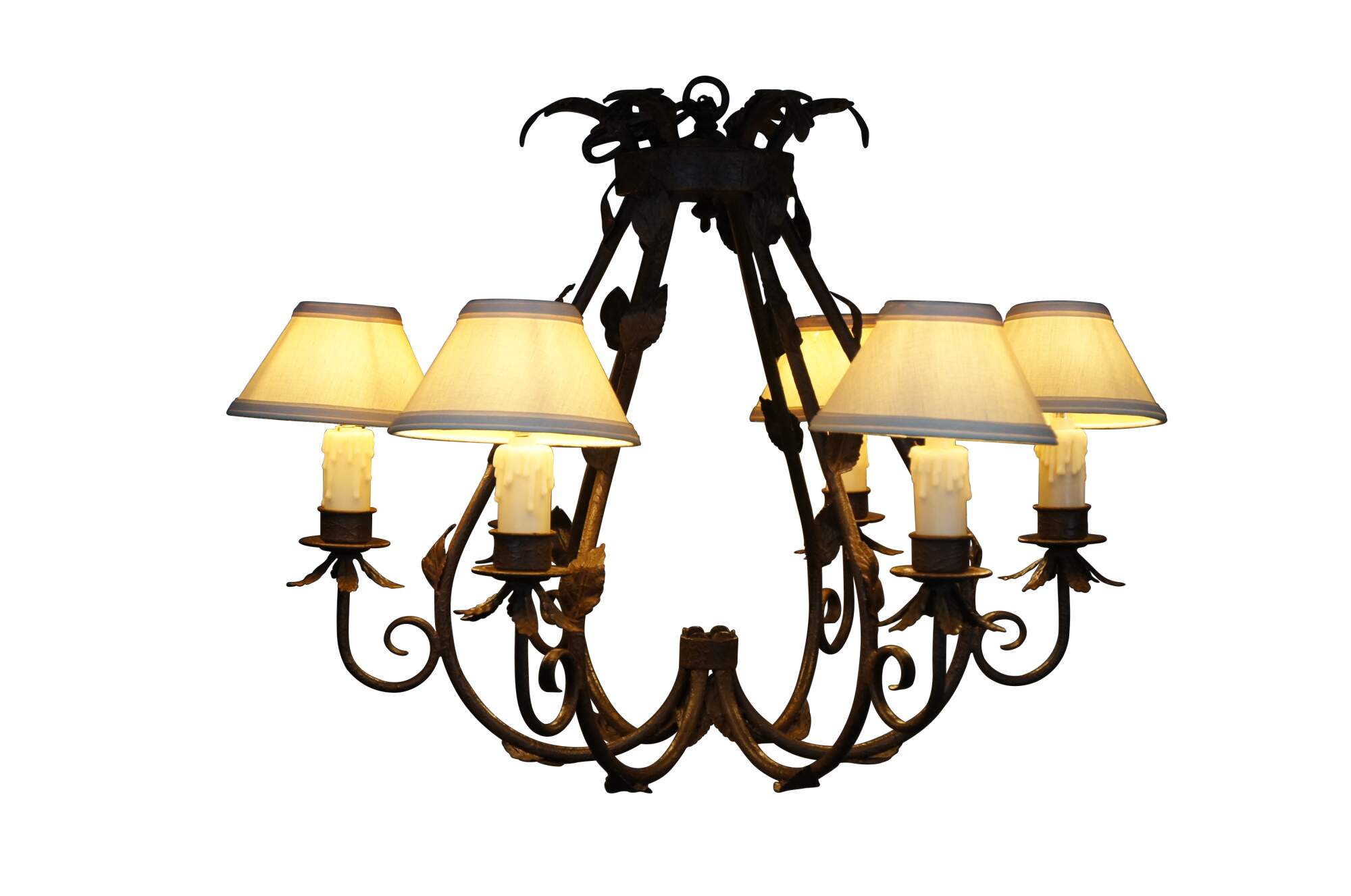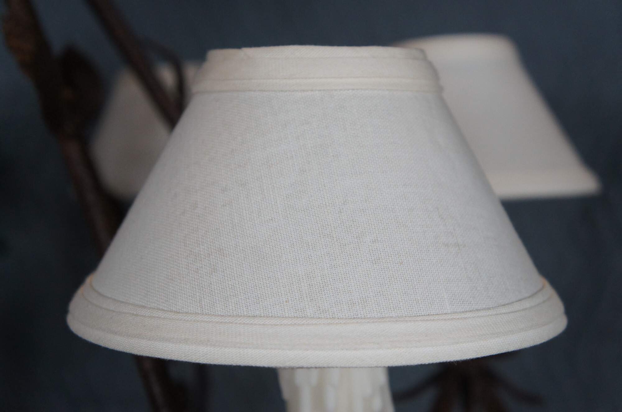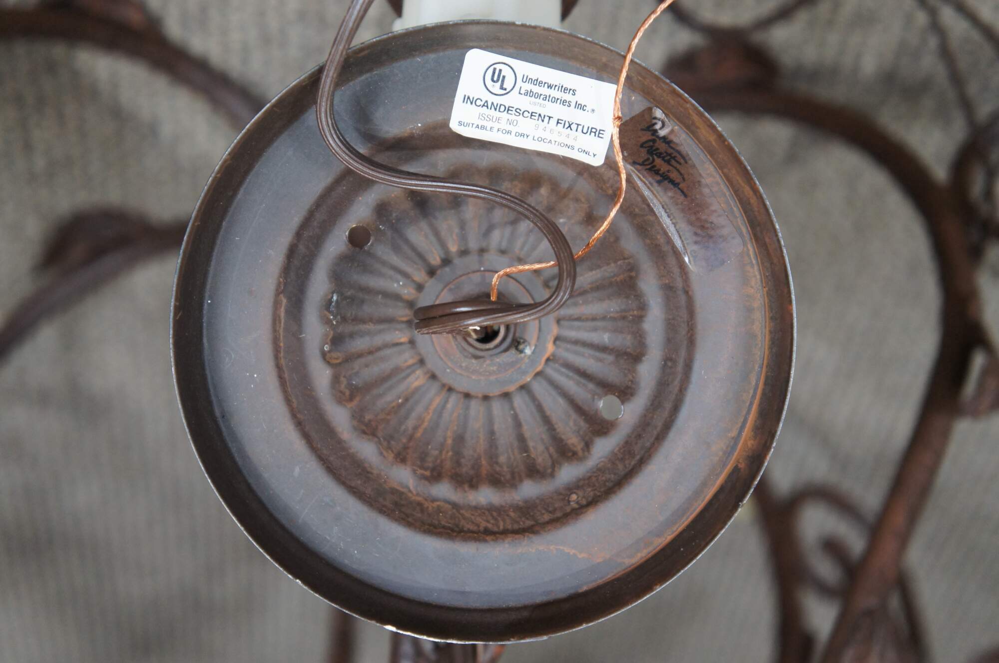 Late 20th century scrolled iron 6 arm chandelier by Dana Creath Designs. Cage like shape of six scrolling arms decorated with acnthus leaves, terminating in wax faux candles. Rough bronze finish. Includes white fabric shades. Hard wired.